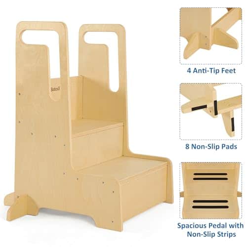 1. Doble garantía de seguridad Nuestro taburete infantil incluye 4 piezas de pequeños tapetes antideslizantes para los pies inferiores y 4 piezas de grandes tapetes antideslizantes para la superficie superior. Los tapetes antideslizantes pueden aumentar la fricción y proteger el suelo, evitando que su hijo se resbale. Las asas de transporte del taburete son cómodas para las manos de los niños. Es ligero para que los niños lo levanten y lo muevan por cualquier parte de la casa.