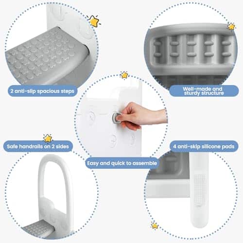 4. Ligero y fácil de montar: El taburete para niños en el baño pesa solo 6 LB, los niños pueden moverlo por toda la casa. Este taburete para niños es fácil de ensamblar lados y escalones con tornillos de plástico, solo toma unos 5 minutos terminar el ensamblaje. Además, el taburete es fácil de limpiar y duradero para uso diario.