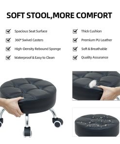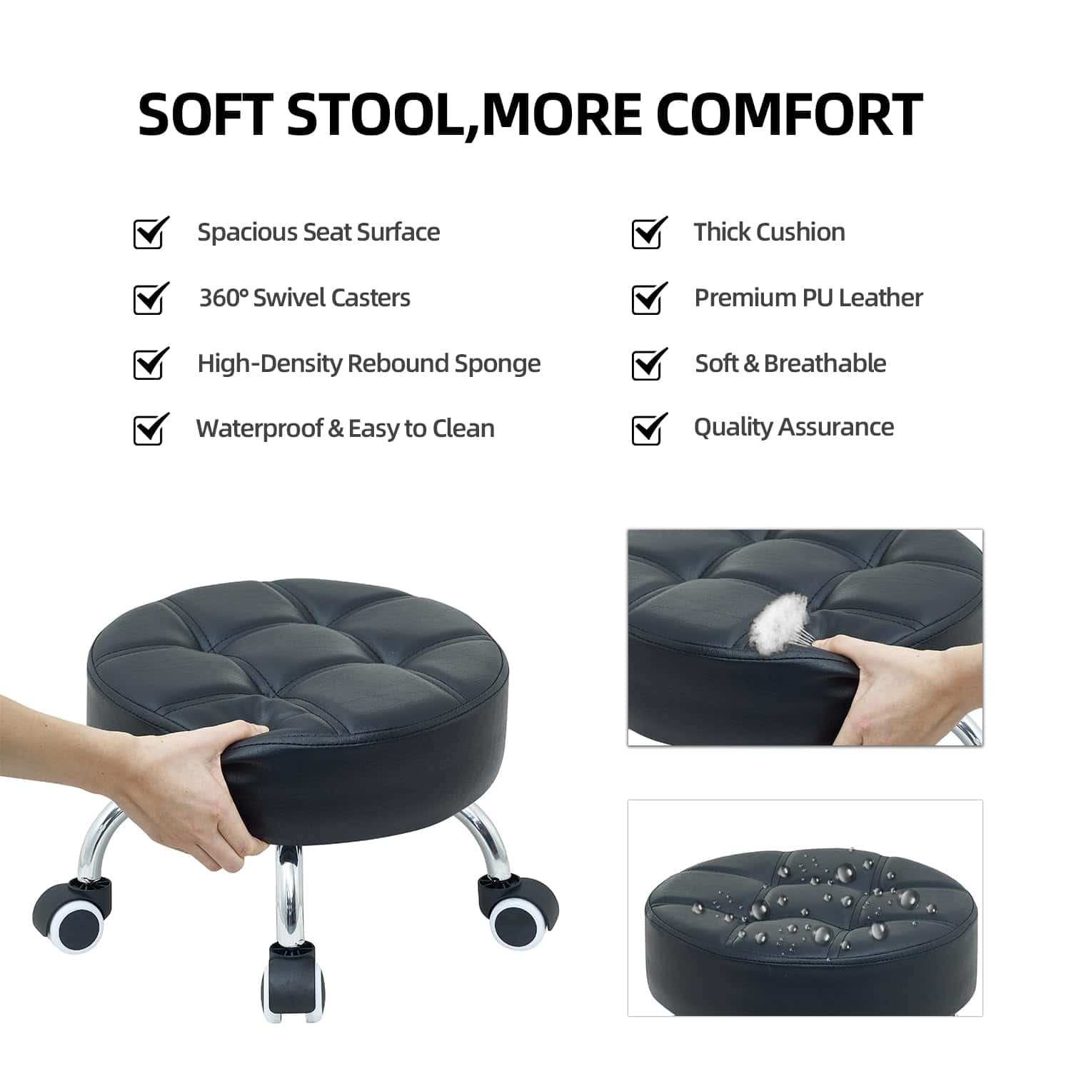 3. Tejido de piel de PU engrosado: Cojín de asiento más grande y más grueso que proporciona confort y equilibrio extra para evitar vuelcos. Este taburete rodante de baja altura adopta una nueva esponja de rebote de alta densidad, suave y transpirable, utilizando cuero de PU premium, resistente al desgaste, impermeable, fácil de limpiar y mantener, más duradero que otros taburetes con superficie de plástico.