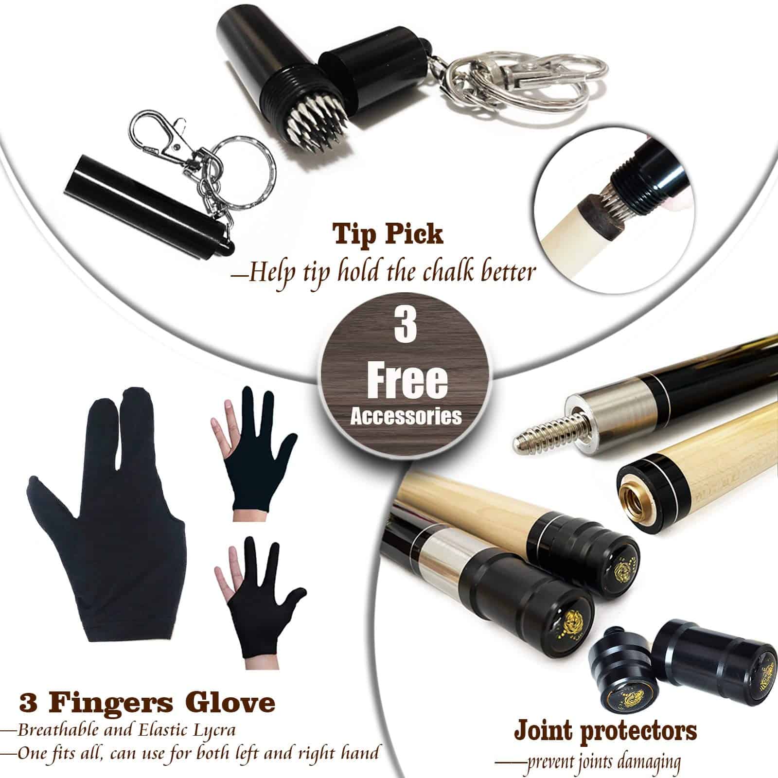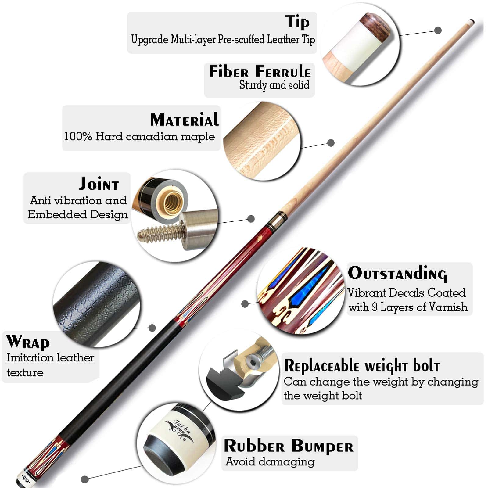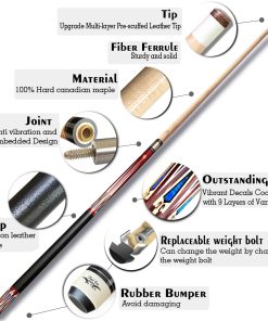 Shaft Obtenga más control: 100% de grado A, madera de arce canadiense de calidad seleccionada a mano, con una resistencia compresiva extremadamente alta, es fácil de mantener y adecuada para una velocidad de bola rápida y un control más delicado. Punta: Punta de cuero multicapa de 13 mm, conformada y bien pre-rayada, puede usarla tan pronto como la reciba. Juntas de latón Mejora del juego: Buena resistencia a la corrosión y tecnología antivibración que facilita el juego para ti. Conéctese o desconéctese fácilmente en dos partes para un mejor almacenamiento y transporte. Culata: Madera de arce canadiense de calidad con hermoso diseño de calcomanías superpuestas, recubierta con 9 capas de barniz, protege el taco de la humedad y deformación. Envoltura Aumenta tu precisión: Textura de imitación de cuero, cómoda, proporciona la fricción adecuada para evitar el deslizamiento, reduce la desviación, aumenta la potencia y la precisión. Fácil de limpiar. Después de un uso prolongado, no se desenredará o desflorará como la envoltura de lino. Paragolpes de goma Protege el taco de golpear el suelo. Sistema de pesos múltiples puedes cambiar el perno de ajuste de peso, ajustar el peso de tu preferencia. Prometemos garantía limitada de 1 año, devolución de 30 días y garantía de devolución de dinero.