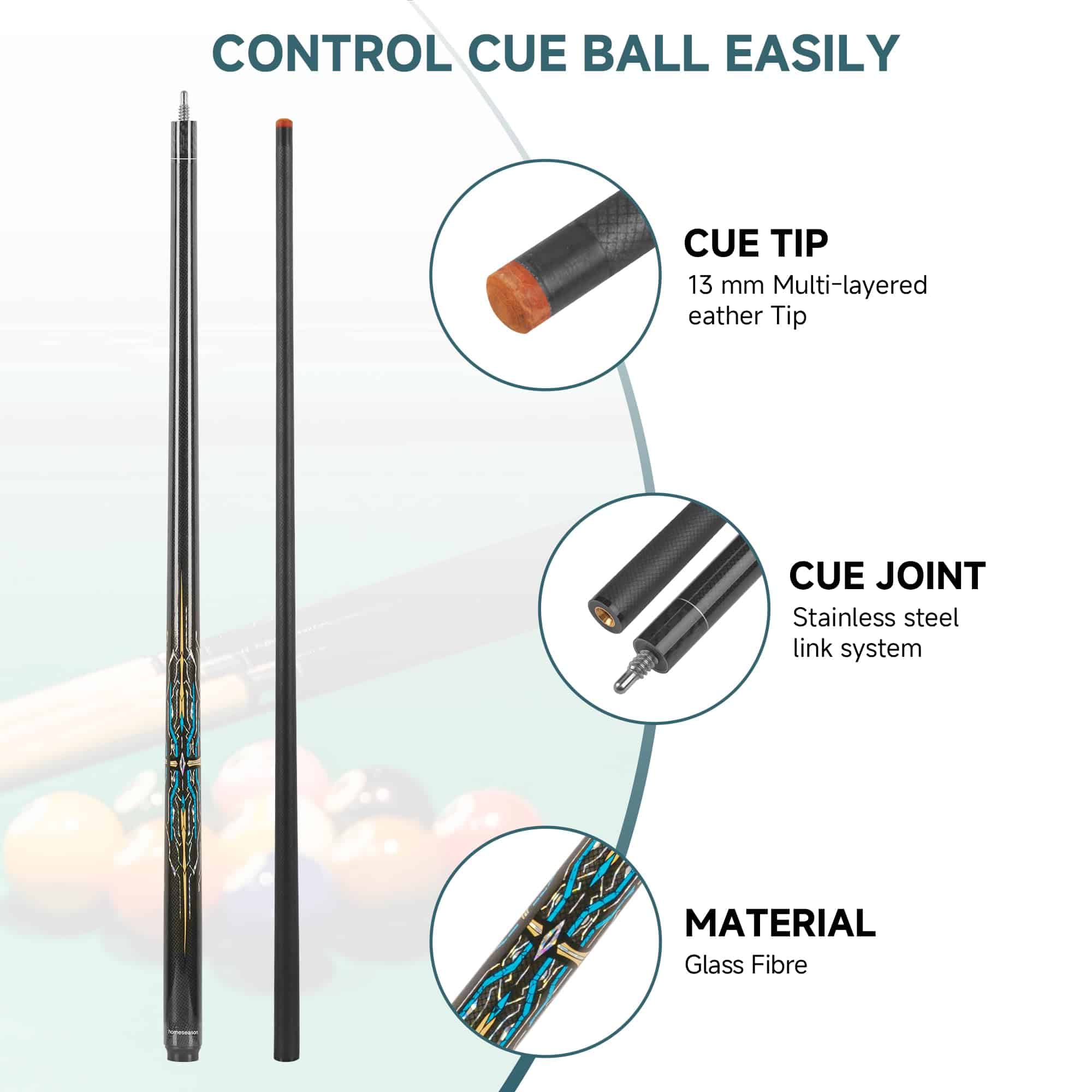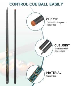 Taco de Billar de 58 pulgadas de largo, adecuado para jugadores de competencia profesional. La punta de calidad media de fibra de 13mm te ayudará a encontrar una buena sensación rápidamente. El detalle decide la calidad del taco de billar. Unión para taco de billar. Cuando juegas bolas de billar, la buena sensación es imprescindible. Controla fácilmente la bola de billar.