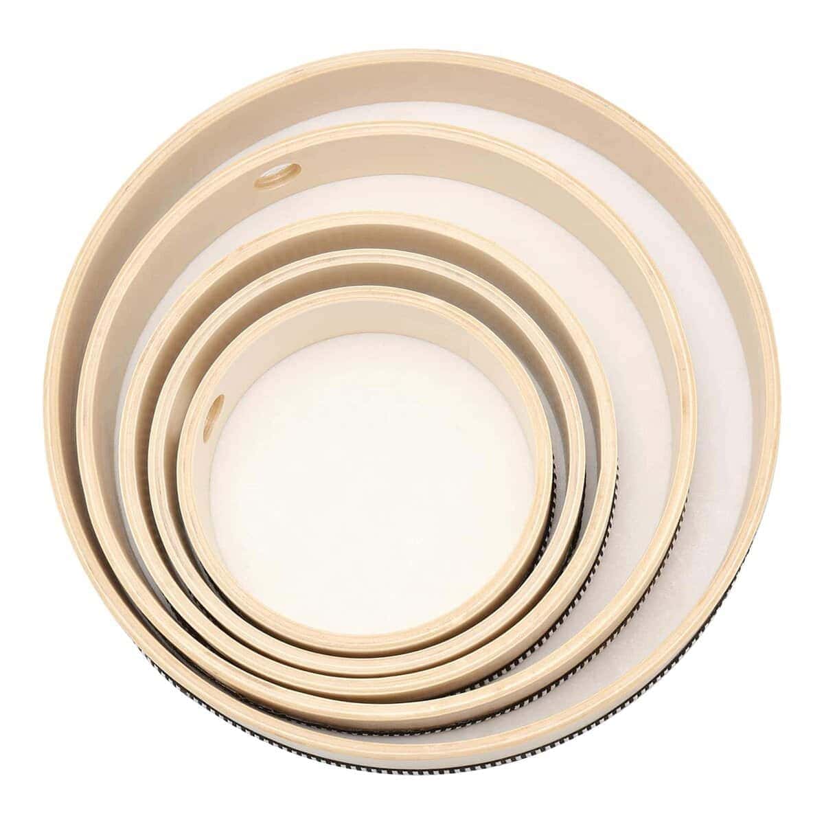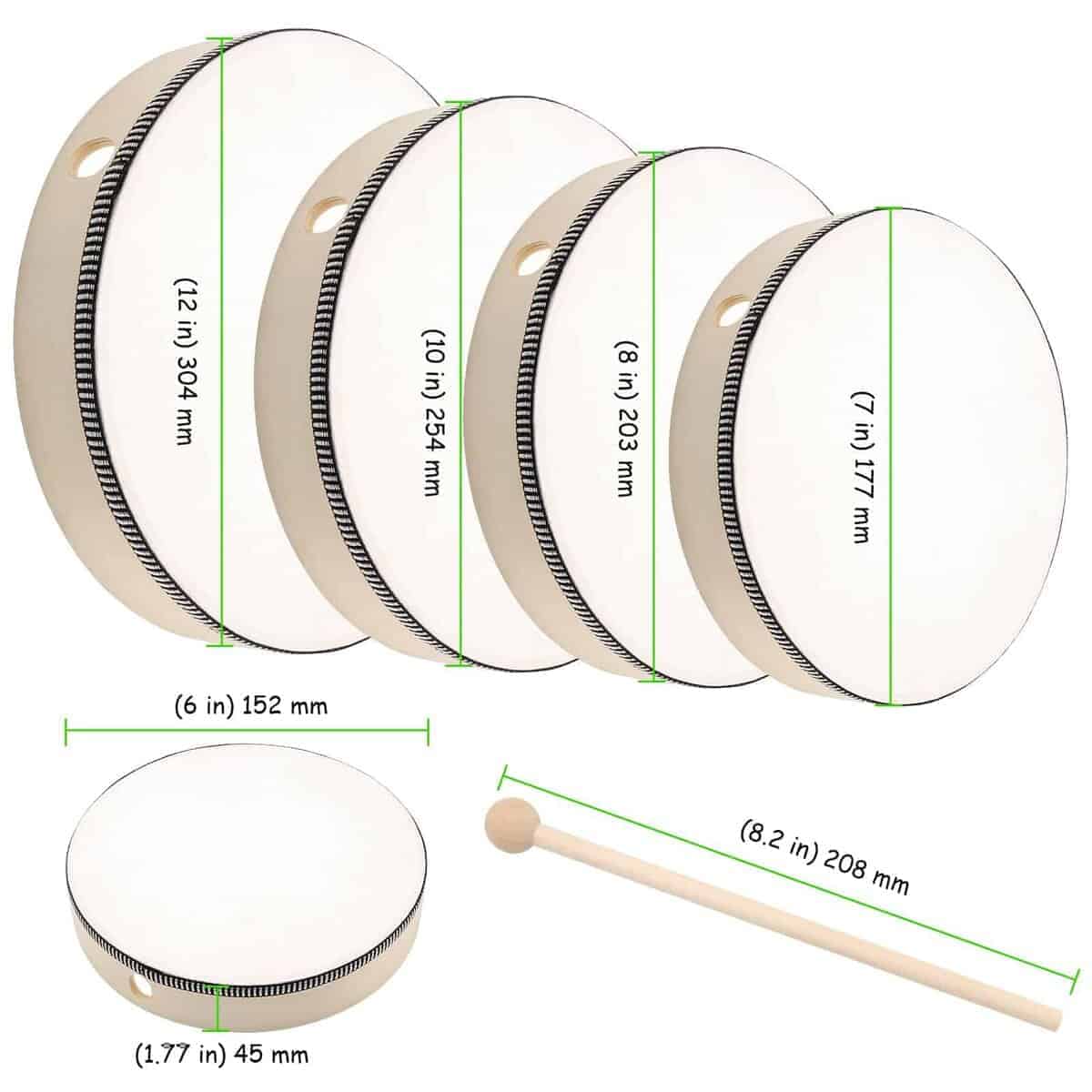 Los aros del set de tambores de marco están hechos de madera y los tambores están hechos de resistente cuero de poliéster, los tambores tienen una fina textura y pueden producir un sonido melodioso, los aros son suaves y no rayarán tus manos. El tambor cuenta con música clara, timbre completo y sonido con un sentido de capas y textura, fácil de tocar. Recibirás 5 piezas de tambores de mano en diferentes tamaños, incluyendo 12 pulgadas, 10 pulgadas, 8 pulgadas, 7 pulgadas y 6 pulgadas, así como 5 pares de baquetas; la longitud de las baquetas es de 8.2 pulgadas. Fáciles de sostener en tu mano, fáciles de transportar, ¡para satisfacer tus diferentes necesidades y ocasiones! Nuestro set de tambores de marco tiene un diseño reforzado en el borde superior del marco con refuerzo de tela en blanco y negro para hacer que los tambores se vean hermosos. El marco del tambor adopta un borde fuerte de la cinta y está firmemente pegado para evitar roturas. Los tambores de marco de madera cultivan aficiones, puedes regalarlos a tu amigo. Cada tambor de mano está equipado con baquetas para una percusión fácil, que puedes compartir con tus amigos. El tambor de mano es ligero. El tambor de marco perfecto siente el ritmo, y lo más importante, crea más interacción entre amigo y amigo al tocar con el tambor de mano. El set de tambores de marco se puede utilizar ampliamente en diversas actividades al aire libre, como bodas al aire libre, reuniones familiares, conciertos y campamentos, creando un ambiente alegre, el tambor de mano tiene 5 tamaños y puedes elegir usarlo según tus necesidades de uso.