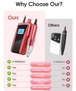 El taladro de uñas portátil Beloving es una herramienta profesional para el cuidado de las uñas tanto en el hogar como en el salón. Con una alta velocidad de hasta 30,000 rpm, este taladro es ideal para todo tipo de trabajos de manicura y pedicura. La batería recargable de 2000mHA permite un uso continuo de 6-10 horas con una carga completa en solo 2 horas. Además, el diseño portátil con clip de correa curvada lo hace conveniente para llevarlo contigo a donde quiera que vayas. Su pantalla LED muestra la velocidad y potencia precisas para un trabajo preciso. Este taladro de uñas todo en uno también funciona como una lámpara UV para uñas, proporcionando una solución completa para tus necesidades de manicura. Con su mecanismo de protección automática, garantiza la seguridad durante su uso. Equipado con un potente motor y una variedad de brocas de taladro, este juego de lima de uñas eléctrica es versátil y puede usarse para una amplia gama de trabajos de uñas. Ya sea que necesites esculpir, pulir, cortar o limar tus uñas, este taladro de uñas tiene todo lo que necesitas para lucir unas uñas impecables.