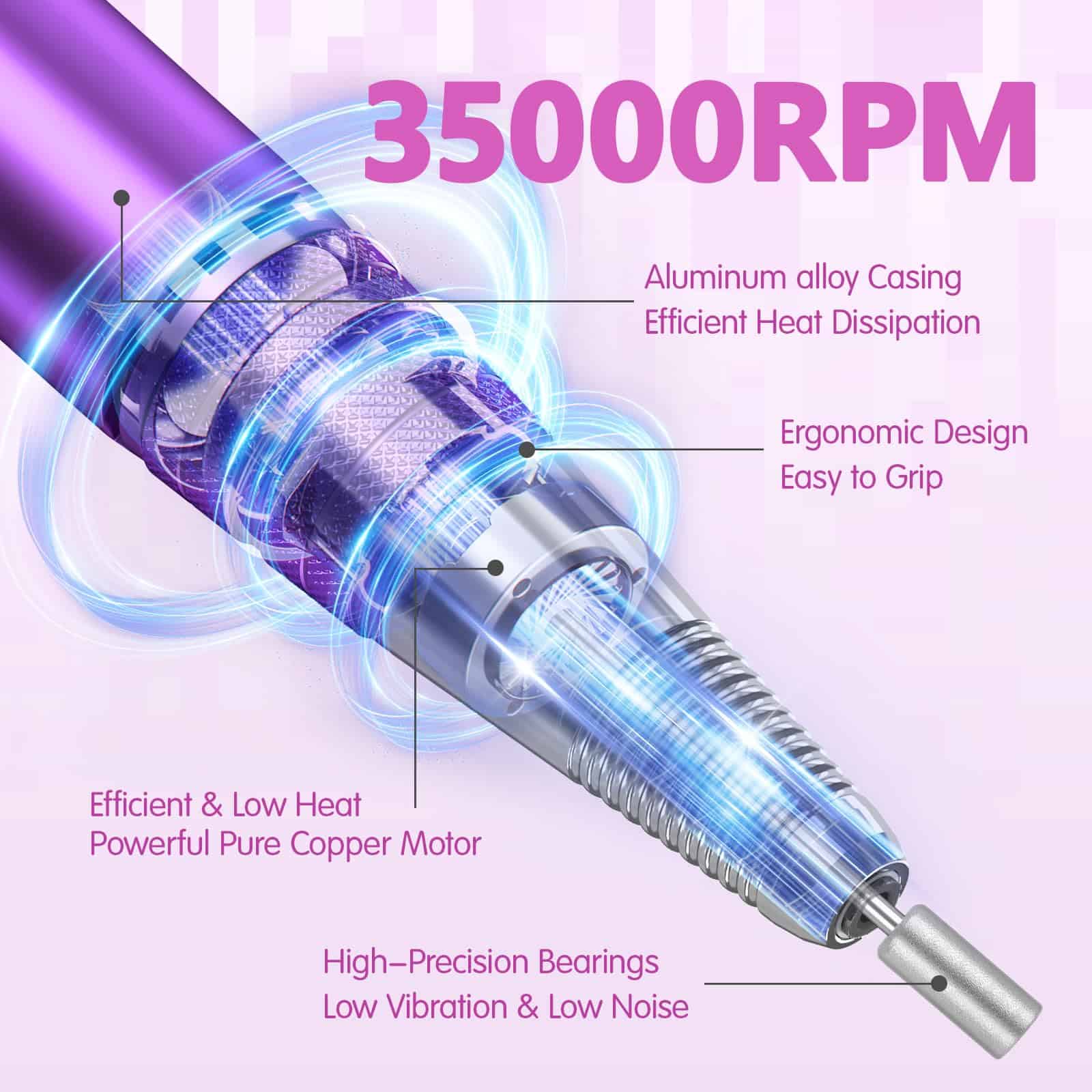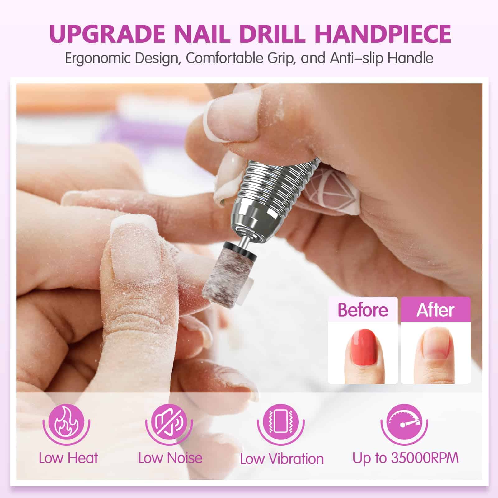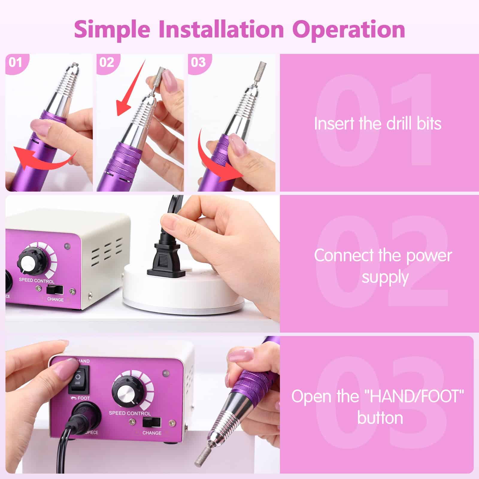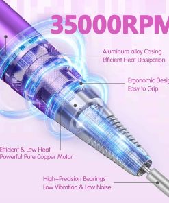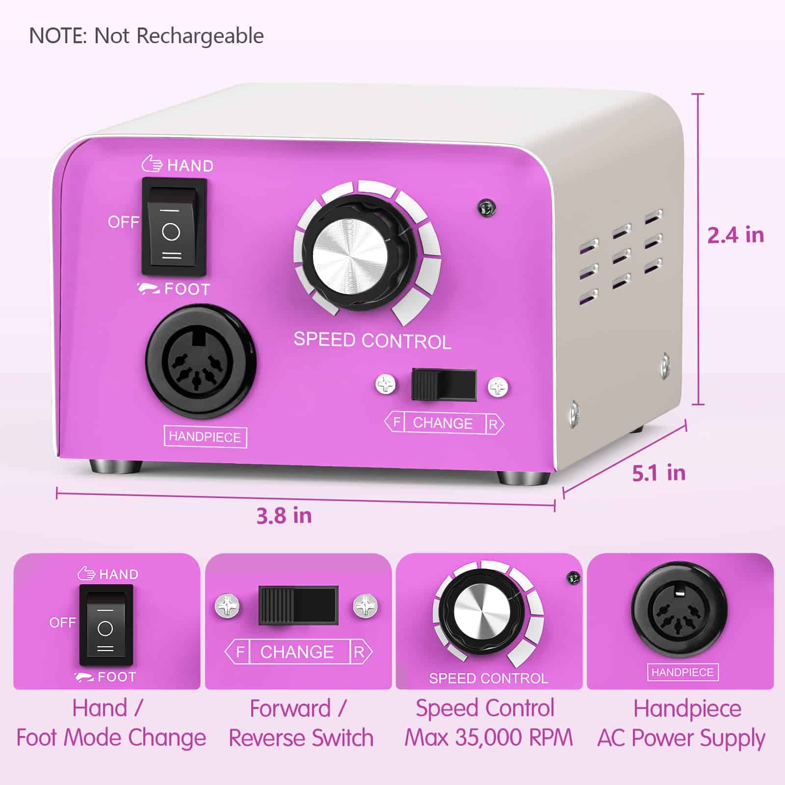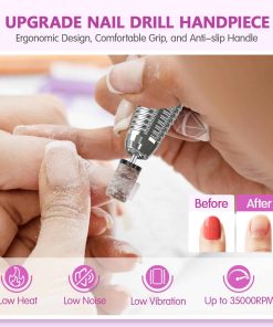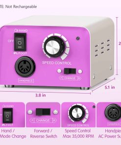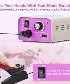 Taladro de uñas eléctrico de alta calidad con motor actualizado para un rendimiento más estable y suave. Podrás elegir entre el modo de MANO y modo de PIE para mayor comodidad. La velocidad ajustable y la dirección reversible permiten un control preciso en todo momento. El sistema de disipación de calor eficiente garantiza un proceso de pulido rápido y seguro. Equipado con una broca de uñas segura y un sistema de bloqueo para un cambio fácil. Este kit profesional de taladro de uñas incluye todo lo necesario para quitar uñas de acrílico, polvo sumergible y gel de uñas eficientemente. Además, viene con un manual de instrucciones para un uso fácil en casa o en el salón. ¡Haz arte de uñas profesional con el taladro de uñas eléctrico Subay!