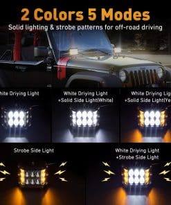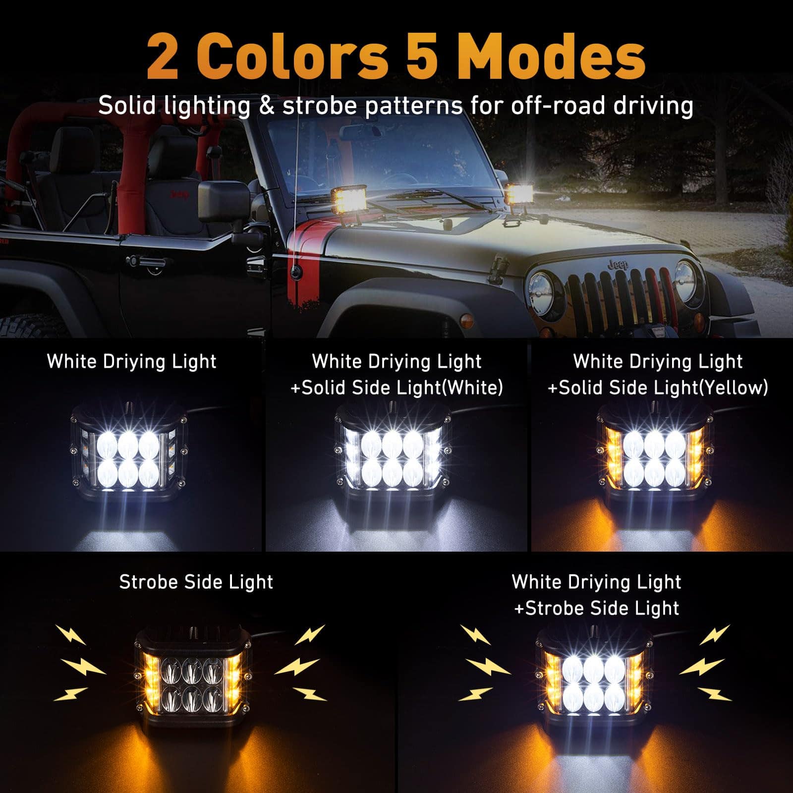 2. 5 Modos de Iluminación Los pods LED laterales duales con 5 modos de iluminación, incluyendo luz diurna blanca de circulación diurna, luz lateral DRL+continua/intermitente, luz lateral continua e intermitente separada. El modo de haz combinado combina haces de luz puntual y de inundación, maximizando la seguridad y visibilidad durante sus diversas actividades.