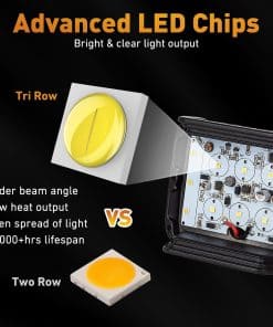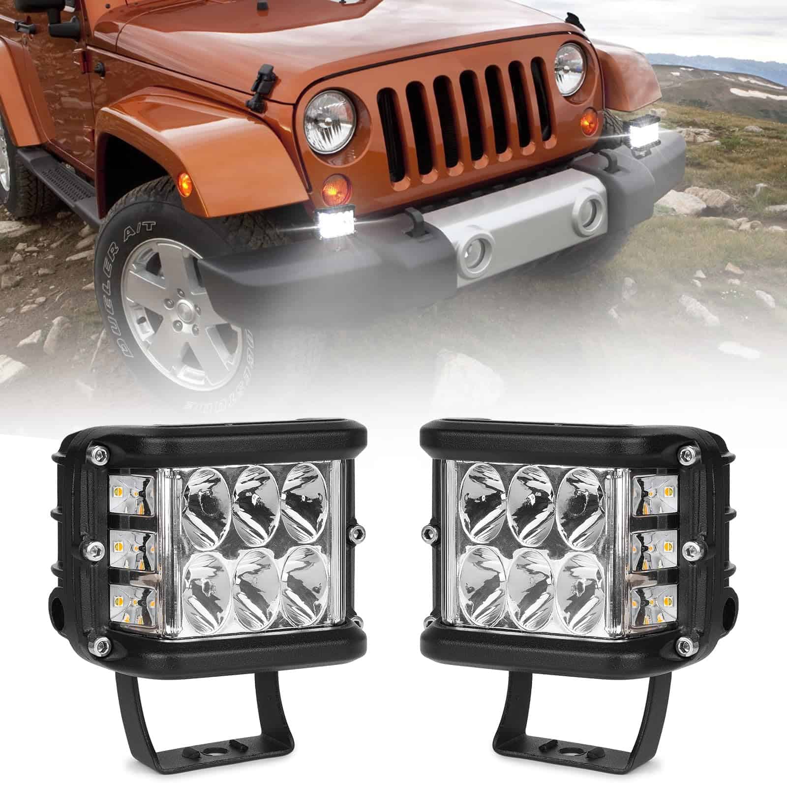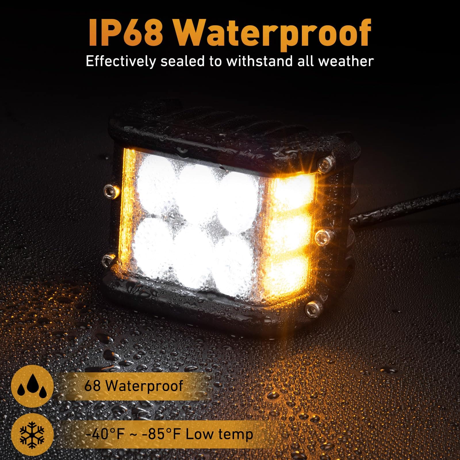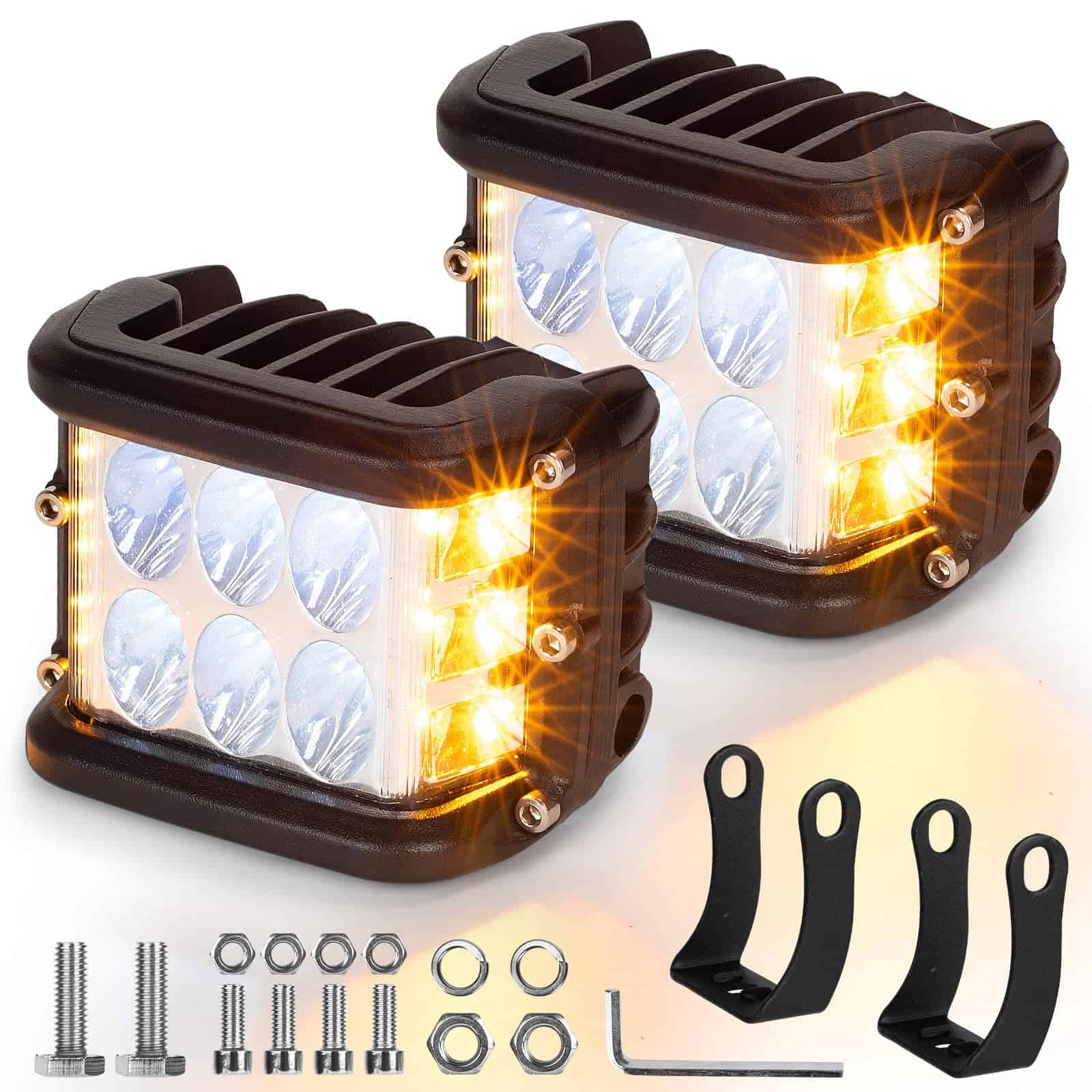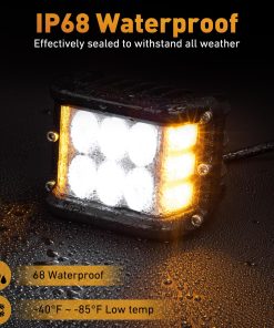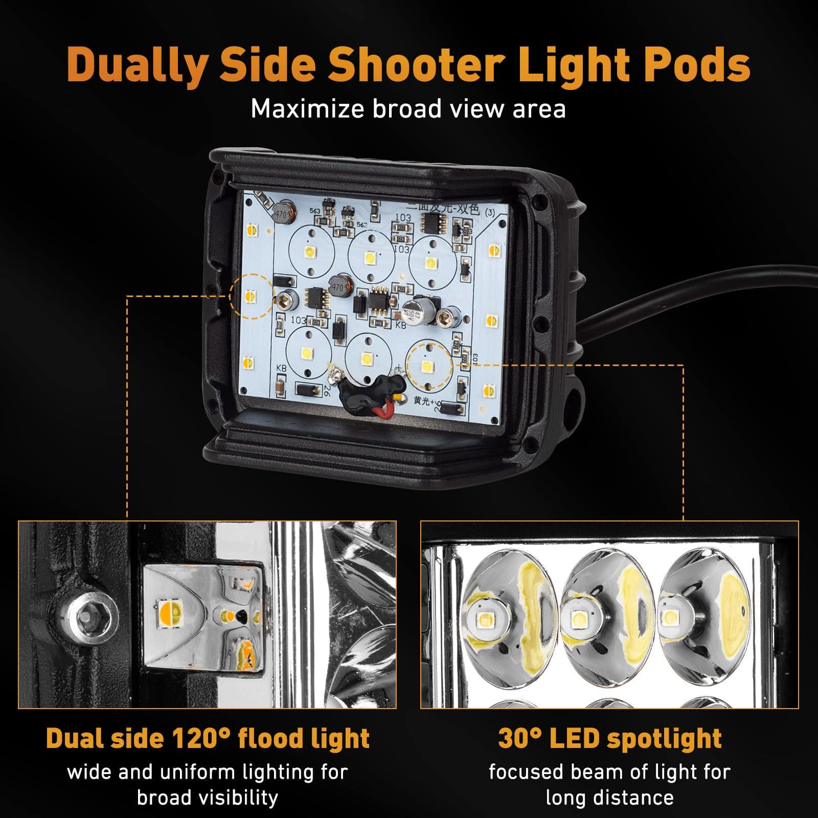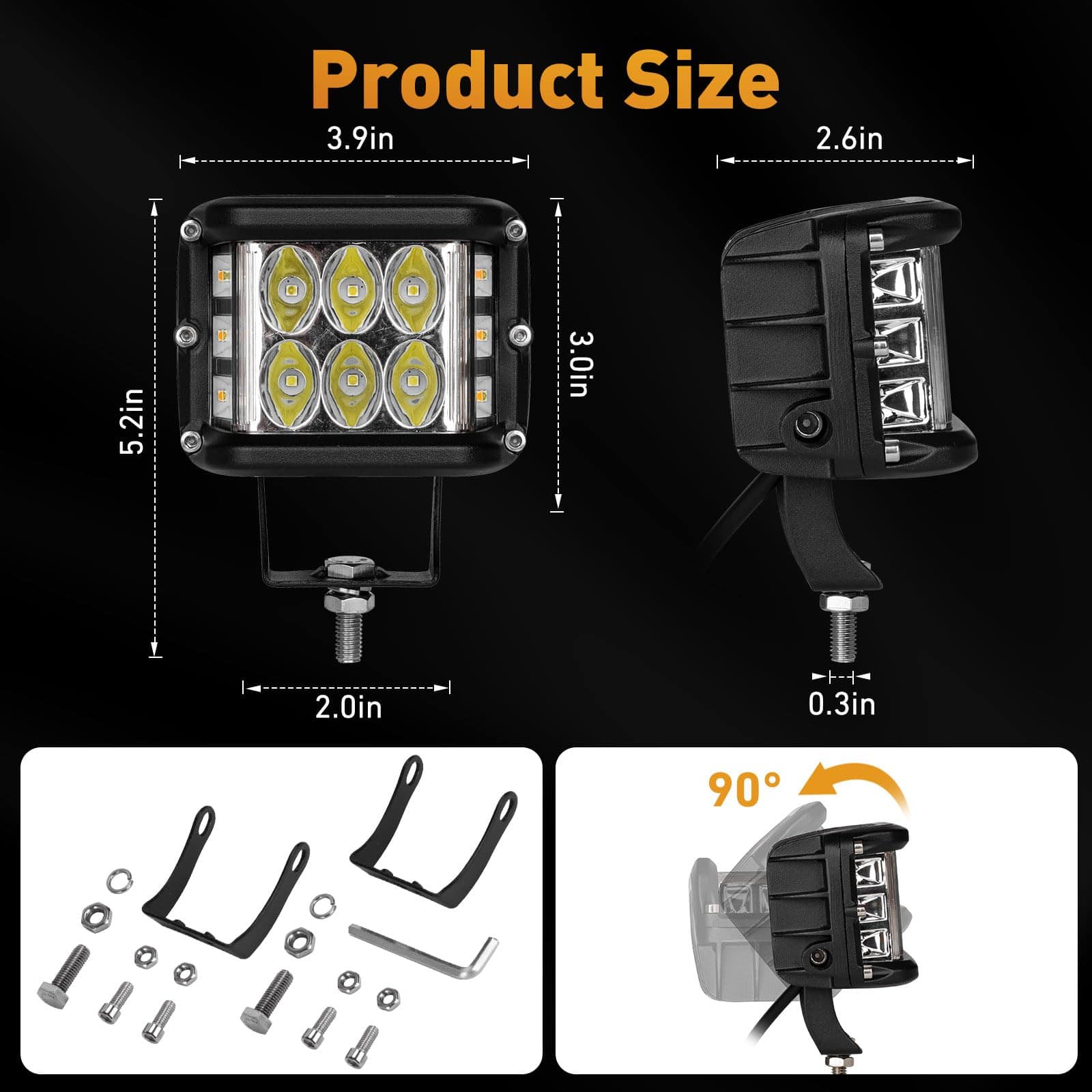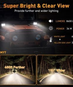 1. Cubos de LED de iluminación eficiente de 3 lados con LED de alta intensidad con 12 piezas de chips LED (luz puntual fresca de 6000k + luz lateral amarilla brillante de 3000k). Potencia de 36W y 8600LM proporciona una cobertura y visibilidad mejoradas, especialmente en carreteras mal iluminadas que suelen pasarse por alto.