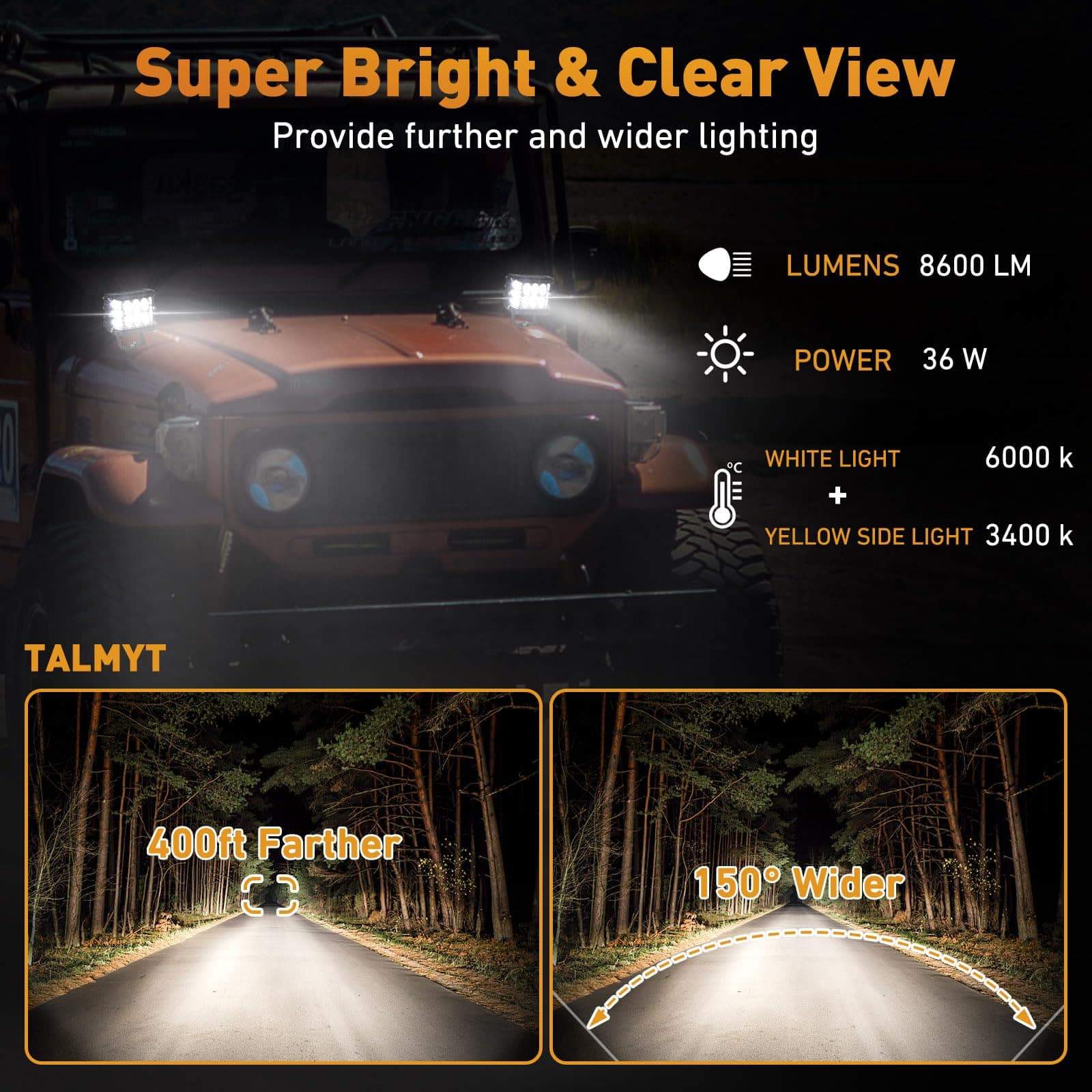 3. Haz Combinado Con Los Pods de Luz LED Las luces estroboscópicas TALMYT con 6 piezas de luz puntual y 6 piezas de luz de inundación proporcionan una luz focal perfecta con un gran ángulo de luz de inundación para una mayor distancia y un área visible más amplia. Ofrece una amplia zona de cobertura y distribución uniforme de la luz, mejora la visibilidad, reduce los puntos ciegos para su viaje.