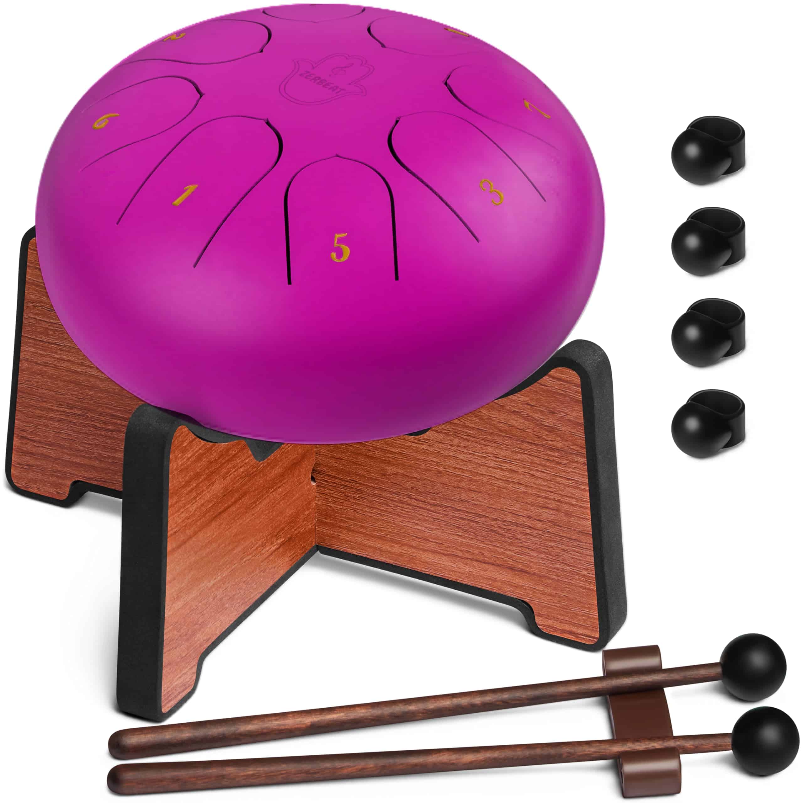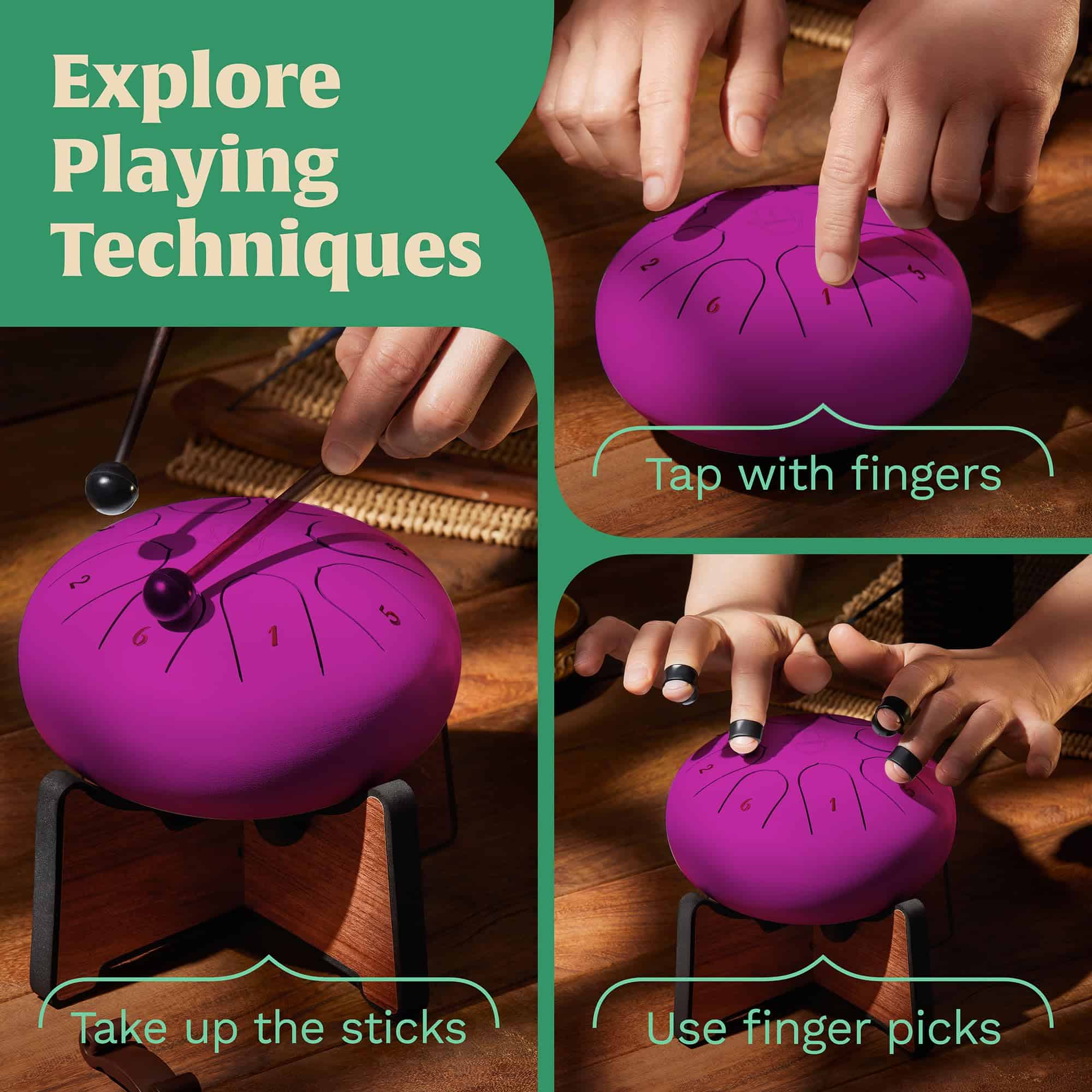 4. UN KIT COMPLETO. El tambor pequeño tiene un SOPORTE DEDICADO ÚNICO (para un sonido más profundo/alto), 2 baquetas (con un soporte), y 4 púas para dedos (los tambores de acero / tambores de mano se pueden tocar con los dedos, baquetas o púas) + Libro de Música y bolsa de terciopelo.