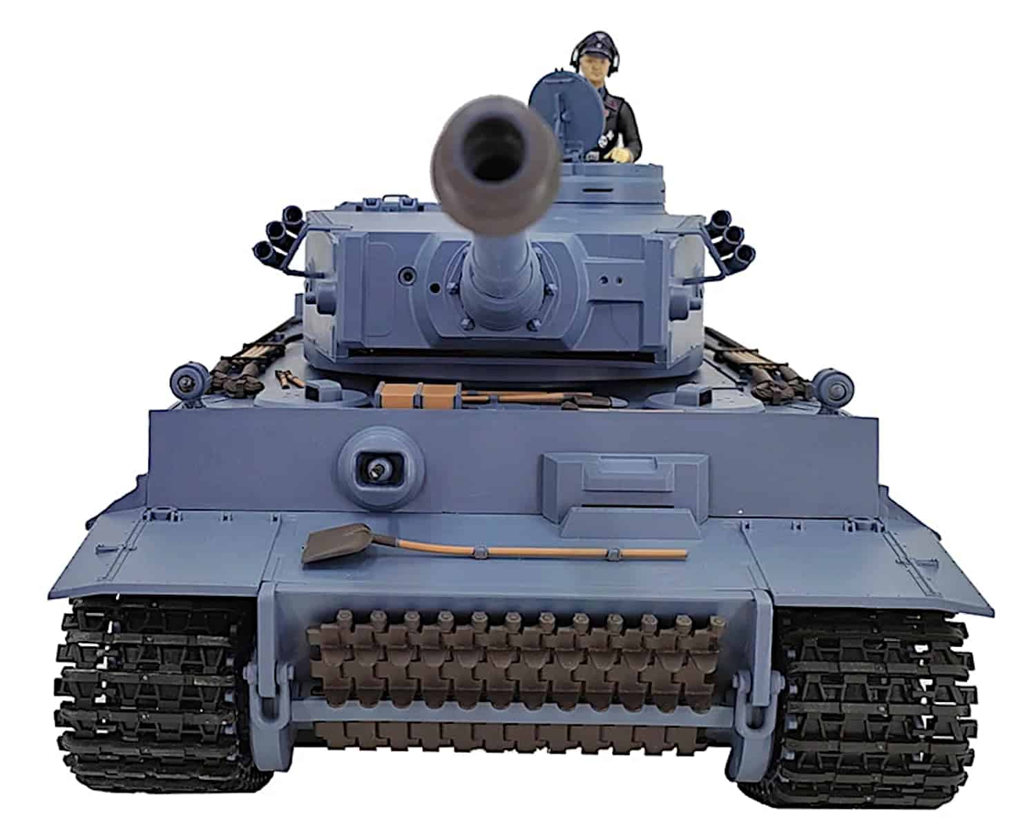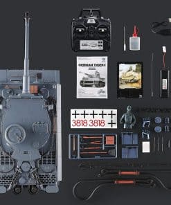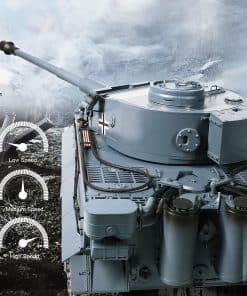 Réplica del Tanque Alemán Tiger 1 de la II Guerra Mundial a Escala 1/16 con mejoras en engranajes de acero. Sistema de batalla dual: combate por Infrarrojos IR y disparo de Airsoft BB de 6mm. Efectos de humo, sonido, luz y retroceso simulados. Movimientos: Adelante/Atrás, Giro Izquierda/Derecha y Rotación. Dimensiones: 53cm x 23cm x 20cm. Incluye tanque RC 100% ensamblado, Transmisor 2.4Ghz, batería recargable de 7.4v 1800mAh, cable de carga USB, receptor infrarrojo, accesorios de tanque, pellets de BB de 6mm, líquido de humo, manual en inglés con objetivos, y más. Atención: Este tanque es un artículo de grado hobby, NO es un juguete. Apto para mayores de 16 años. Se recomienda leer las instrucciones antes de jugar.