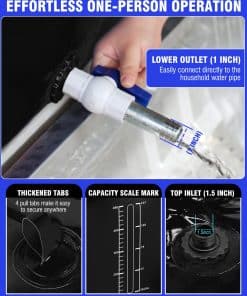 Tanque de agua ideal para suministro de agua de emergencia en el hogar, irrigación de jardines, recolección de agua de lluvia, almacenamiento de agua en RV, agricultura, riego de jardines, pre-carga de puentes, etc. Construido con material de malla resistente recubierto de PVC de doble cara de alta densidad de 1/20 de pulgada de grosor. Incluye tapa plástica con salida de agua de rosca de 1 pulgada y entrada de 1,5 pulgadas. Fácil de transportar y asegurar con 4 anillos de extracción en la parte superior. Diseño ligero y plegable que ahorra espacio de almacenamiento. Dimensiones de 59.1 x 35.4 x 15.7 pulgadas cuando está lleno y 15.75 x 11.02 x 7.09 pulgadas cuando está plegado. Incluye tanque de agua, parche de tela, sellador y balde plegable. Garantía de un año y servicio personalizado. Contacta con nosotros para cualquier pregunta o sugerencia.
