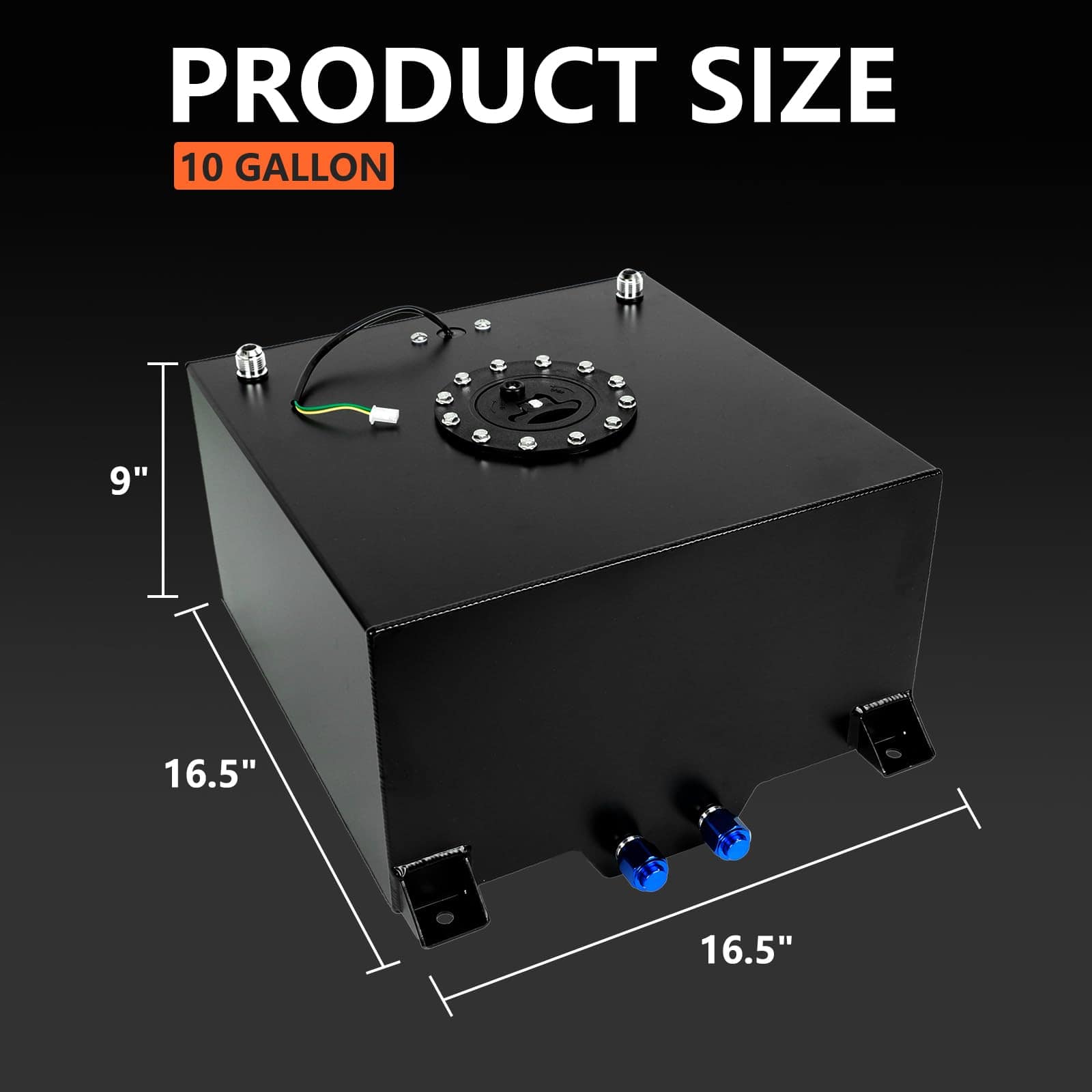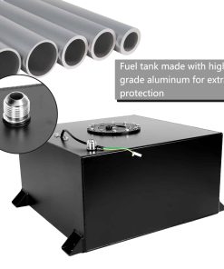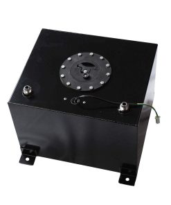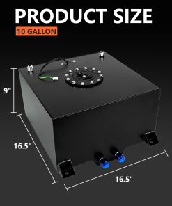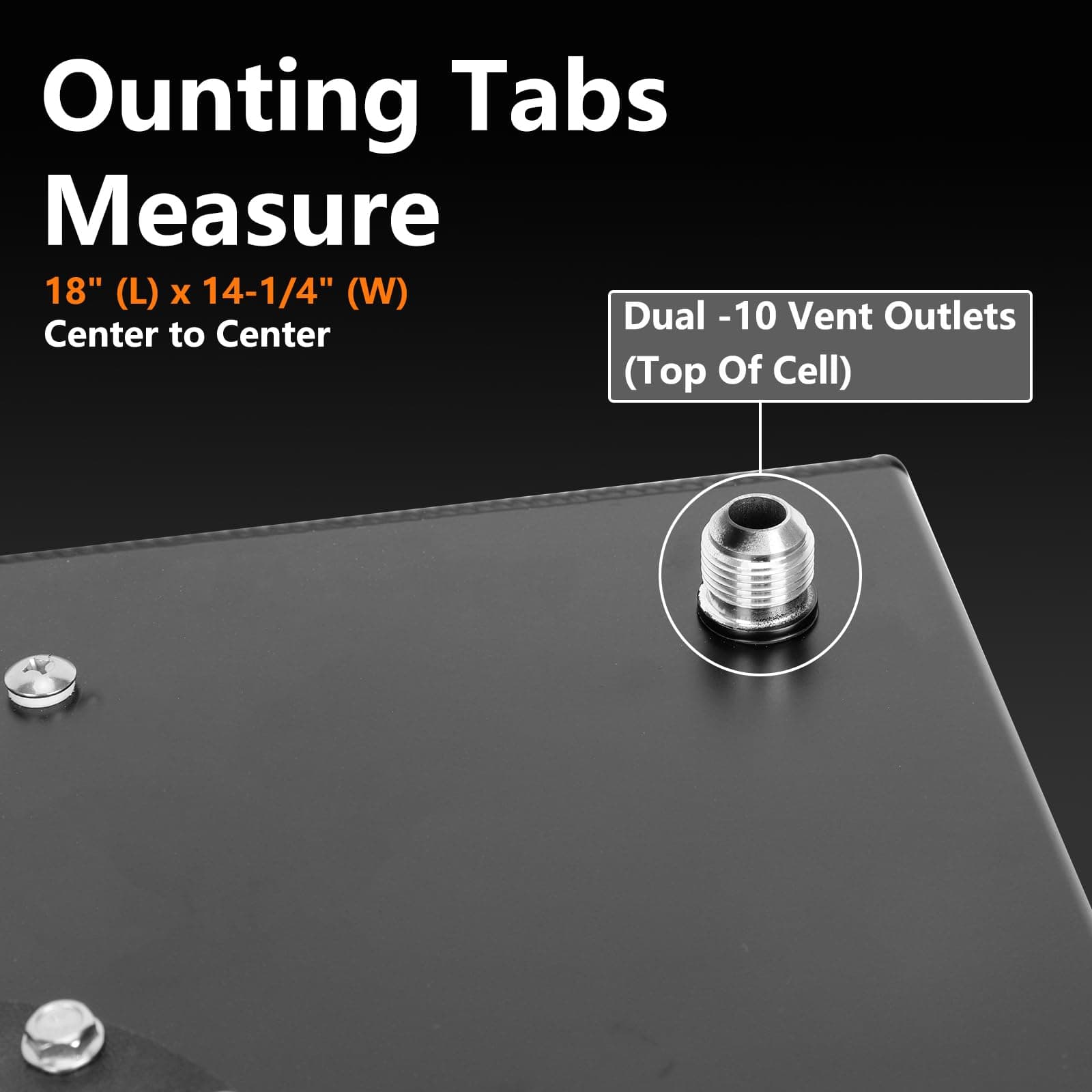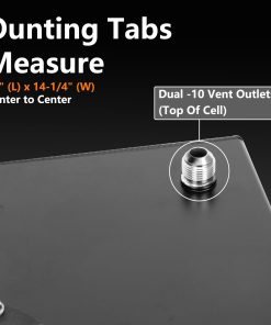 El tanque mide 16.5″ (L) x 16.5″ (W) x 9″(H). Pestañas de montaje miden 18″ (L) x 14-1/4″ (W) Centro a Centro. Salidas dobles -10. Salidas de ventilación dobles -10 (parte superior del tanque). Cárter mide 6″ x 6″ x 2″ de profundidad. Tapa de combustible de liberación rápida. Medidor de combustible de 0-90 ohmios. Incluye espuma anti-derrame. Color: Negro. Tanque de combustible fabricado con aluminio de alta calidad para una protección adicional. No se incluyen instrucciones. Se recomienda una instalación profesional.