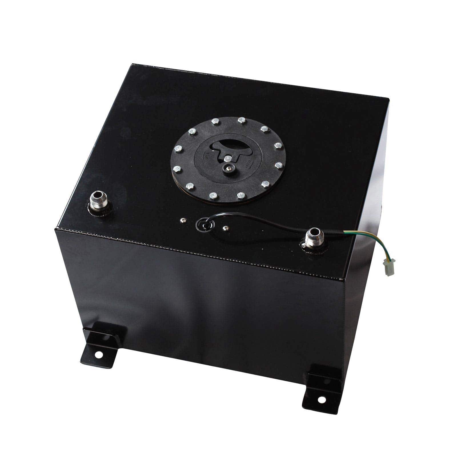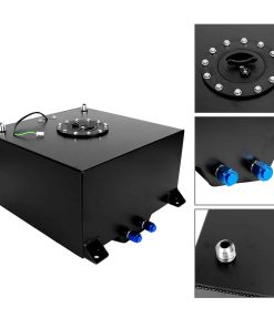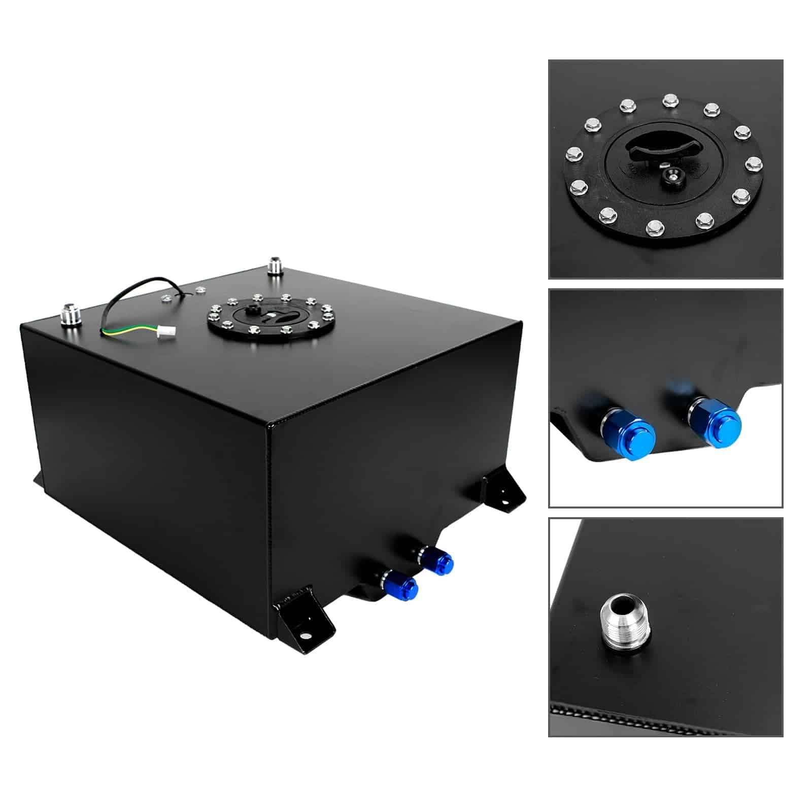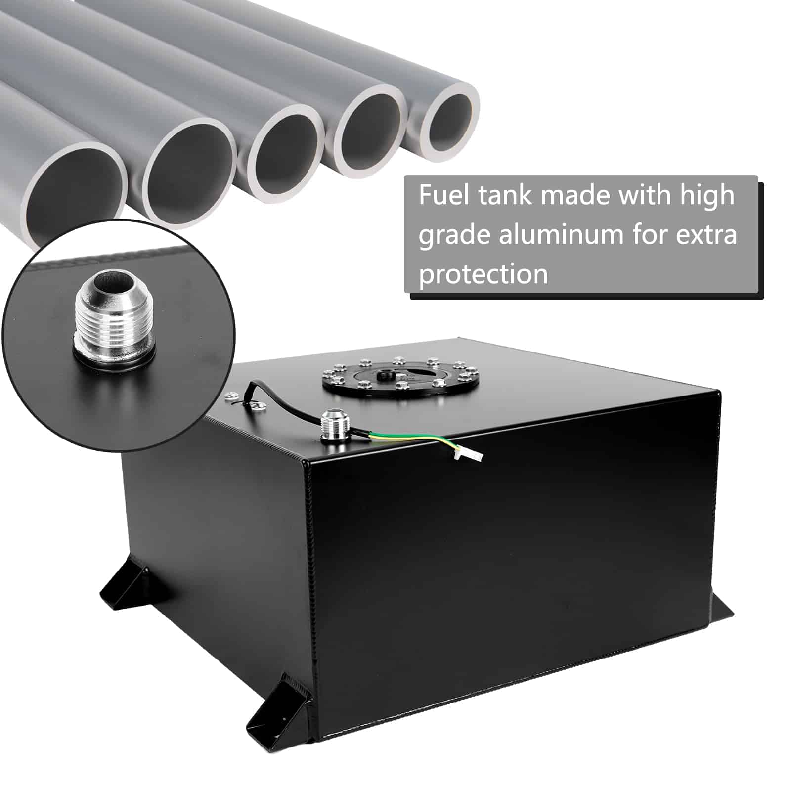 El tanque mide 16.5″ (L) x 16.5″ (W) x 9″(H). Pestañas de montaje miden 18″ (L) x 14-1/4″ (W) Centro a Centro. Salidas dobles -10. Salidas de ventilación dobles -10 (parte superior del tanque). Cárter mide 6″ x 6″ x 2″ de profundidad. Tapa de combustible de liberación rápida. Medidor de combustible de 0-90 ohmios. Incluye espuma anti-derrame. Color: Negro. Tanque de combustible fabricado con aluminio de alta calidad para una protección adicional. No se incluyen instrucciones. Se recomienda una instalación profesional.