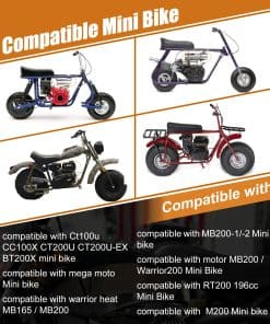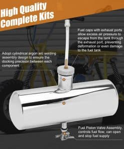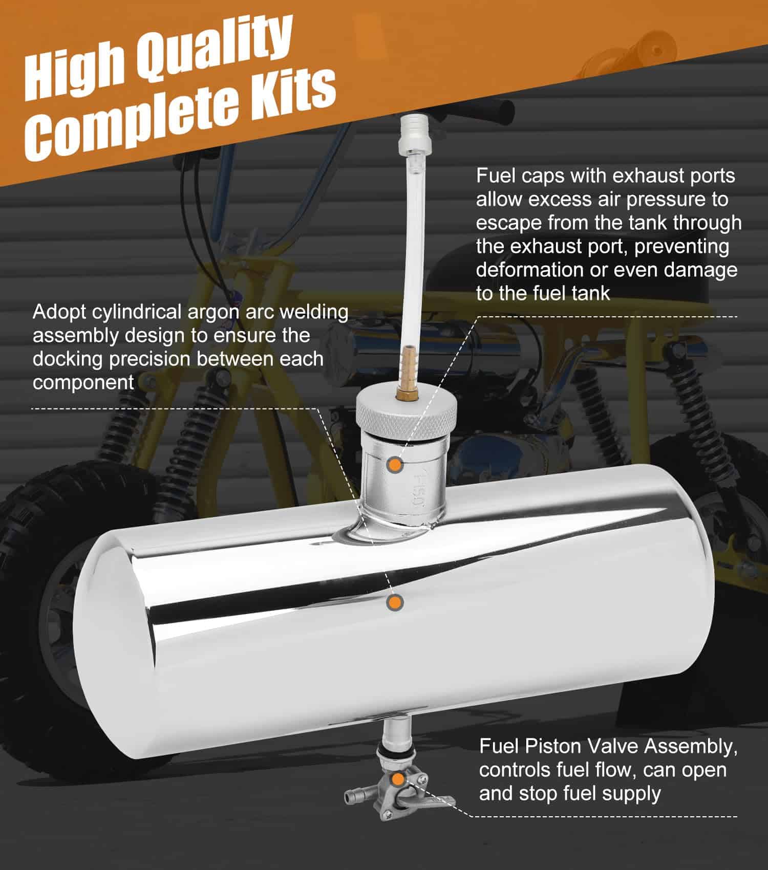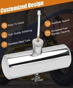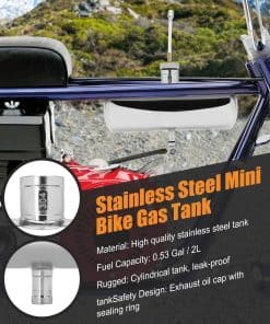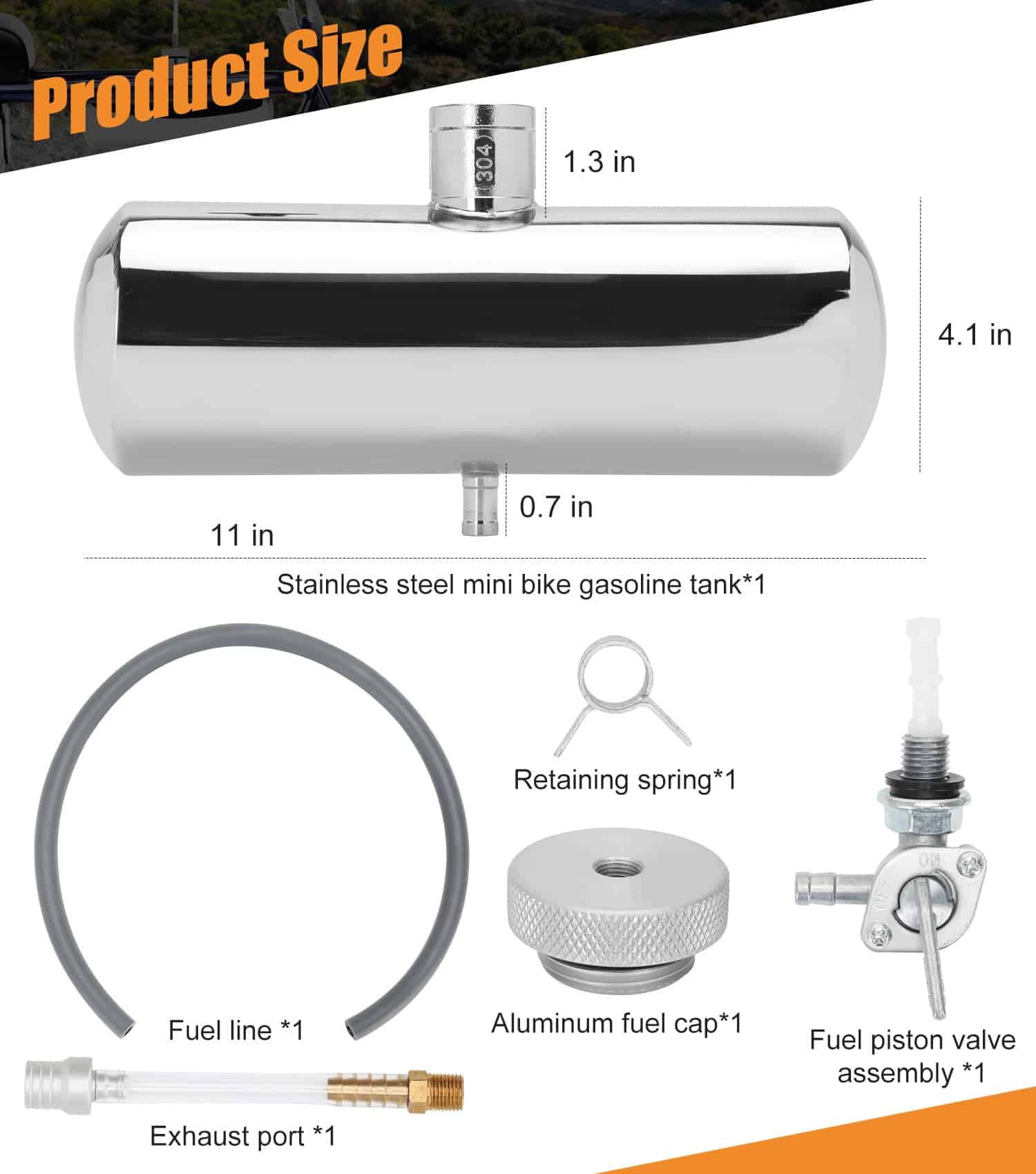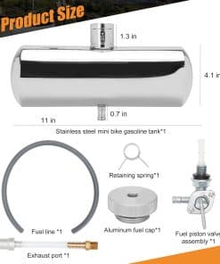 1. Compatible con: Tanque de gasolina para mini bicicleta compatible con motor CC100U CT100X CT200U CT200U-EX BT200X, compatible con mini bicicleta Mega Moto, compatible con mini bicicleta Warrior Heat MB165 / MB200, compatible con mini bicicleta MB200-1/-2, compatible con mini bicicleta motor MB200 / Warrior200, compatible con mini bicicleta RT200 196cc, compatible con mini bicicleta M200. 2. Tanque de gasolina de alta calidad: Tanque de gasolina de acero inoxidable de alta calidad de 4 11″, capacidad de combustible: 2L / 0.53 galones, mini tanque de gasolina de acero inoxidable está hecho de acero inoxidable 304, no es fácil de deformar, no se oxida en áreas costeras, sellado estable, sin fugas, más duradero, para ofrecer confiabilidad a largo plazo. 3. Características del producto: El tanque de gasolina para mini bicicleta de 4 11″ para motor 212 tiene un funcionamiento suave de la válvula de pistón, se siente duradero; Diseño a prueba de fugas de soldadura para extender la vida útil del tanque; Tapa de aceite de escape con anillo de sellado, la tapa del tanque de ventilación puede ajustarse automáticamente; Tapa de combustible de aluminio para mantener la integridad del combustible. 4. Proceso de alta calidad: Diseño de ensamblaje de soldadura de arco de argón cilíndrico de tanque de gas para mini bicicleta, para garantizar la precisión de conexión de cada parte, soldadura continua durante toda la semana, para garantizar la robustez del tanque de almacenamiento, sin peligros de fuga, el cilindro es más fácil de adaptar al arco del marco, ahorrar espacio de instalación, aumentar el atractivo estético. 5. Kit completo: Nuestro tanque de gasolina para mini bicicleta incluye un kit con tanque de gasolina para mini bicicleta de acero inoxidable 304 1, tapa de combustible de aluminio 1, puerto de escape 1, línea de combustible 1, arandela plana 2, resorte de retención 1, montaje de válvula de pistón de combustible 1, una solución todo en uno sin la necesidad de comprar accesorios adicionales. 6. Consejos útiles: Antes de instalar el tanque de gasolina para mini bicicleta, verifique cuidadosamente la posición reservada para el marco de la pequeña bicicleta para el tanque, diferentes tipos de estructura de marco para la adaptabilidad del tanque es diferente, conectando la línea de combustible entre el tanque y el motor, preste atención a que la dirección de la línea de combustible debe mantenerse suave
