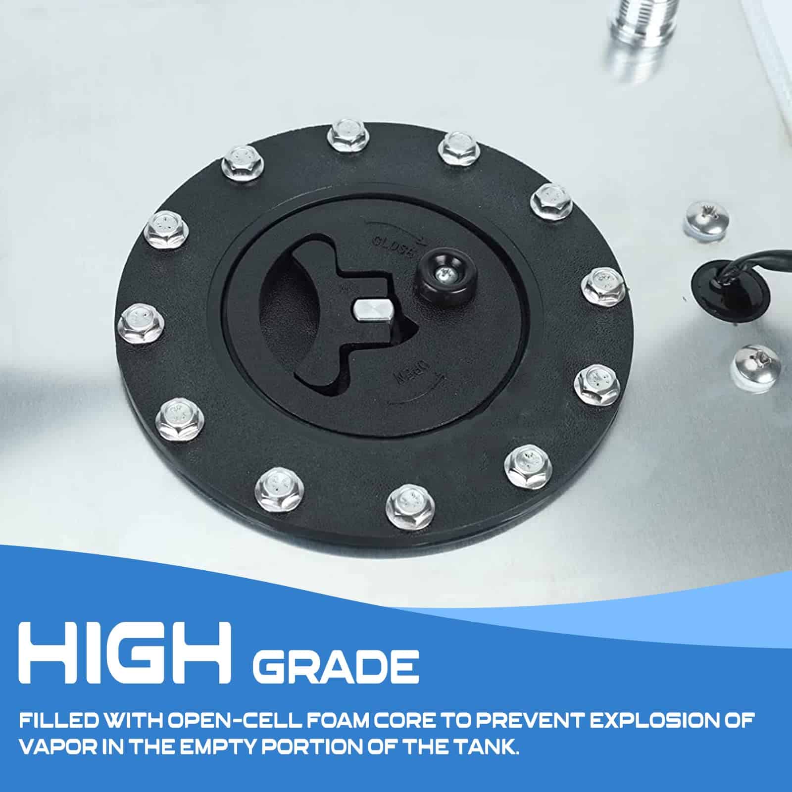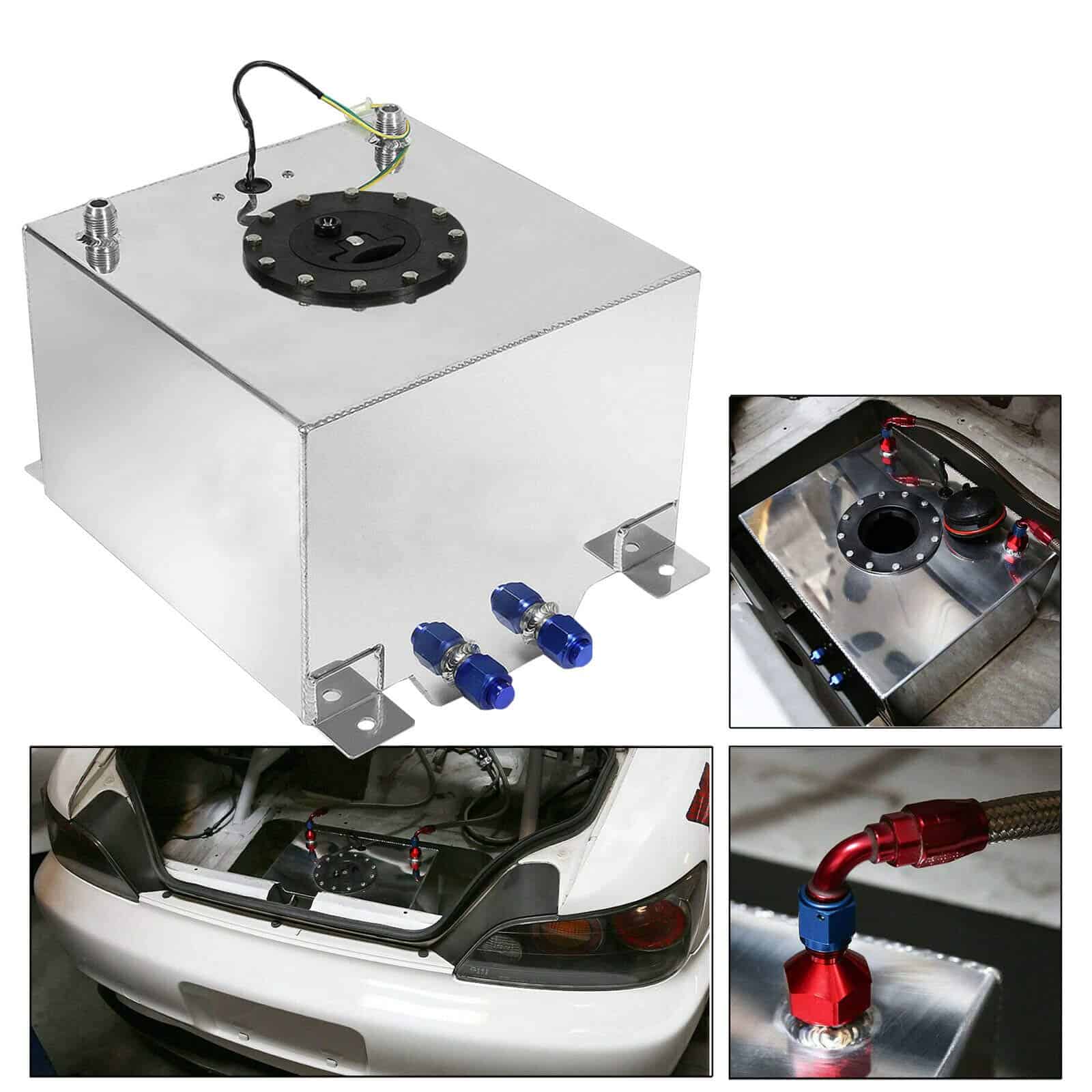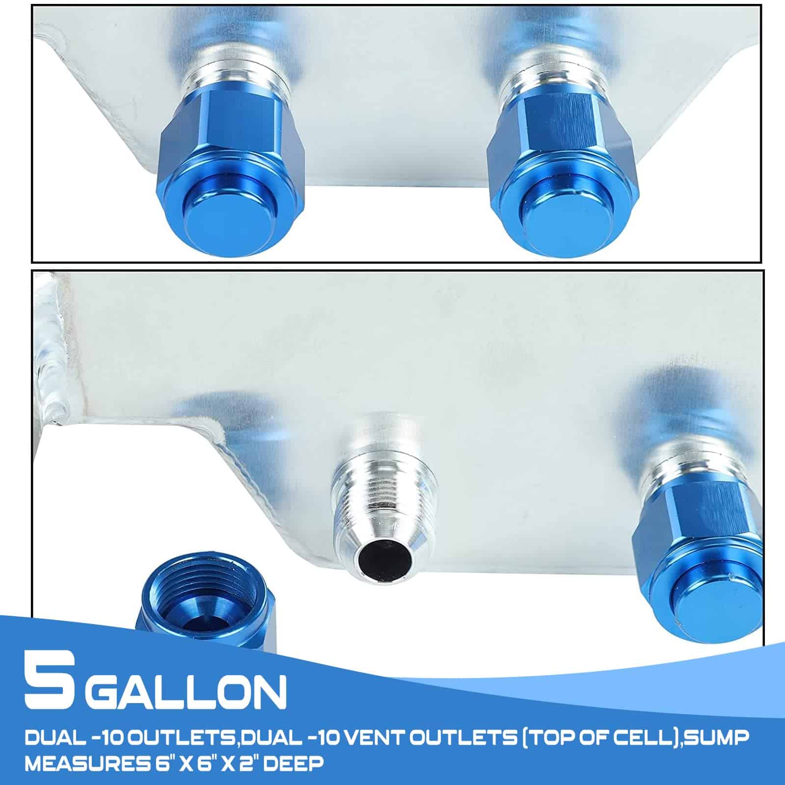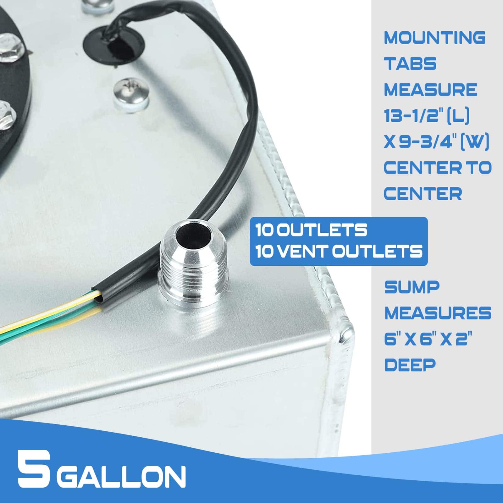 –100% Nuevo, nunca usado –Color: Plata –Tanque mide 12″ (L) x 12″ (W) x 8″ (H) –Montaje de 13-1/2″ (L) x 9-3/4″ (W) Centro a Centro –Salidas duales -10 –Salidas de ventilación duales -10 (parte superior del tanque) –Sumidero mide 6″ x 6″ x 2″ de profundidad –Tapa de liberación rápida –Sensor de combustible 0-90 Ohm –Incluye espuma antigolpes –Tanque de combustible fabricado con aluminio de alta calidad para una protección adicional –Se recomienda la instalación profesional (No se incluyen instrucciones)