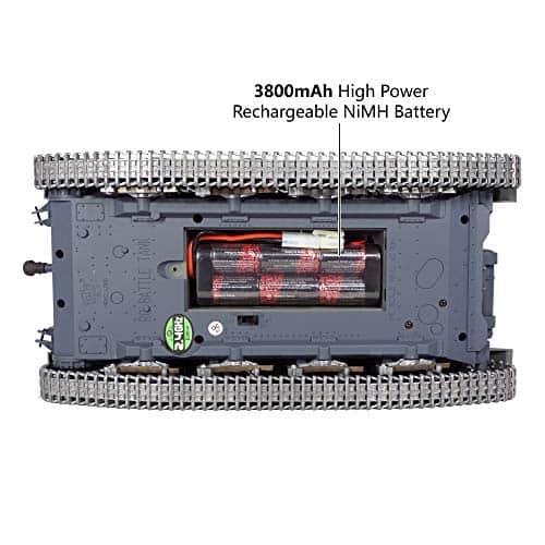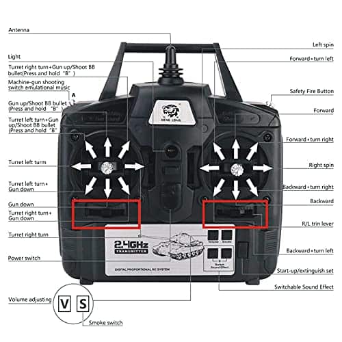 ——Características:—— Caja de cambios de engranajes de acero mejorada. Más resistente al desgaste, vida útil multiplicada. Pistas de goma metálicas mejoradas Rueda de Engranaje de metal mejorada Rueda loca de plástico estándar Rueda de rodaje de plástico estándar Neumáticos de plástico estándar Brazos de suspensión de plástico estándar Modificado / Torreta giratoria 360 grados (Izquierda/Derecha) Anillos eléctricos deslizantes hechos a mano e instalados en los tanques. (No es una configuración estándar de fábrica) Modificado / Batería recargable de alta potencia 3800mah Nimh. (No es una configuración estándar de fábrica) Función del Producto Este tanque puede moverse hacia adelante, acelerar hacia adelante y hacia atrás, rotar, el cañón puede elevarse 30 grados. La torreta puede girar 360 grados Ángel de giro vertical máximo del cañón (arriba/abajo) aproximadamente 30 grados Gradiente de escalada máximo (Cambiante en diferentes superficies de la carretera) Aproximadamente 35 grados Sonido del motor, Sonido de ametralladora. Especificaciones Casquillo del cañón: 6mm estándar BBs Al igual que un tanque real de fuego, disparando balines de 6 mm con acción de retroceso y efecto de sonido de disparo COOL. Simulador de efectos de humo. Fumando como un tanque real desde «Motor». Simulador de efectos de sonido. Cada acción actúa con sonido mecánico de tanque real simulado. El electrónico completo con control remoto (Sistema de humo y sonido) Sistema de control remoto de radio 2.4Ghz, admite muchos tanques similares que luchan juntos sin interferencias de radio. Especificación: Longitud: 26.6 pulgadas, Ancho: 9.25 pulgadas, Altura: 7.5 pulgadas Escala: 1:16 Peso: Advertencia: Consulte el manual de la nueva versión del sistema de control remoto de radio 2.4Ghz, debido a que la versión antigua del manual está equivocada.