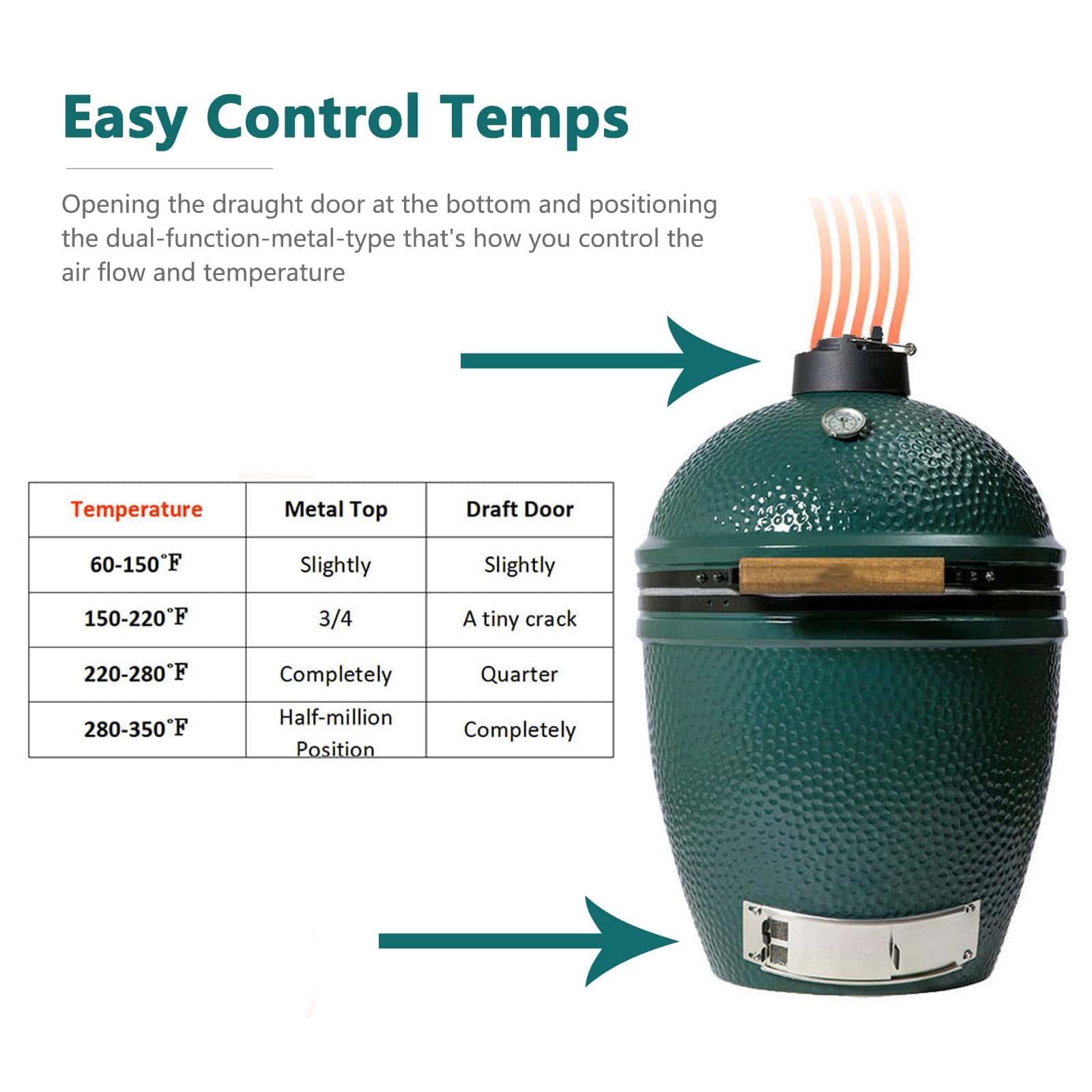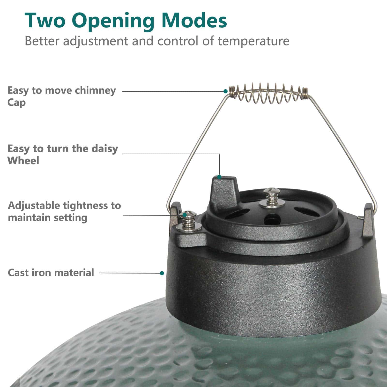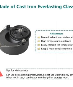 3. CONTROLE LAS TEMPERATURAS FÁCILMENTE – Esta tapa de regulación está hecha de hierro fundido, por lo que puede alcanzar la temperatura ideal del horno en poco tiempo y puede alcanzar temperaturas más altas que el acero inoxidable. Con la puerta de ventilación en la parte inferior, puede obtener la temperatura que desee.
