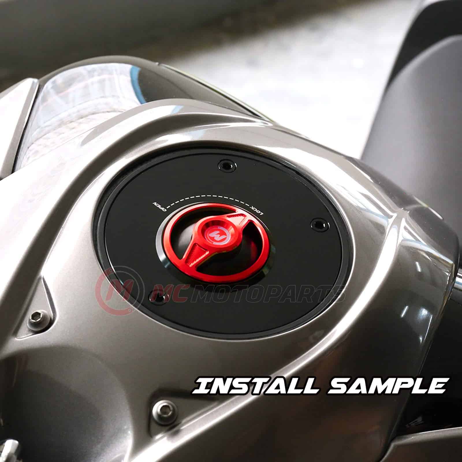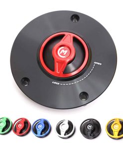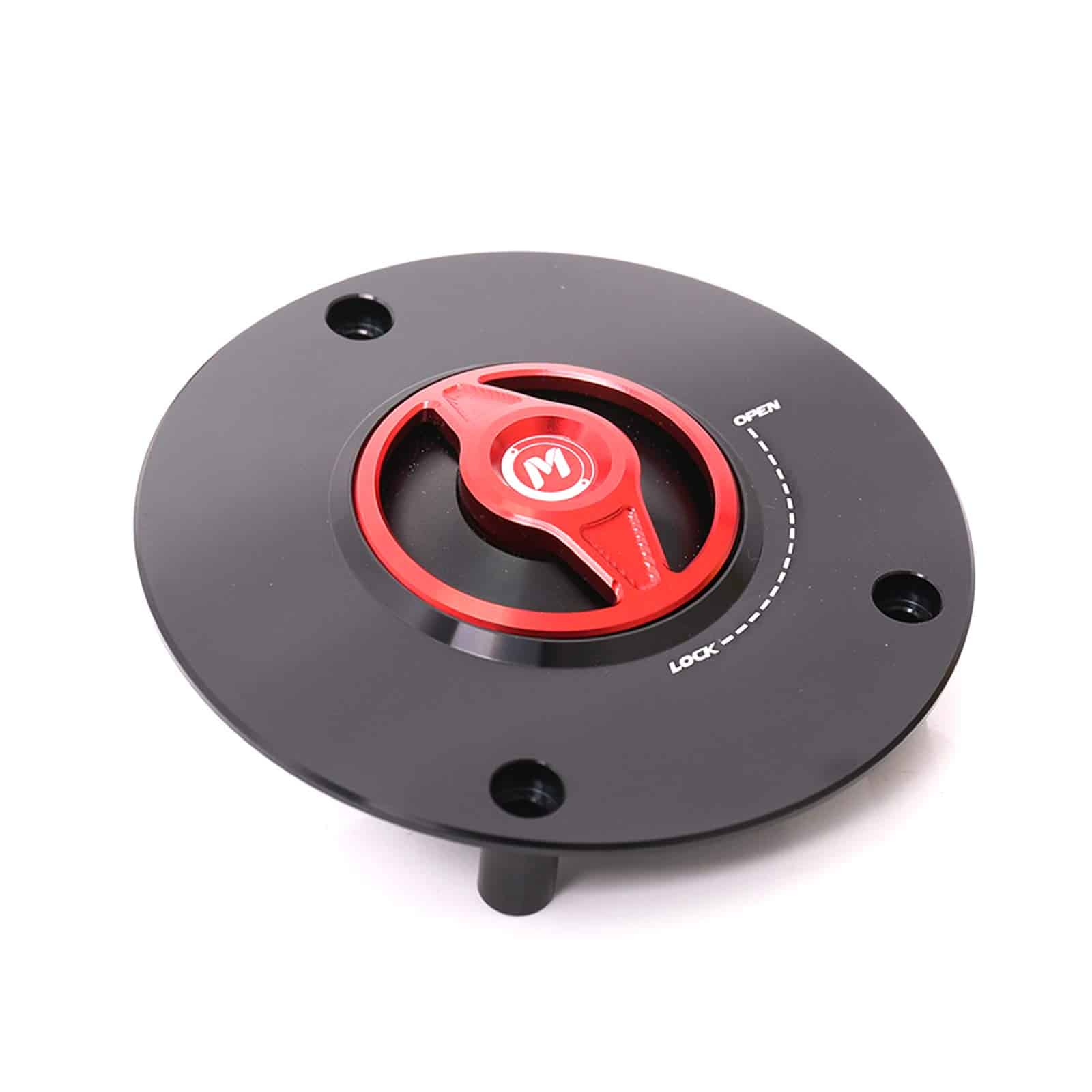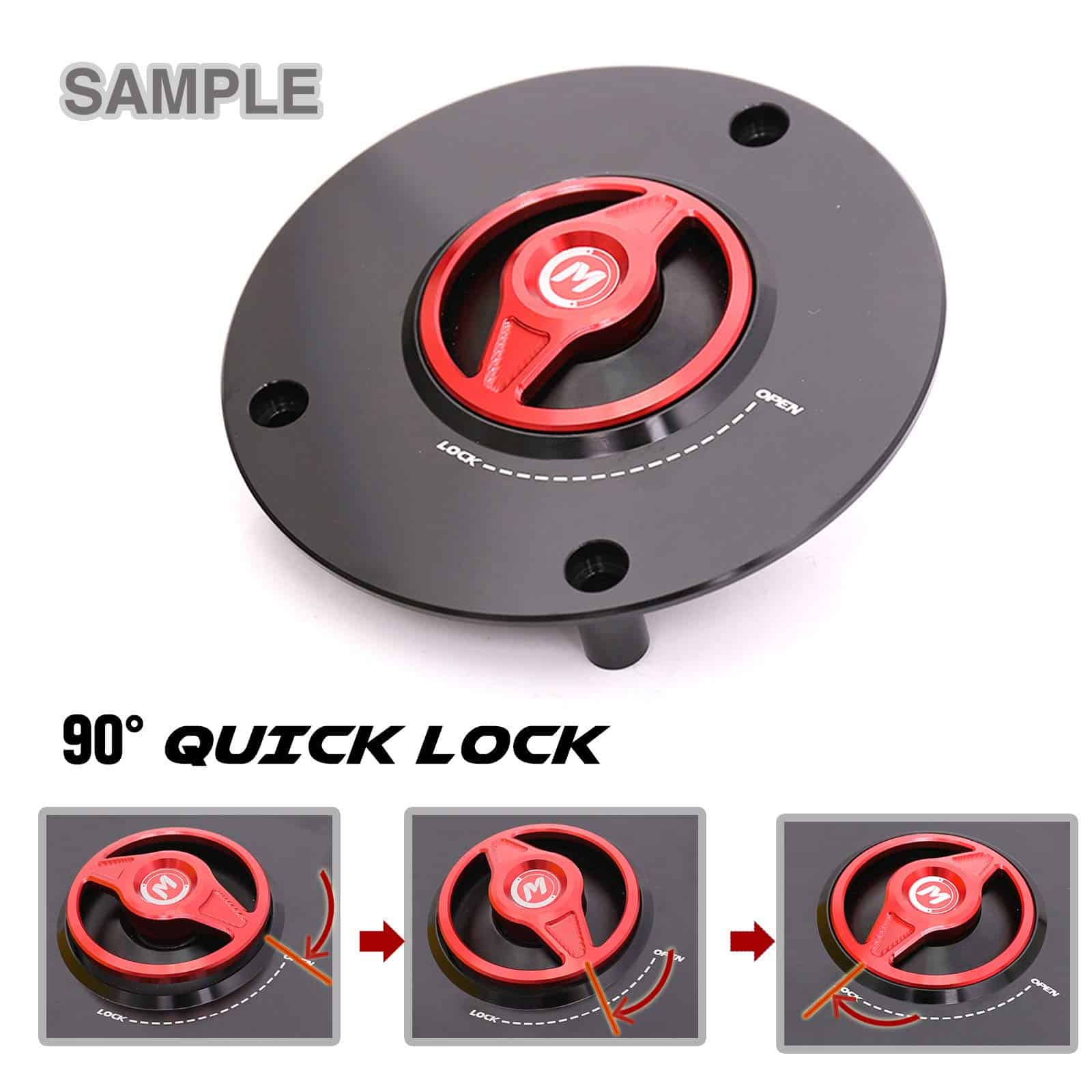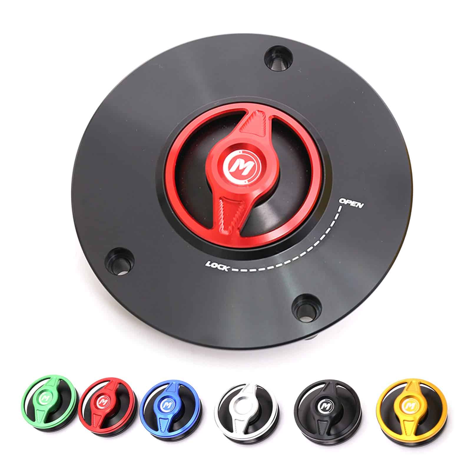 Juego de tapa de combustible de liberación rápida 1/4 de aluminio CNC REVO, diseñado por MC Motoparts. La tapa de combustible de liberación rápida es ideal para corredores y motociclistas de calle de alto rendimiento. Presione la tapa de bloqueo central y gírela para abrir y cerrar suavemente. La tapa de bloqueo está diseñada en una mezcla de colores. Es encantadora y llamativa. FUNCION: Hay un sello de goma y un anillo en O para evitar fugas de aceite. El artículo contiene un sistema de ventilación. La tubería no está incluida. MATERIAL: Mecanizado CNC al 100% de aluminio de alta calidad anodizado duro Fabricado en aluminio de alta calidad. Base de la tapa de combustible negra Tapón de bloqueo central Color: Rojo Cantidad: 1 pieza Si desea otro estilo, por favor busque en nuestra tienda. Para el color, por favor tenga en cuenta que los reflejos de luz pueden afectar ligeramente el tono de color del artículo en la foto frente al producto real.