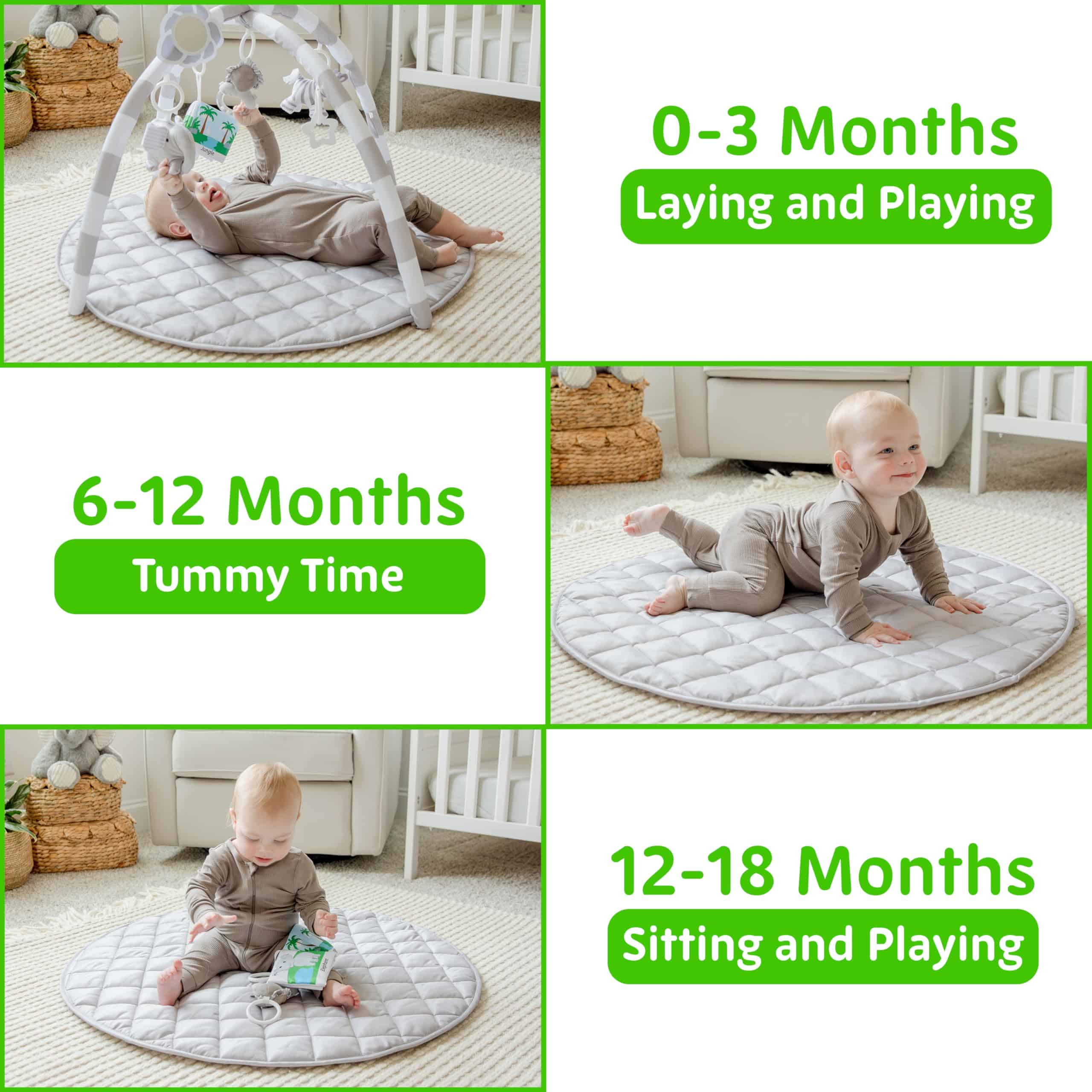 Tapete de Actividades para Bebés SnapPea en color gris. El tapete de juego para bebés de SnapPea Baby Co. es extremadamente suave y acogedor, lo que lo convierte en el lugar perfecto para que los bebés disfruten de su tiempo boca abajo y de juego. Con un grosor de 3/4 pulgadas y un peso de 260gsm, este tapete acolchado ofrece la máxima comodidad para bebés de 0 a 12 meses. Viene con 6 juguetes grises en 3D que son desmontables y proporcionan estimulación táctil y auditiva. Incluye un peluche chirriante de cebra, un libro arrugado y un sonajero, entre otros. Los juguetes están diseñados para estimular los sentidos del bebé y son del tamaño perfecto para sus manitas.