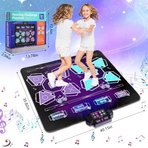 El tapete de baile para niños Hengyarici cuenta con 3 modos de juego: modo de baile doble actualizado, modo de un solo jugador y modo libre. Con un tamaño de 40.16 x 35.83 pulgadas (102 x 91 cm), ofrece un amplio espacio para que los niños puedan bailar libremente. Las luces LED se iluminarán al azar con la música, despertando el interés de los niños, ejercitando su capacidad de reacción y permitiéndoles disfrutarlo. Además, cuenta con 3 niveles de dificultad crecientes y 8 canciones para elegir. El tapete de baile está hecho de material PE respetuoso con el medio ambiente, suave y acolchado, con una superficie impermeable y fácil de limpiar. Dispone de rayas antideslizantes en la parte inferior y ha pasado pruebas estándar CPSIA y ASTM, lo que garantiza su durabilidad y seguridad. Los niños pueden pisar el tapete siguiendo los puntos de tempo, lo que les permite aprender y desarrollar un sentido de ritmo musical. Además, es portátil y se puede llevar fácilmente a cualquier lugar. Un regalo único para Navidad, Año Nuevo y cumpleaños, que seguramente cautivará a los niños. ¡Fomenta la relación entre padres e hijos y la amistad entre niños, y brinda diversión sencilla y fácil de comenzar!