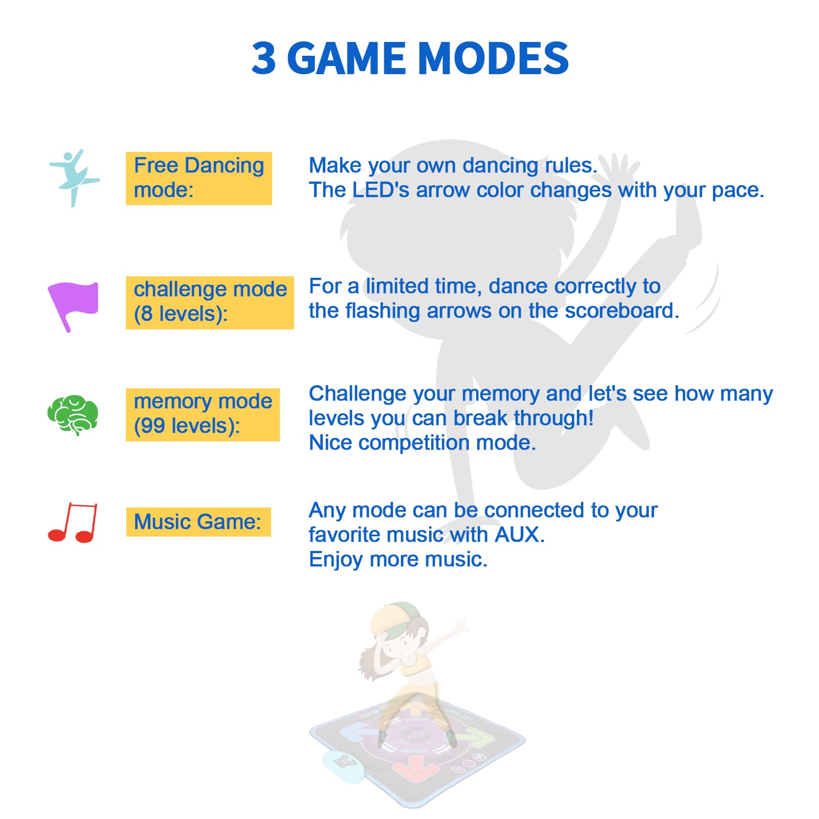 El tapete de baile cuenta con 3 modos de juego emocionantes. Los niños pueden elegir entre Estilo Libre en Baile, Desafío con 8 niveles de dificultad y Memoria con 99 niveles para mejorar su memoria y coordinación mano-pie. Además, el tapete de baile tiene un diseño AUX que permite conectar su música favorita para una experiencia más personalizada.
