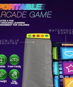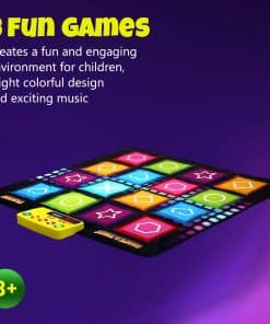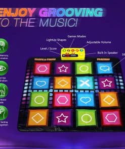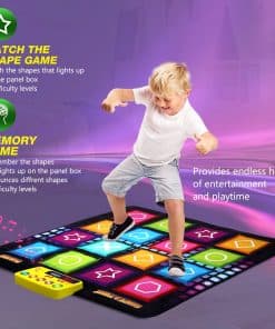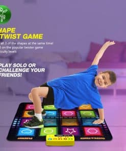 Nuestro Tapete de Baile cuenta con una matriz 4×4 de paneles de formas coloridos. Esto se coordina con la mecánica del juego. Tus hijos pueden jugar: Juego de Combinar la Forma Juego de Forma & Twist Juego de Memoria