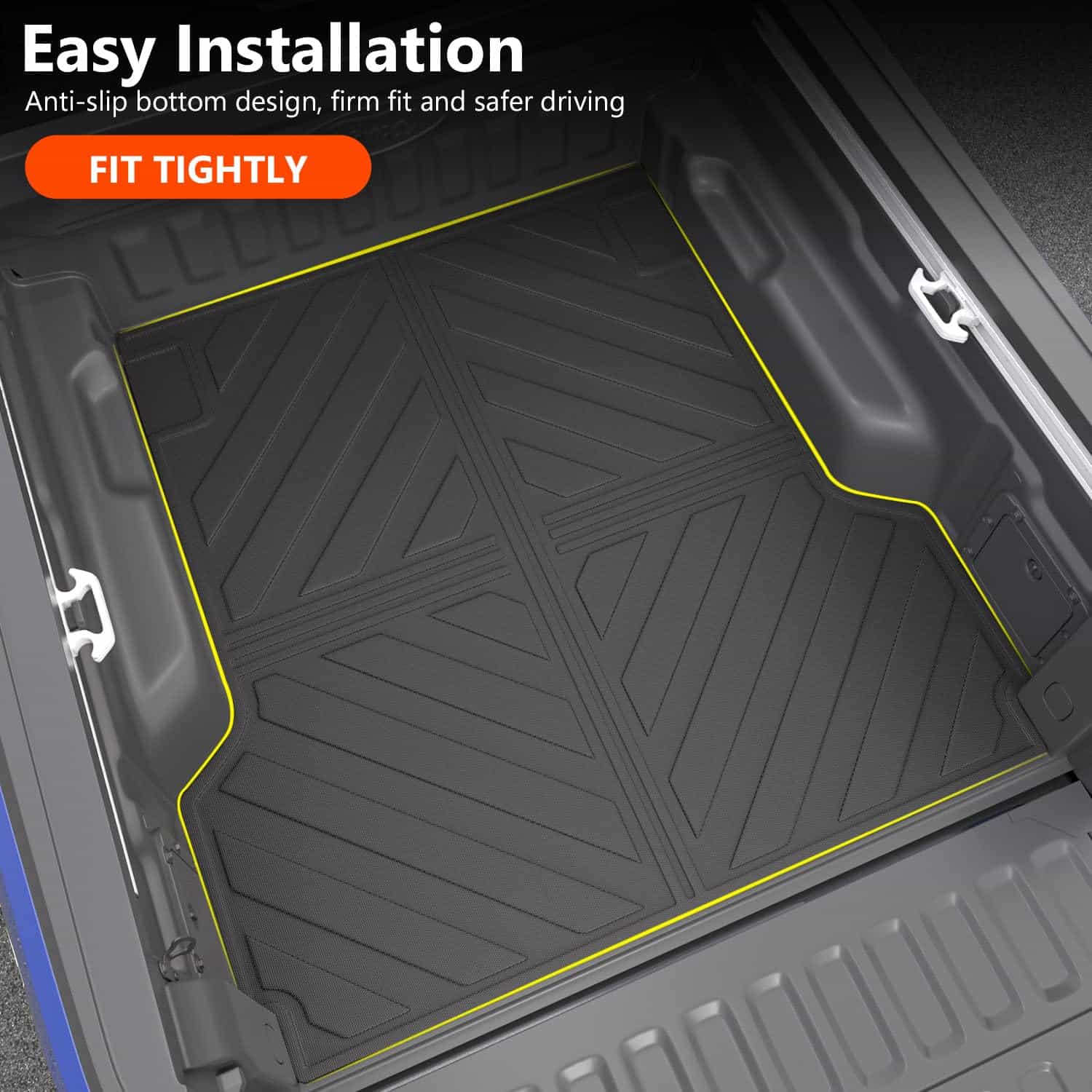 4. Instalación Sencilla: El tapete de carga es muy fácil de instalar y quitar. Simplemente colóquelo en la cama de su camión y ajuste la posición sin necesidad de herramientas. Tenga en cuenta que si su coche es una versión híbrida, deberá cortar dos pequeños cuadrados de este tapete. El tapete tiene una línea de corte clara y puede cortar a lo largo de la línea.