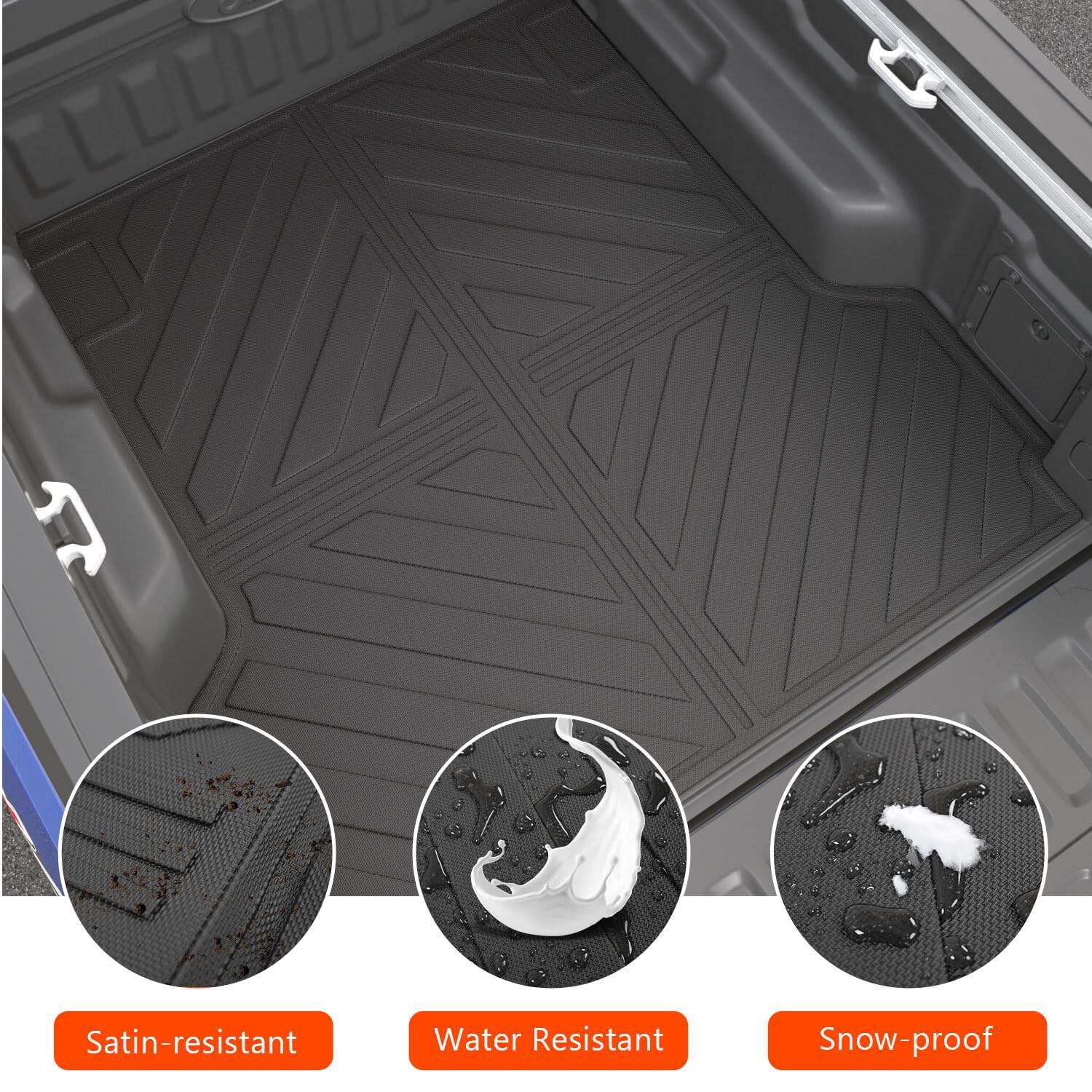 2. Material de Alta Calidad: El tapete de cama de camión está hecho de material TPE de alta calidad, que es resistente a los arañazos, duradero y no tiene mal olor. Incluso si se dobla fuerte, no se estropeará fácilmente. Nuestro protector de cama de carga puede soportar todo tipo de clima extremo, como días de lluvia intensa o tormentas de nieve, etc. Puede limpiar los tapetes con agua y un trapo.