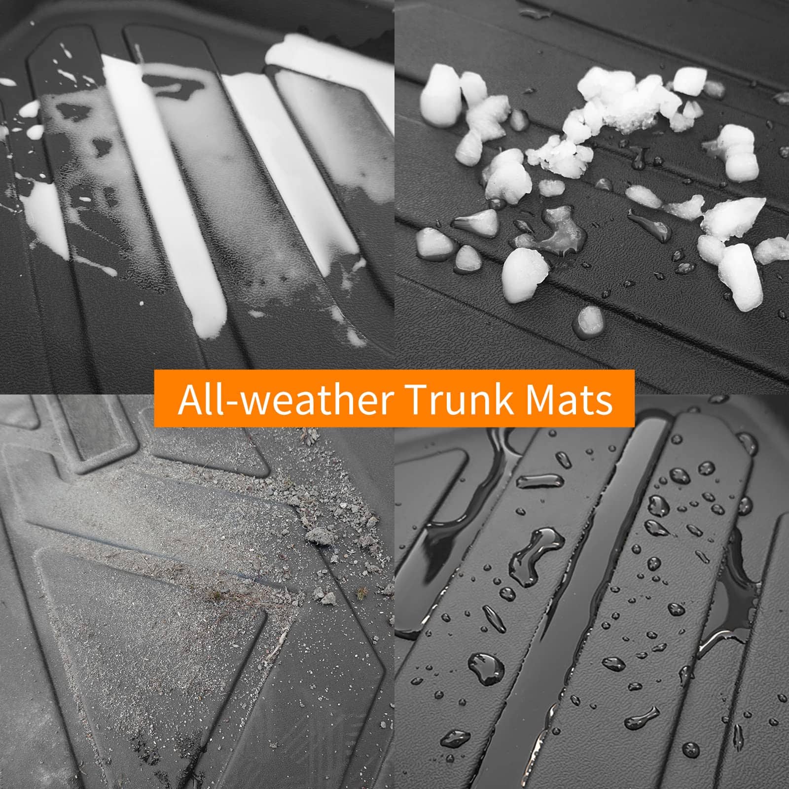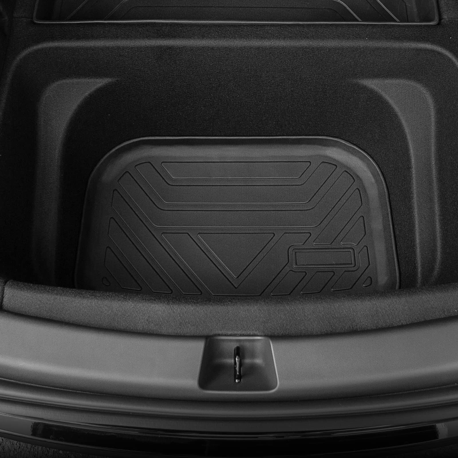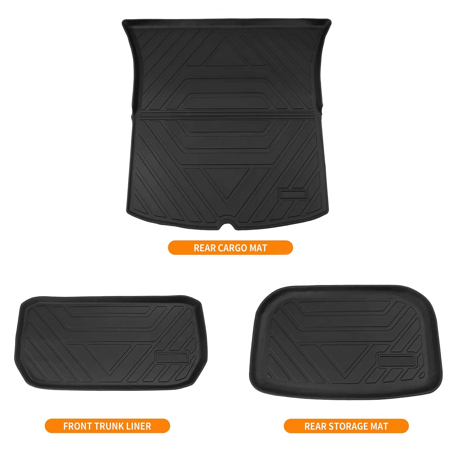 2. Set: Un total de tres piezas, incluida la alfombra del maletero delantero, la alfombra de almacenamiento trasero y la alfombra del maletero trasero.