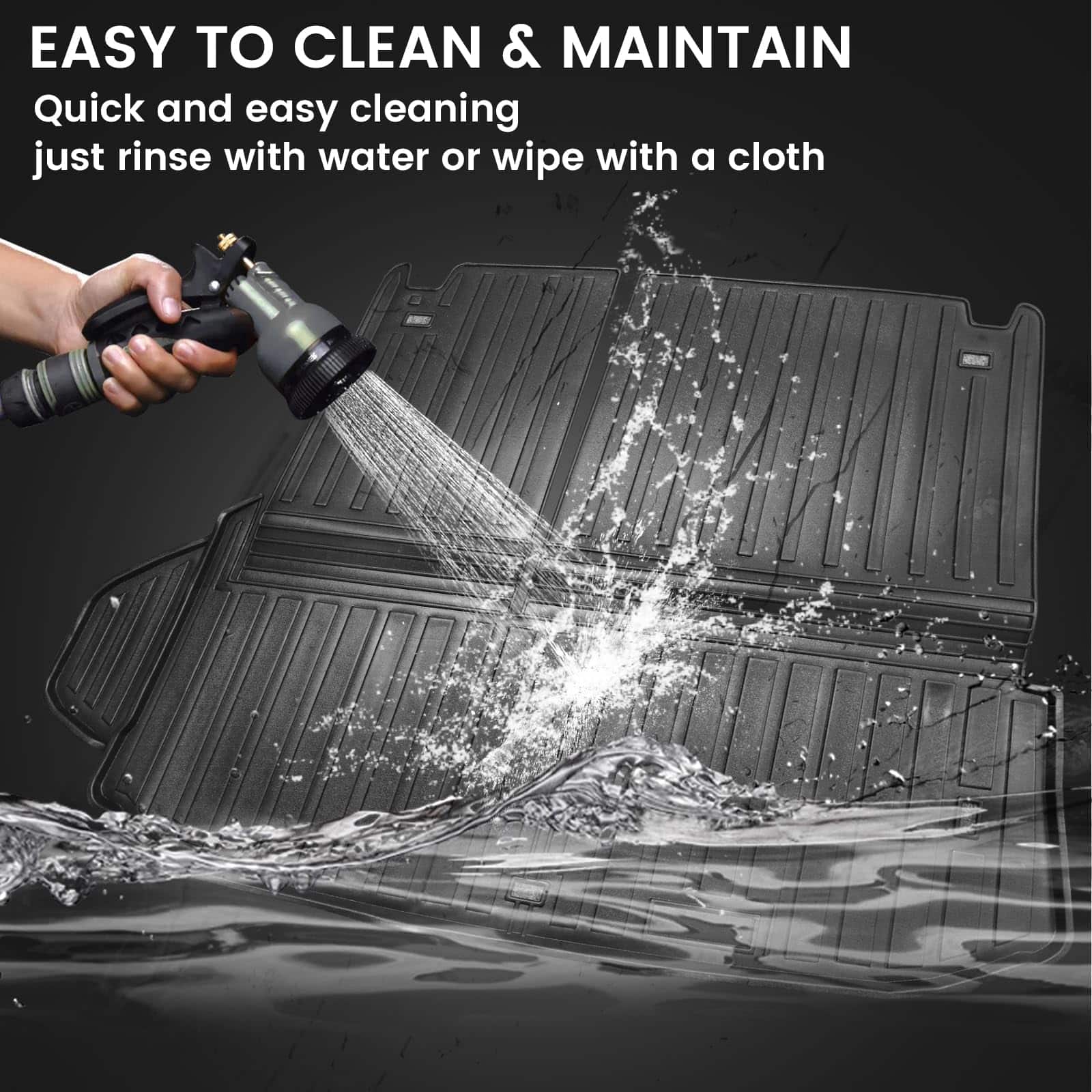 4.Fácil de Limpiar e Instalar: Los tapetes para maletero mantienen sus pisos limpios y no han filtrado agua o arena, a pesar de la temporada de primavera lluviosa. Simplemente agítelos o rocíelos con una manguera.