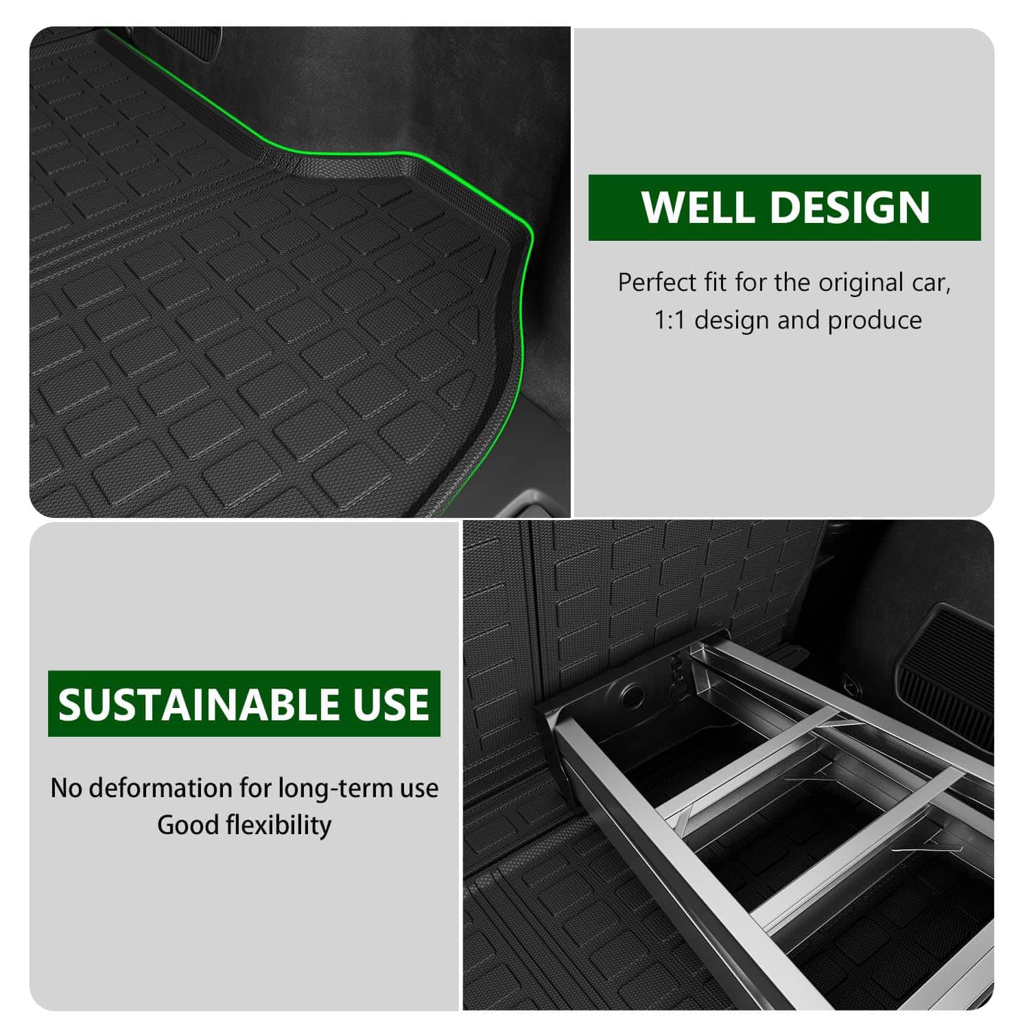 3. Función: Los revestimientos de carga pueden proteger mucho mejor el coche original. La textura de la superficie convexa puede aumentar la fricción de los objetos, por lo que los artículos se pueden colocar suavemente. No tiene que preocuparse por golpes y apretones. Las familias con mascotas tampoco tienen que preocuparse por los arañazos visibles.