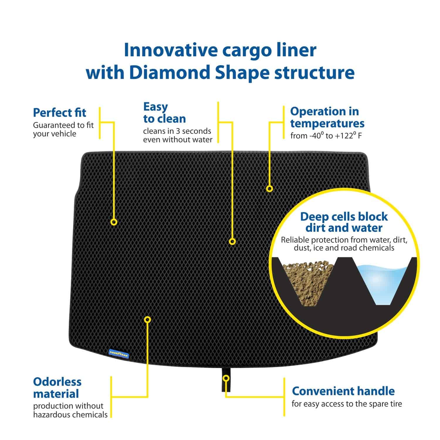 ¿Por qué elegir el Tapete de Carga de Goodyear? Hemos diseñado estos tapetes de carga resistentes porque entendemos la importancia de mantener limpio y protegido tu maletero y tus objetos de valor. ¡Nuestra empresa quiere ayudarte a tener una vida cómoda y feliz! Fabricados con Cuidado. Estos revestimientos de maletero están fabricados con el mayor cuidado a partir de los materiales de mayor calidad y más seguros de la industria. Se prueban o inspeccionan hasta 20 veces durante el proceso de fabricación para mantener la calidad y rendimiento óptimos. Por eso, puedes pedirlos con confianza. 1 en Servicio al Cliente. El servicio al cliente es una de nuestras principales prioridades aquí en Goodyear. Sabemos que te encantará este tapete de carga antideslizante de forma de diamante, pero si por alguna razón no lo haces, simplemente contáctanos y avísanos. Nuestra empresa te responderá rápidamente y te ofrecerá un reembolso completo y pagará el envío de devolución, ¡sin hacer preguntas! Fácil de Limpiar. Para una limpieza simple y rápida, saca el revestimiento de tu vehículo, sacúdelo con unos cuantos golpes rápidos en la parte posterior. Para una limpieza más exhaustiva, siéntete libre de usar una manguera, ¡luego déjalo secar! Los revestimientos de carga de Goodyear están desarrollados para adaptarse al diseño exacto del maletero de tu vehículo para proporcionar cobertura de superficie completa y máxima protección. También son 2 veces más ligeros que otros tapetes de carga para un fácil acceso.