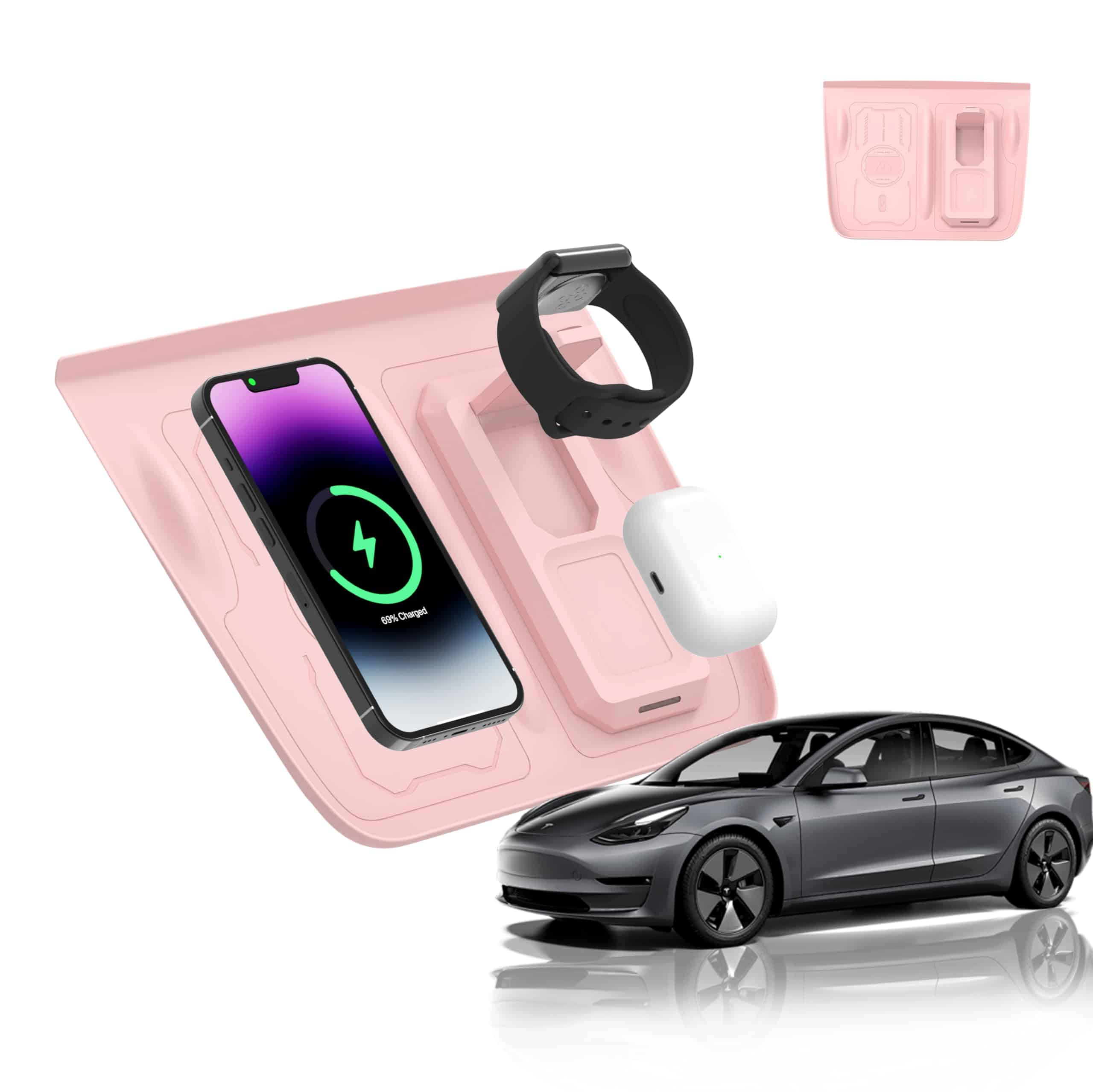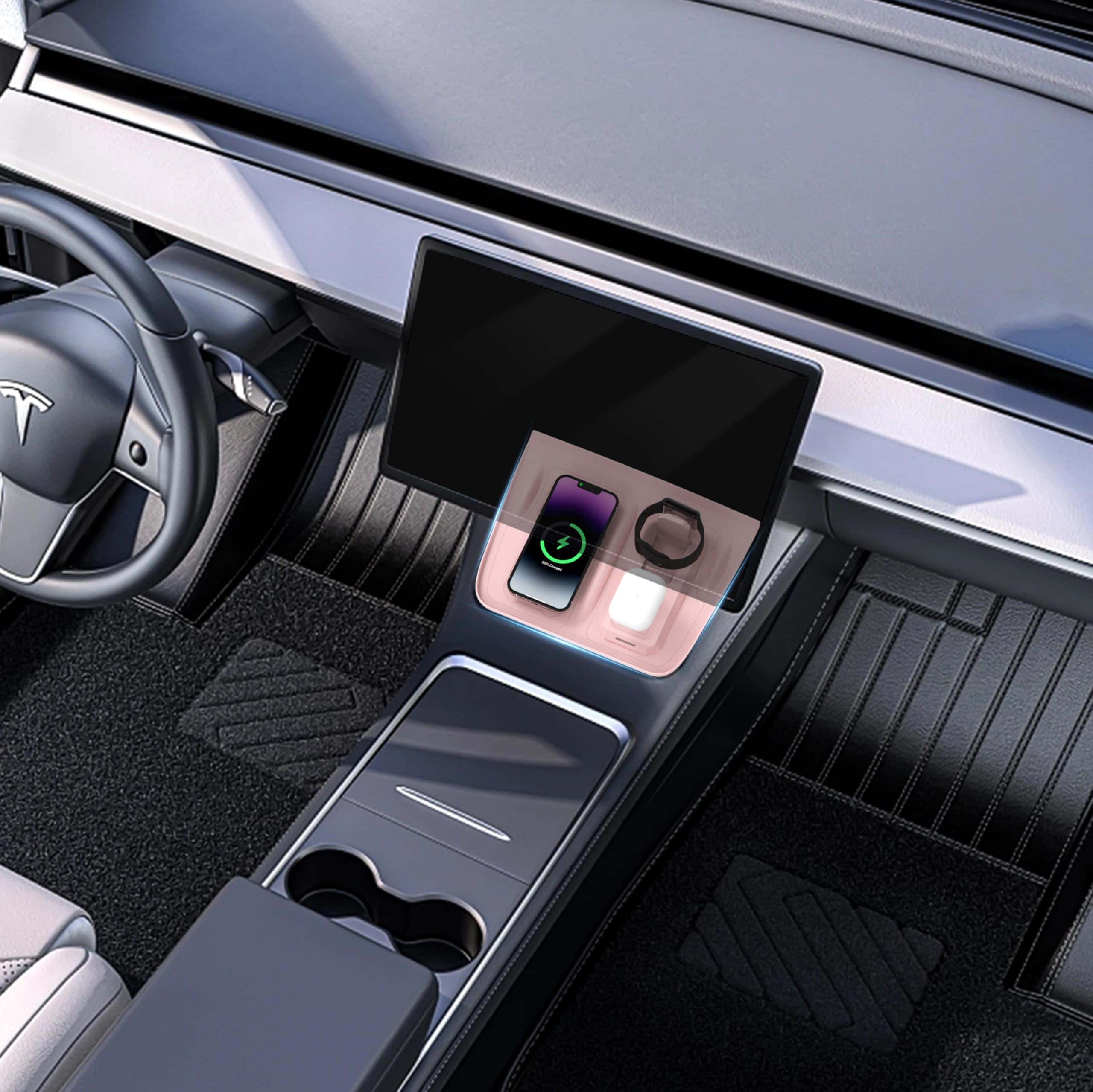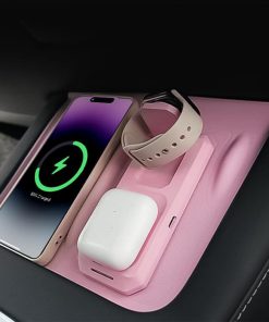 El tapete de carga inalámbrica 3 en 1 Fannasi es el complemento perfecto para tu Tesla Model Y&Model 3(2021-2023). Con su compatibilidad con múltiples dispositivos, podrás cargar tu teléfono inteligente, smartwatch y auriculares inalámbricos de forma simultánea, cubriendo todas tus necesidades de carga en un solo lugar. Además, su diseño a medida se adapta perfectamente al interior de los modelos Y y 3, garantizando un ajuste sin inconvenientes y sin ocupar espacio adicional. Fabricado con material de silicona premium, este tapete ofrece un rendimiento antideslizante superior y una durabilidad de larga duración, manteniendo tus dispositivos estables y seguros mientras se cargan. Además, gracias a su tecnología de carga inalámbrica rápida, podrás alimentar tus dispositivos de manera rápida y eficiente. No pierdas más tiempo con cables enredados, simplemente coloca tus dispositivos en el tapete y comienza a cargar de forma sencilla y conveniente.