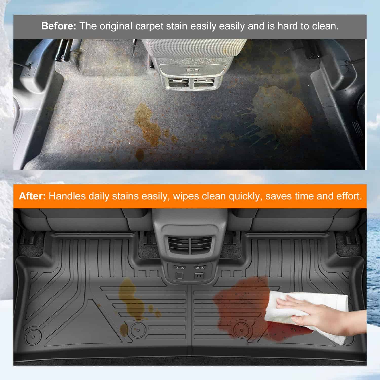 El tapete de carga es compatible con la Chevy Equinox y la GMC Terrain 2025, sin asiento trasero, y es un reemplazo ideal para los accesorios de la Chevy Equinox. Está diseñado para adaptarse perfectamente a los automóviles originales, por lo que debe verificar cuidadosamente su modelo de vehículo antes de realizar la compra. Fabricado con material TPE de alta calidad, este tapete es resistente a los arañazos, flexible y no emite malos olores. Puede soportar diversas condiciones climáticas extremas y es fácil de limpiar con agua y un paño. El tapete proporciona una protección completa a la parte trasera del maletero de su vehículo, evitando la acumulación de suciedad y daños. Además, ayudará a mantener el interior de su automóvil limpio, ya que protege tanto el asiento trasero como el piso de la acumulación de polvo, barro, agua, nieve y escombros que entran con los zapatos. La instalación es sencilla y no requiere herramientas, ya que se puede colocar fácilmente en su automóvil. El tapete de carga cuenta con un sistema de velcro en la parte trasera para un desmontaje fácil y seguro. Los forros de piso también vienen con clips para mantenerlos en su lugar, evitando así que se muevan. Si tiene alguna pregunta o problema con el producto, no dude en ponerse en contacto con nosotros, estaremos encantados de ayudarle y resolver cualquier inconveniente que pueda surgir.