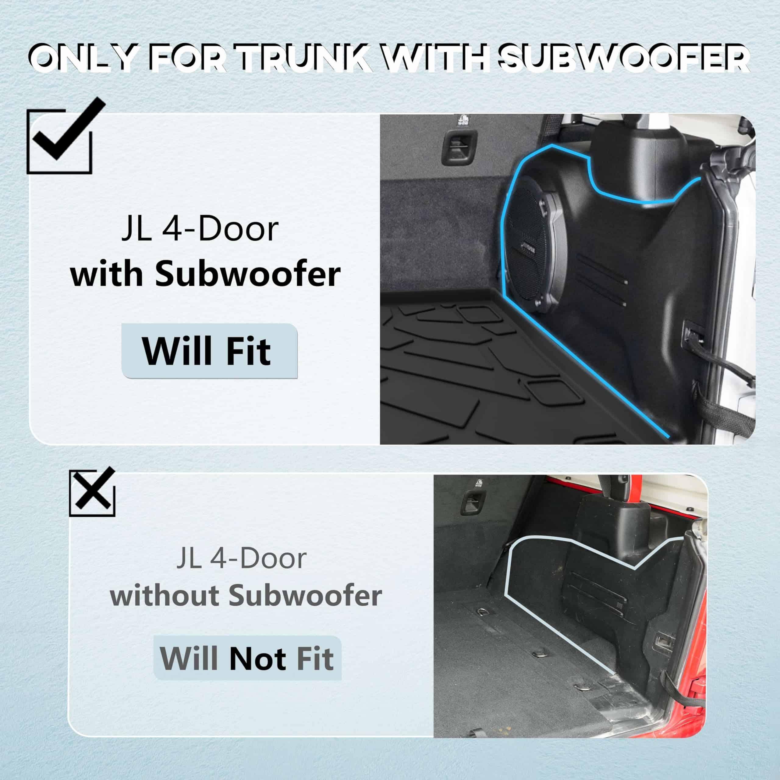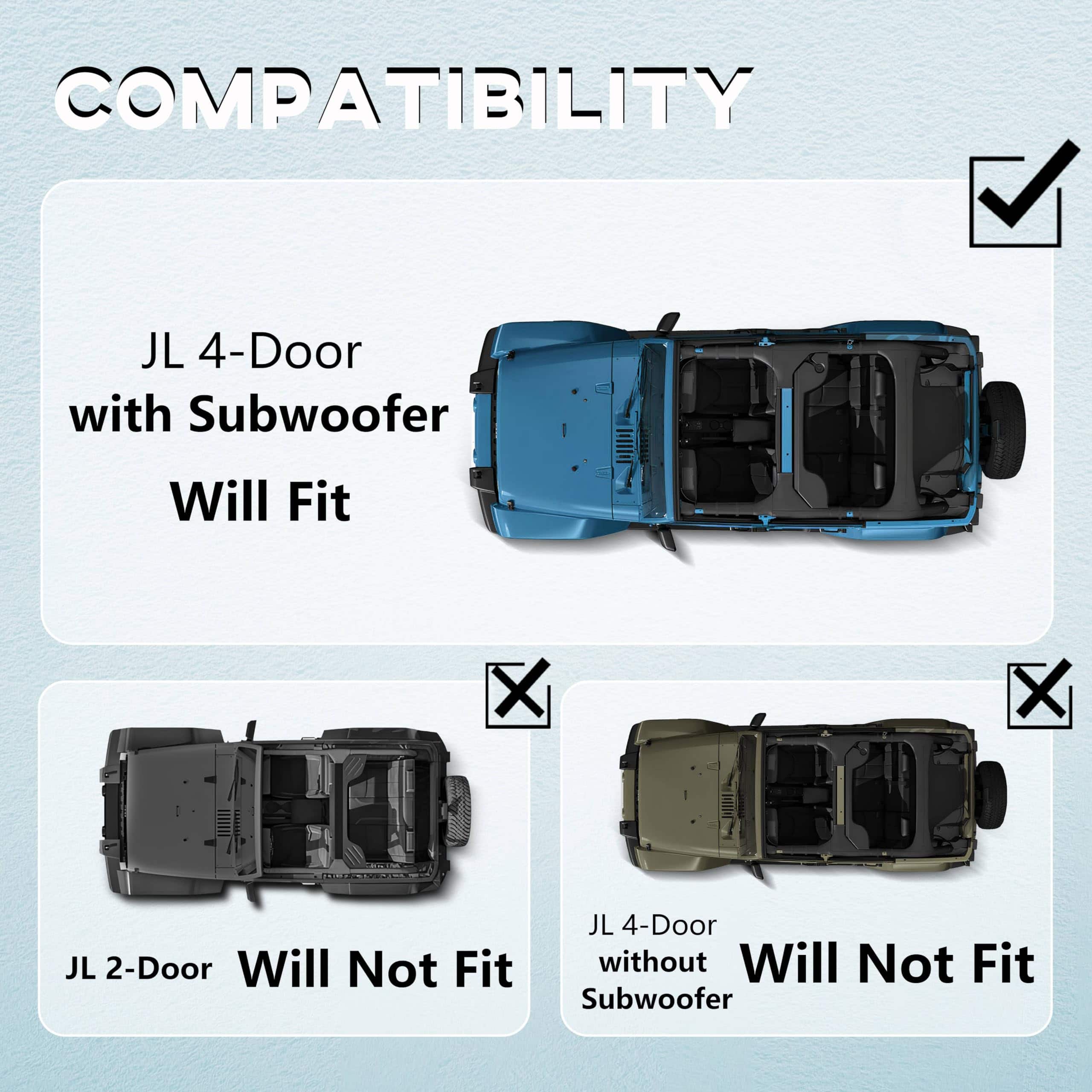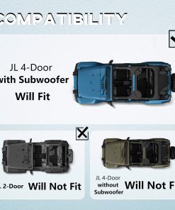 1. SOLO PARA – Solo para Jeep Wrangler 4-Door JL Unlimited con subwoofer 2018 2019 2020 2021 2022 2023 2024 (NO es para JK o 4XE) . Antes de realizar un pedido, verifique cuidadosamente su modelo de vehículo.