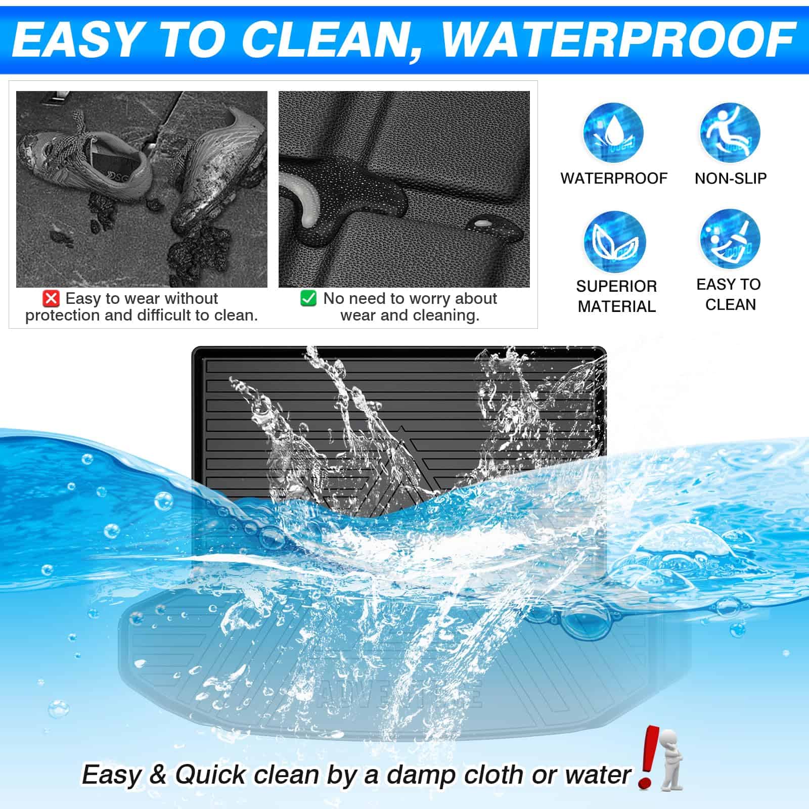 3. Antideslizante e Impermeable – Proporciona protección antideslizante e impermeable para evitar que las cosas se muevan mientras conduce y cualquier daño a su revestimiento de maletero para una protección total de la carga. No se preocupe por alguna parte con agua, nieve, hielo, suciedad, grasa, bebida que ensucie su automóvil. Solo se necesitan 5 minutos para completar la limpieza de los tapetes de carga los fines de semana.