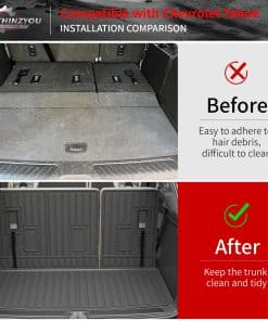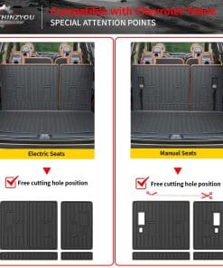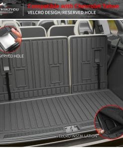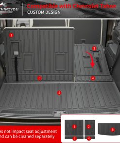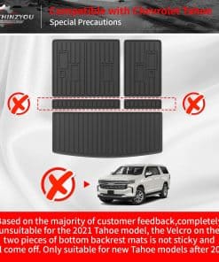 1. Ajuste: Nuestro tapete de maletero y tapetes para respaldo son adecuados para Chevrolet Tahoe y GMC Yukon 2022 2023 2025 detrás de los asientos de la 3ra fila. También son universales para asientos manuales y eléctricos. NOTA: No es compatible con modelos Yukon XL ni con Suburban.