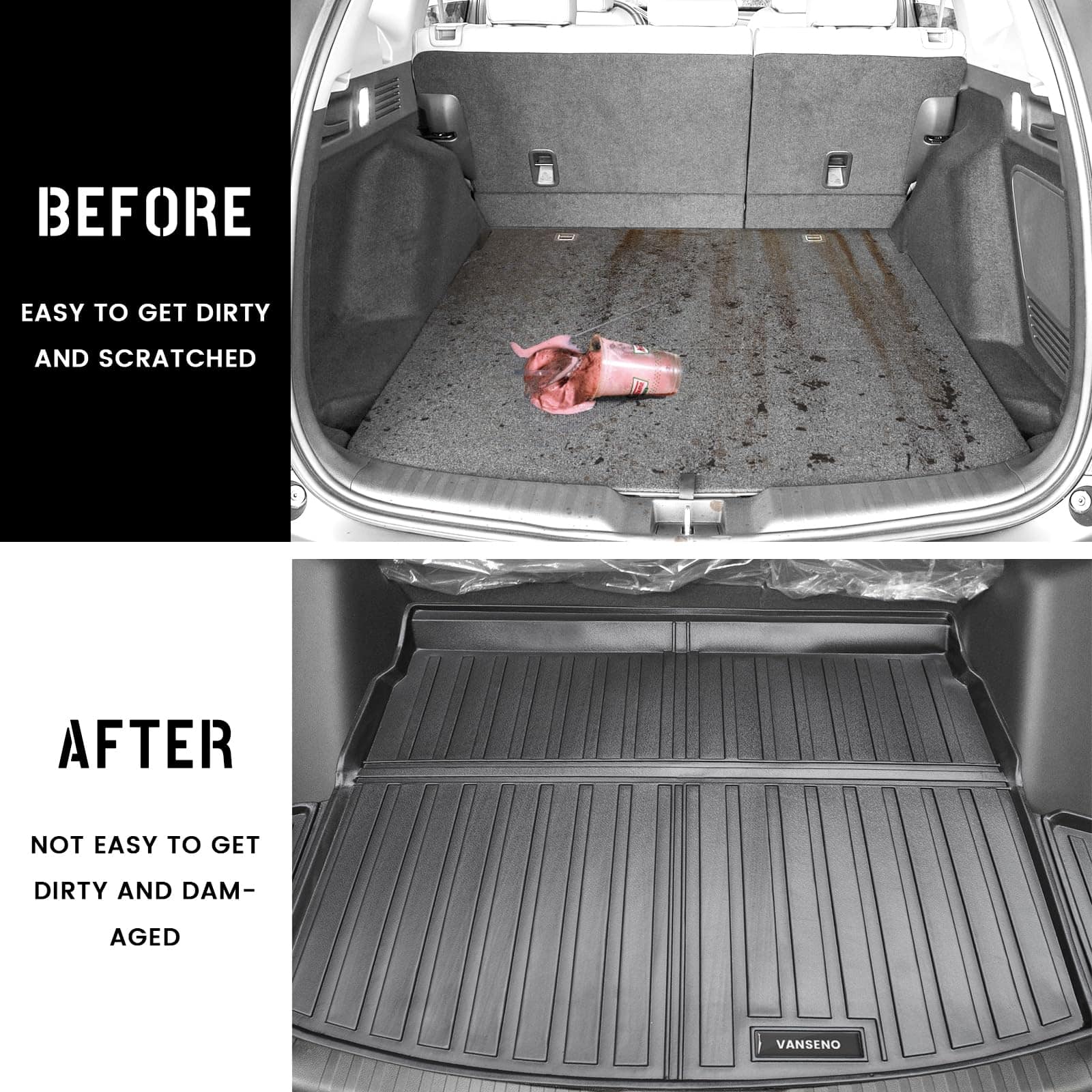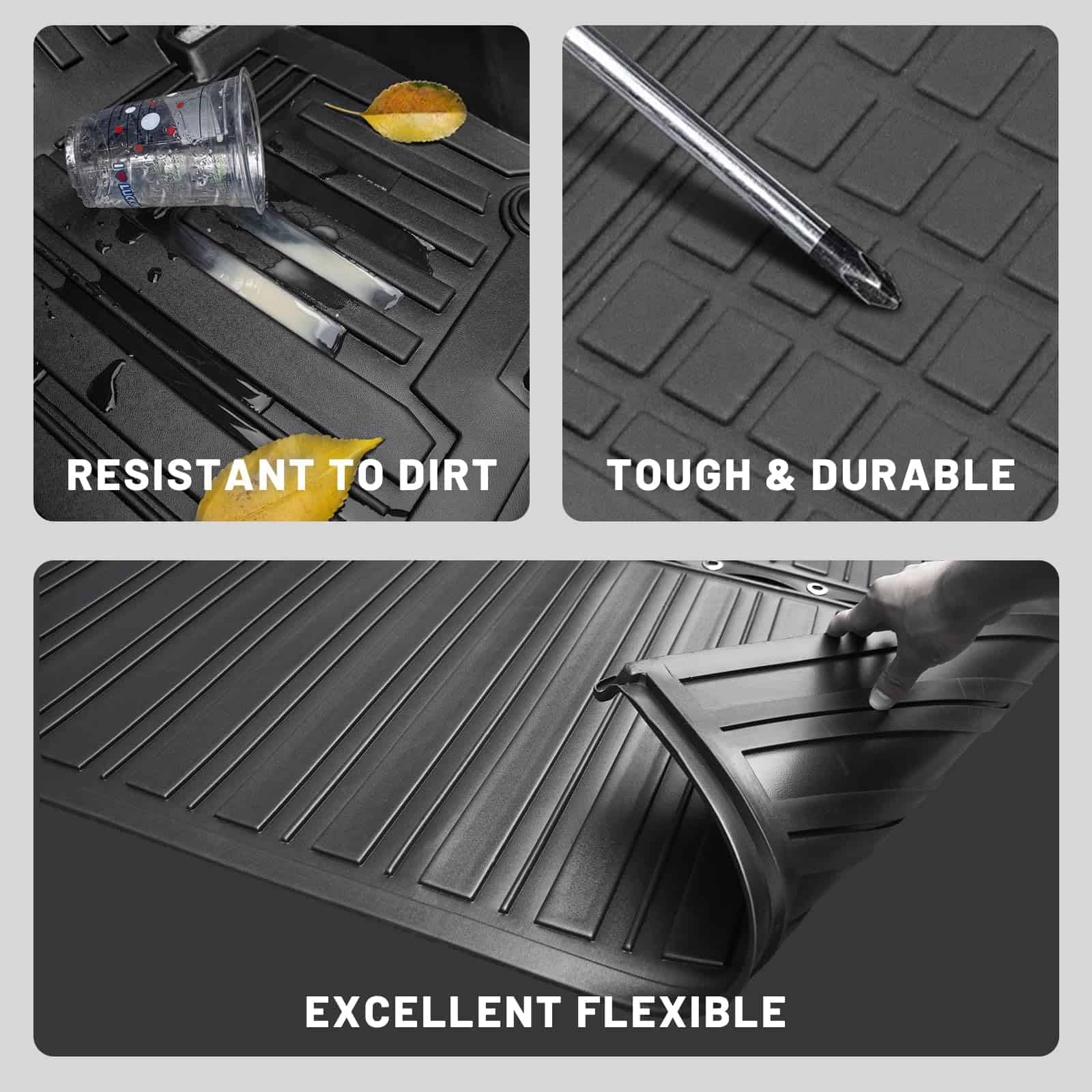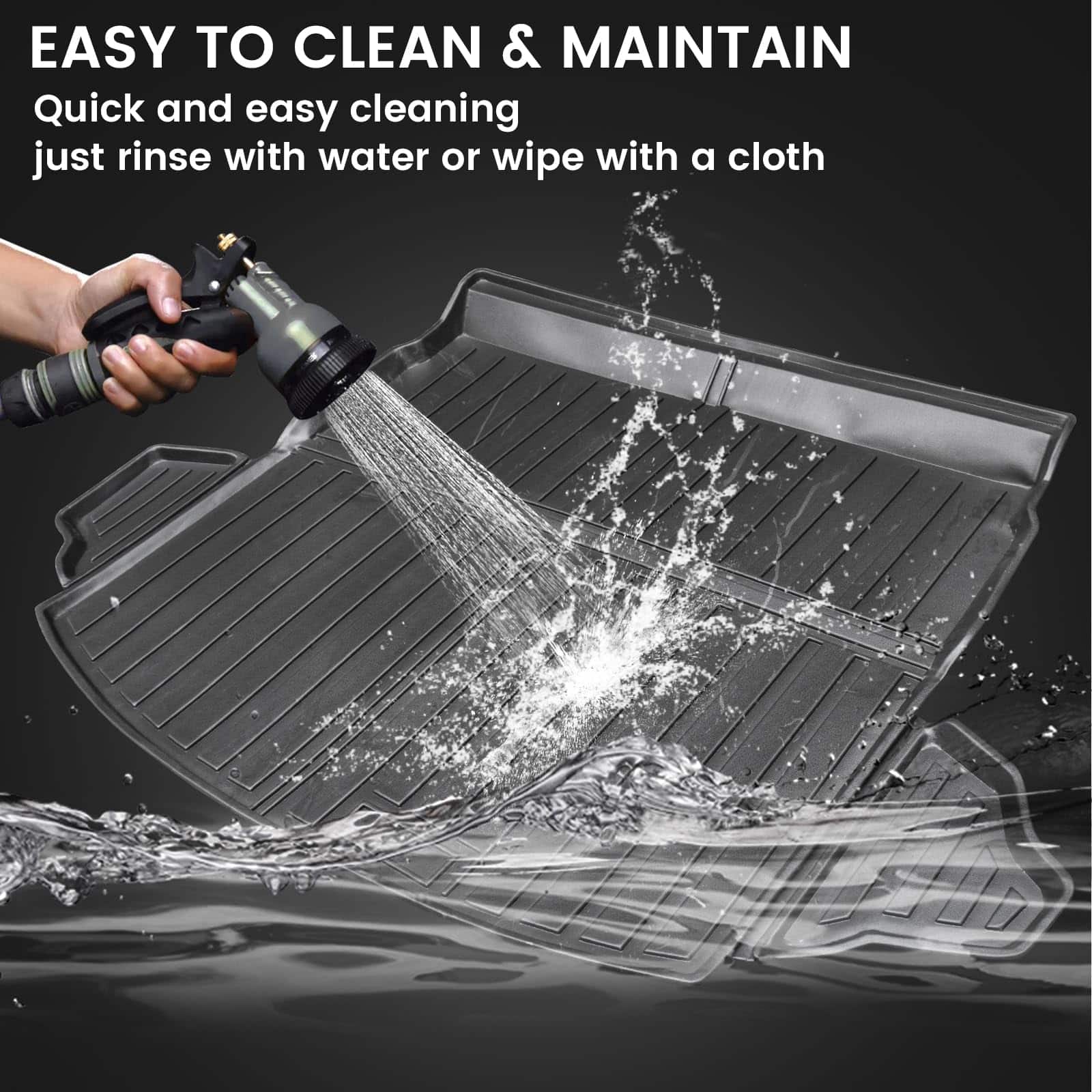 4. Instalación Fácil: El tapete de maletero mantiene sus pisos limpios y no han filtrado agua o arena, etc., a pesar de la temporada de primavera lluviosa. Simplemente sacúdelos o lávalos con una manguera.