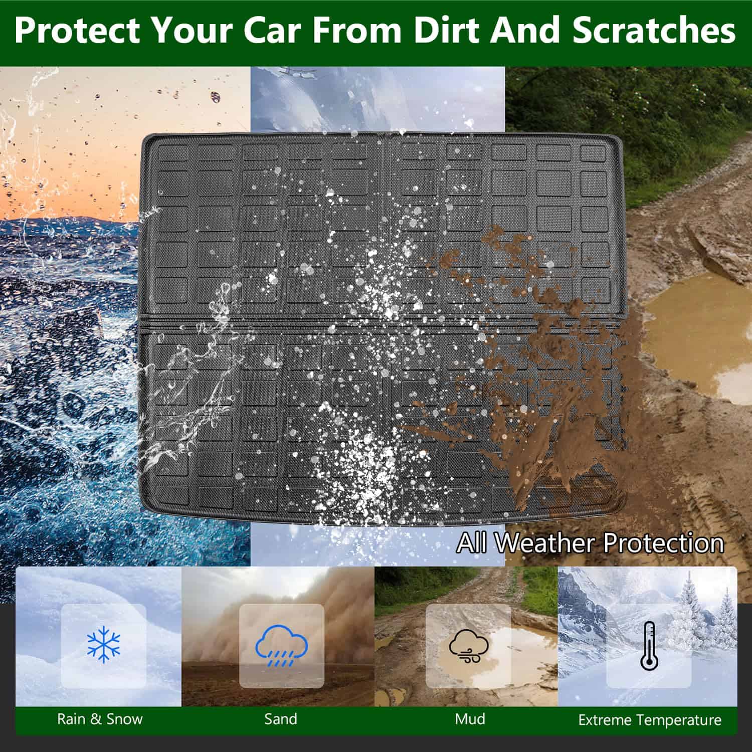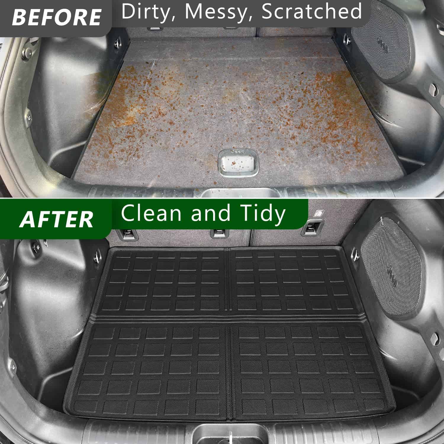 4. Limpieza Enjuague con agua o limpie con un paño húmedo para eliminar la suciedad, el barro, el pelo y otros residuos. Nuestro revestimiento impermeable para maletero es fácil de limpiar y mantener.