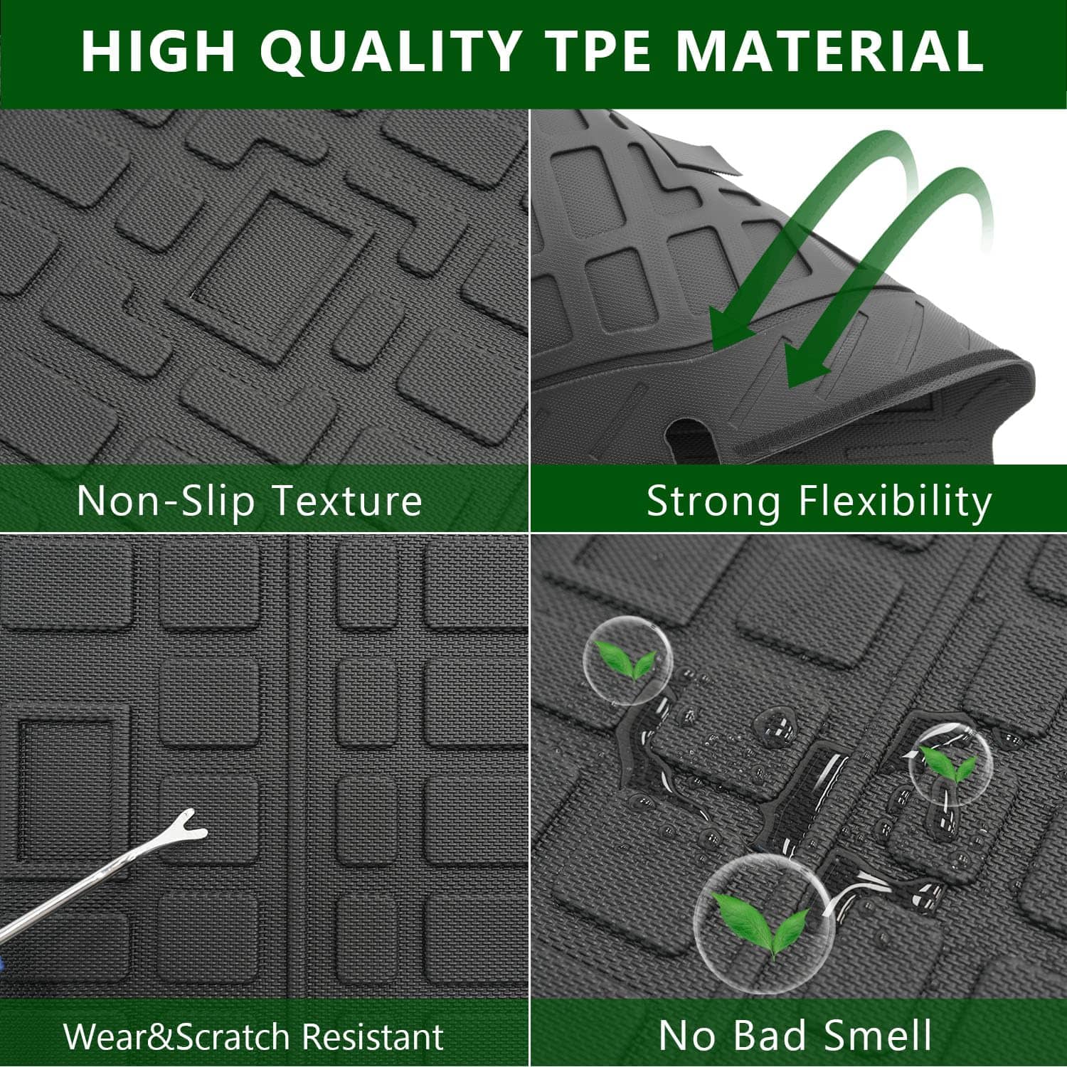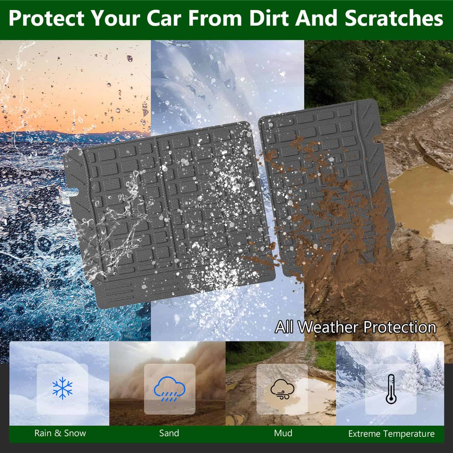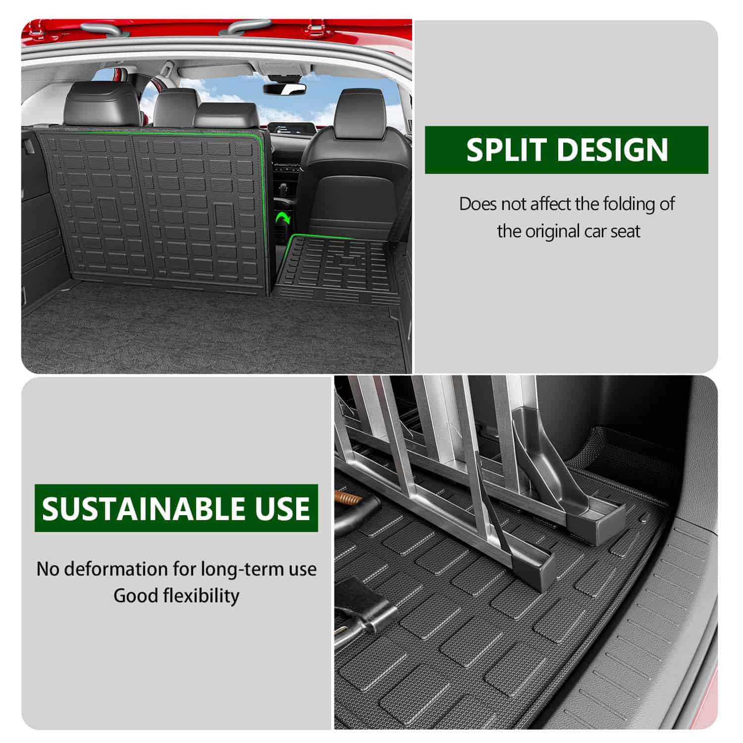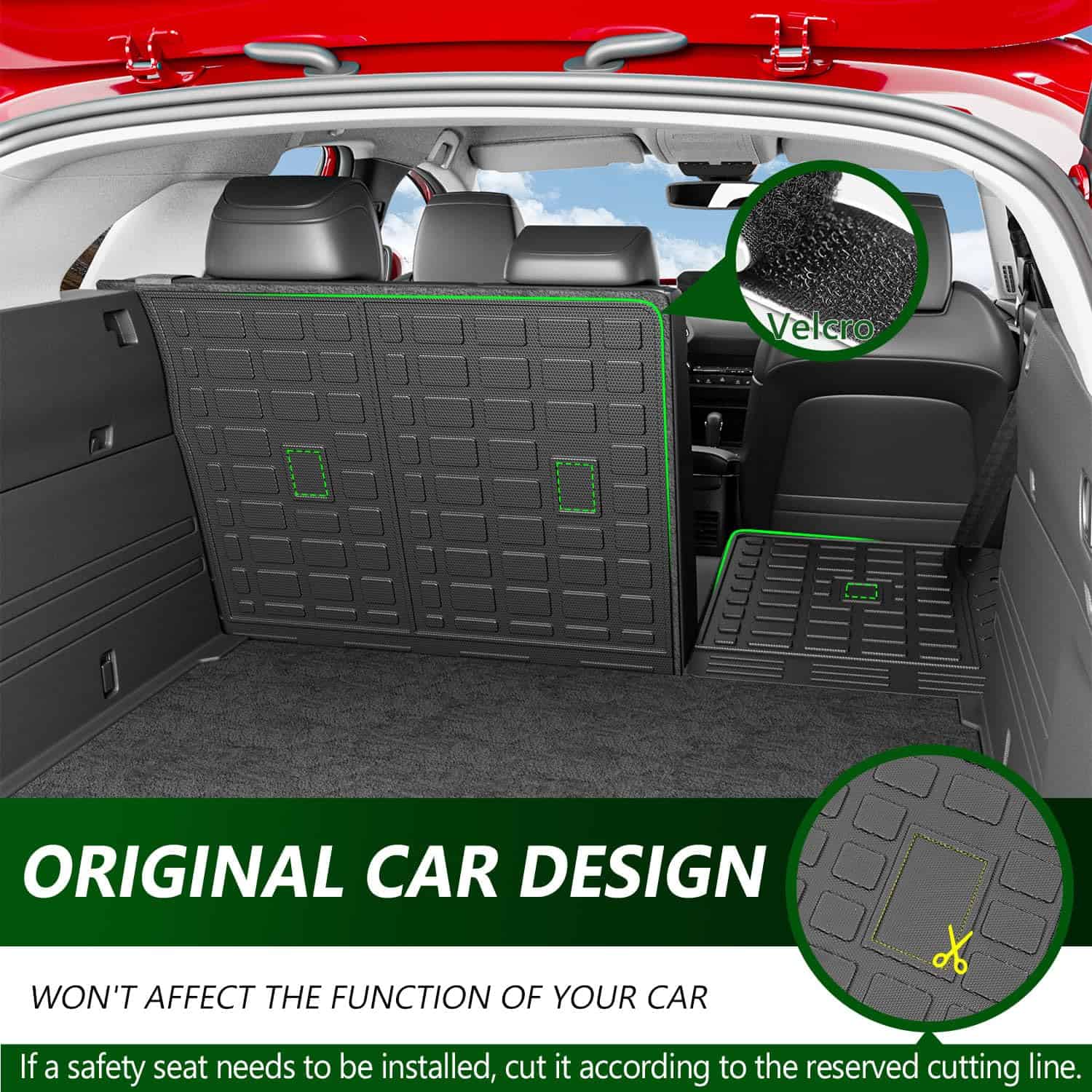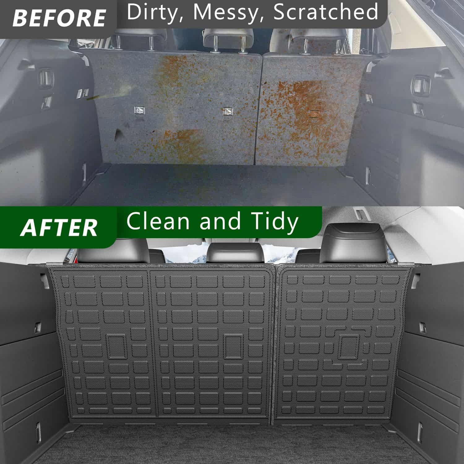 Además de proteger la parte trasera de los asientos, las alfombras de carga cambian la apariencia de su vehículo. El patrón de grano de arroz aumenta la fricción y evita arañazos en el respaldo. La limpieza de esta alfombra es muy sencilla, ya que solo necesita limpiarse con un paño húmedo o enjuagarse con agua. La instalación es fácil y no requiere herramientas adicionales, ya que las alfombras vienen con velcro para sujeción.