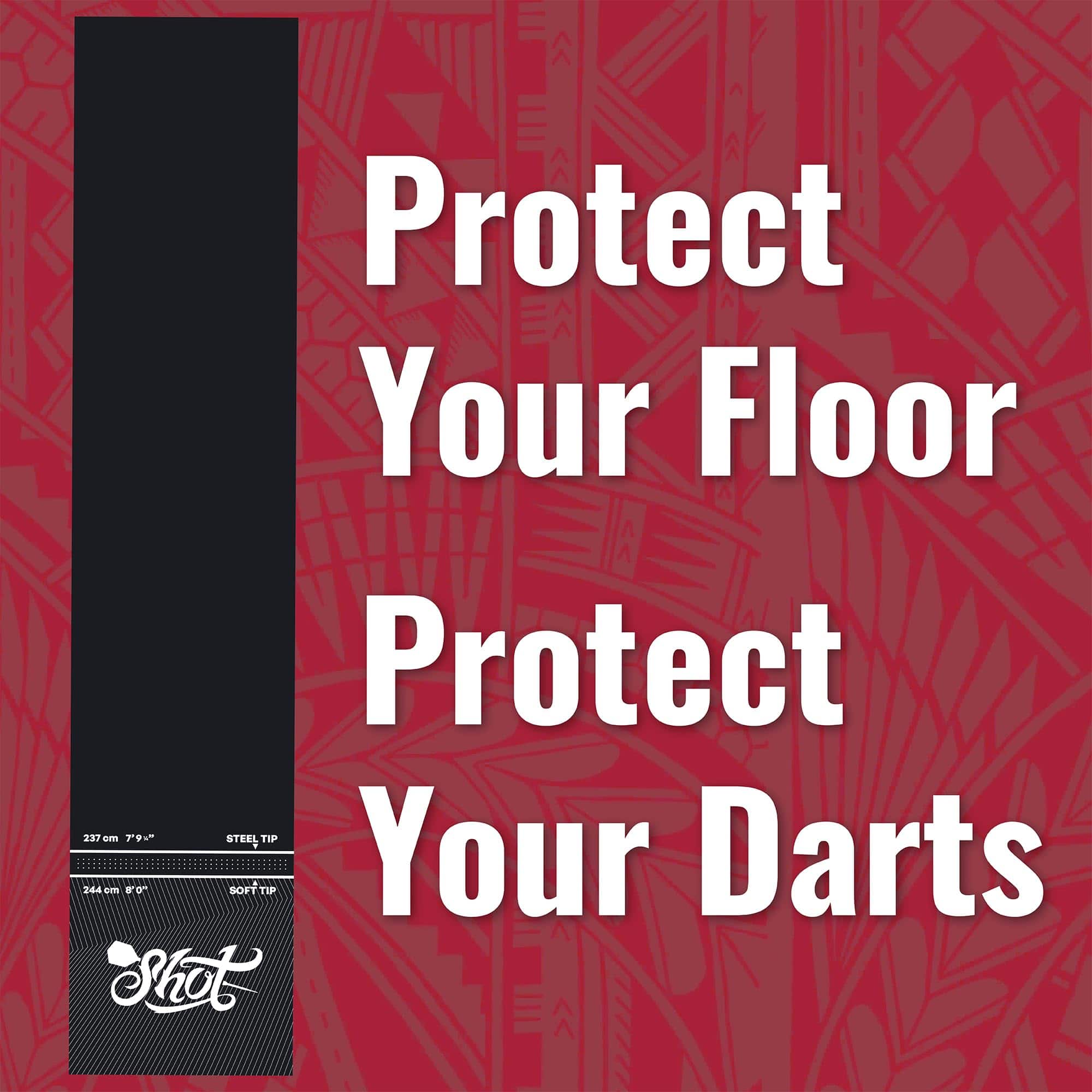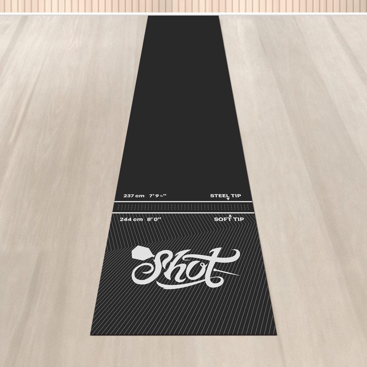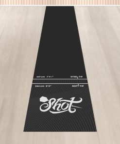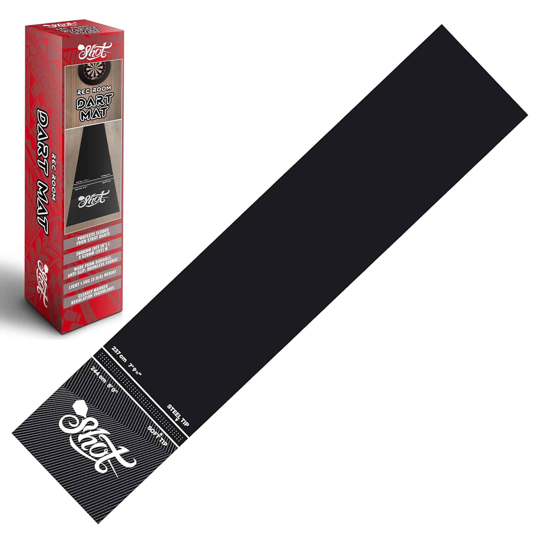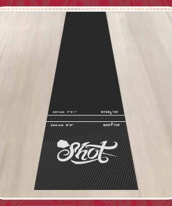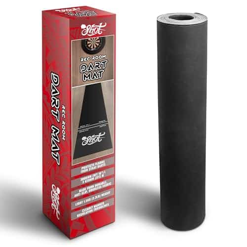 Use este tapete de dardos profesional y resistente para proteger su suelo de los dardos errantes. Con tan solo 6 libras de peso, el Tapete Shot Darts Rec Room no se moverá ni deslizará por el suelo y se mantendrá firmemente en su lugar. Protege dardos de punta de acero o de punta blanda, evite piezas rotas cuando los dardos rebotan fuera del tablero de dardos hacia el suelo. Con medidas de 9ft 9″ (2995mm) L x 2ft (625mm) W, el portátil Tapete de Dardos Shot no se riza en los extremos. ¡No se necesita ningún período de adaptación molesto! Úselo inmediatamente en el carril de dardos configurado en la cueva del hombre, sala de juegos o recámara. Protección adicional adecuada para todos los tipos de suelo para jugar con dardos de punta de acero y de punta blanda. Este tapete de goma para tablero de dardos amortigua y brinda comodidad bajo los pies juego tras juego, combate la fatiga y juega a tu mejor nivel. Su patrón con relieve antideslizante añade un alto nivel de tracción bajo los pies y mejora la seguridad personal durante el juego. Impresas con tintas industriales de larga duración, las líneas de tiro oficiales para dardos de punta blandos y dardos de punta de acero son fáciles de ver y leer. Las líneas de tiro con relieve le mostrarán dónde pararse. Obtenga una alineación adecuada, elimine la especulación de distancias y reduzca las faltas de pie. El Tapete de Dardos Shot de caucho sin complicaciones se puede enrollar fácilmente y guardar en cualquier gabinete o en un estante si es necesario. Los profesionales utilizan este tapete de dardos en torneos de dardos y en el uso comercial de bares de dardos. Se puede utilizar y disfrutar en la sala de juegos en casa u oficina, en sesiones de práctica o con juegos con amigos. Los tapetes de dardos son un regalo perfecto y añaden un aspecto profesional y terminado a cualquier carril de dardos instalado en casa.