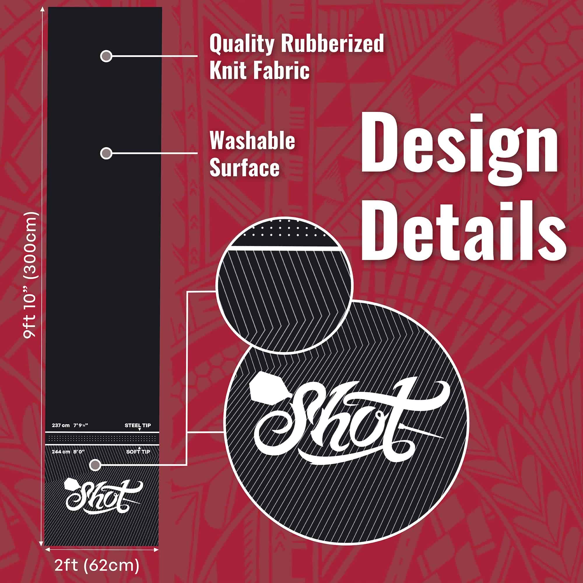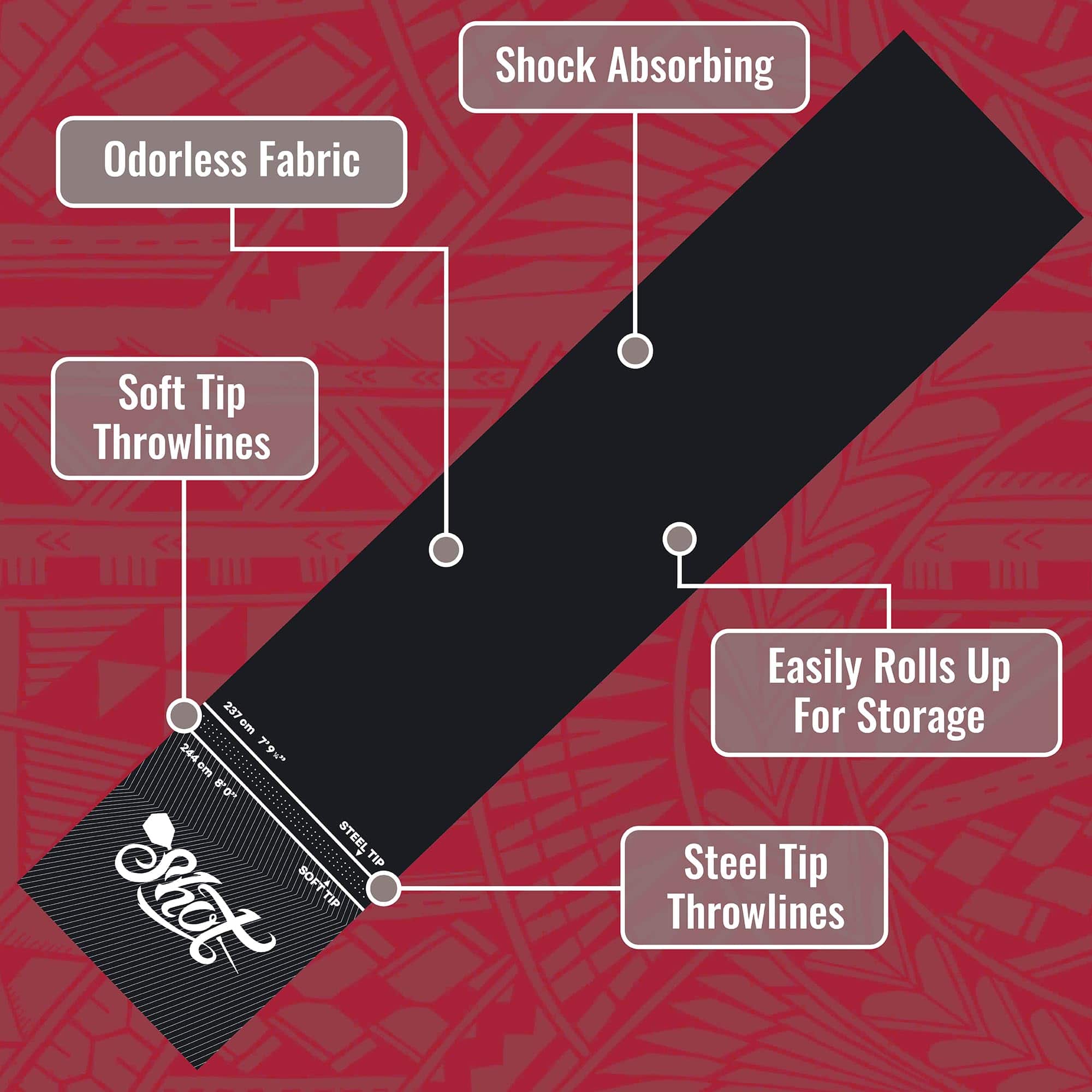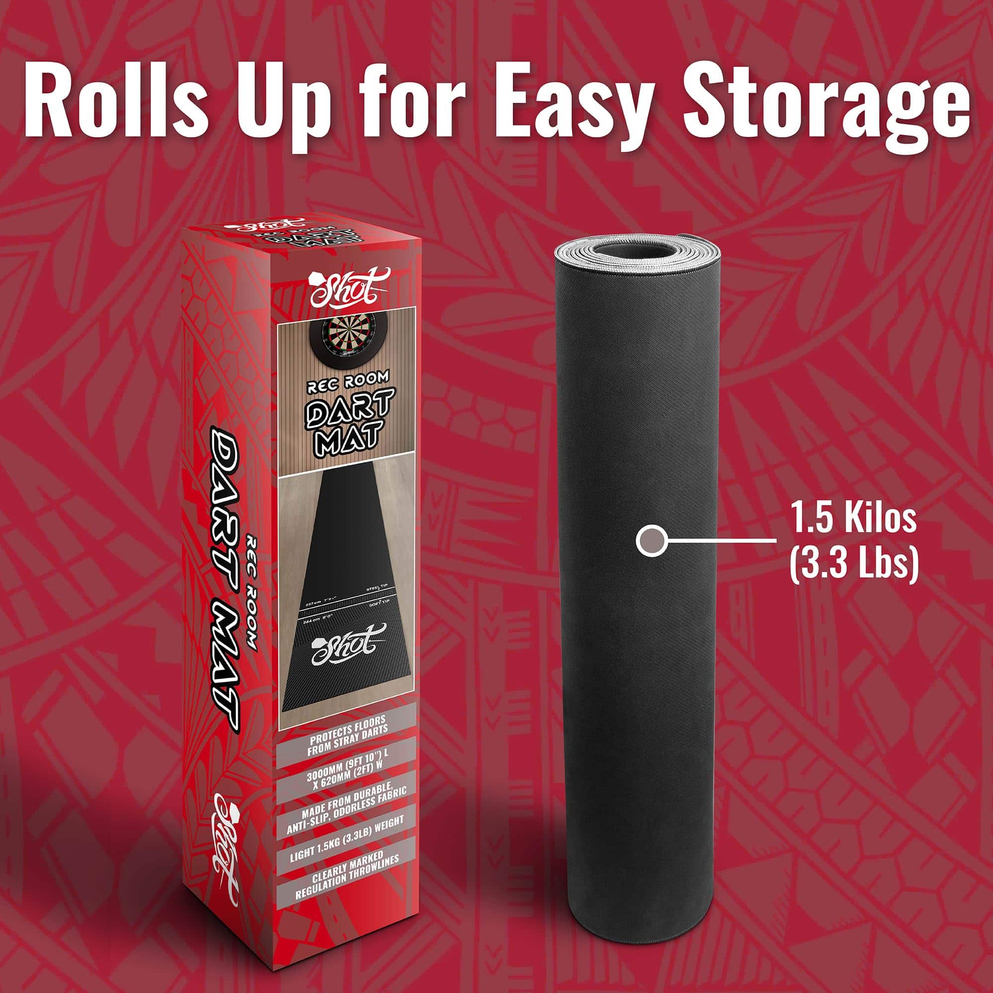 Use este tapete de dardos profesional y resistente para proteger su suelo de los dardos errantes. Con tan solo 6 libras de peso, el Tapete Shot Darts Rec Room no se moverá ni deslizará por el suelo y se mantendrá firmemente en su lugar. Protege dardos de punta de acero o de punta blanda, evite piezas rotas cuando los dardos rebotan fuera del tablero de dardos hacia el suelo. Con medidas de 9ft 9″ (2995mm) L x 2ft (625mm) W, el portátil Tapete de Dardos Shot no se riza en los extremos. ¡No se necesita ningún período de adaptación molesto! Úselo inmediatamente en el carril de dardos configurado en la cueva del hombre, sala de juegos o recámara. Protección adicional adecuada para todos los tipos de suelo para jugar con dardos de punta de acero y de punta blanda. Este tapete de goma para tablero de dardos amortigua y brinda comodidad bajo los pies juego tras juego, combate la fatiga y juega a tu mejor nivel. Su patrón con relieve antideslizante añade un alto nivel de tracción bajo los pies y mejora la seguridad personal durante el juego. Impresas con tintas industriales de larga duración, las líneas de tiro oficiales para dardos de punta blandos y dardos de punta de acero son fáciles de ver y leer. Las líneas de tiro con relieve le mostrarán dónde pararse. Obtenga una alineación adecuada, elimine la especulación de distancias y reduzca las faltas de pie. El Tapete de Dardos Shot de caucho sin complicaciones se puede enrollar fácilmente y guardar en cualquier gabinete o en un estante si es necesario. Los profesionales utilizan este tapete de dardos en torneos de dardos y en el uso comercial de bares de dardos. Se puede utilizar y disfrutar en la sala de juegos en casa u oficina, en sesiones de práctica o con juegos con amigos. Los tapetes de dardos son un regalo perfecto y añaden un aspecto profesional y terminado a cualquier carril de dardos instalado en casa.