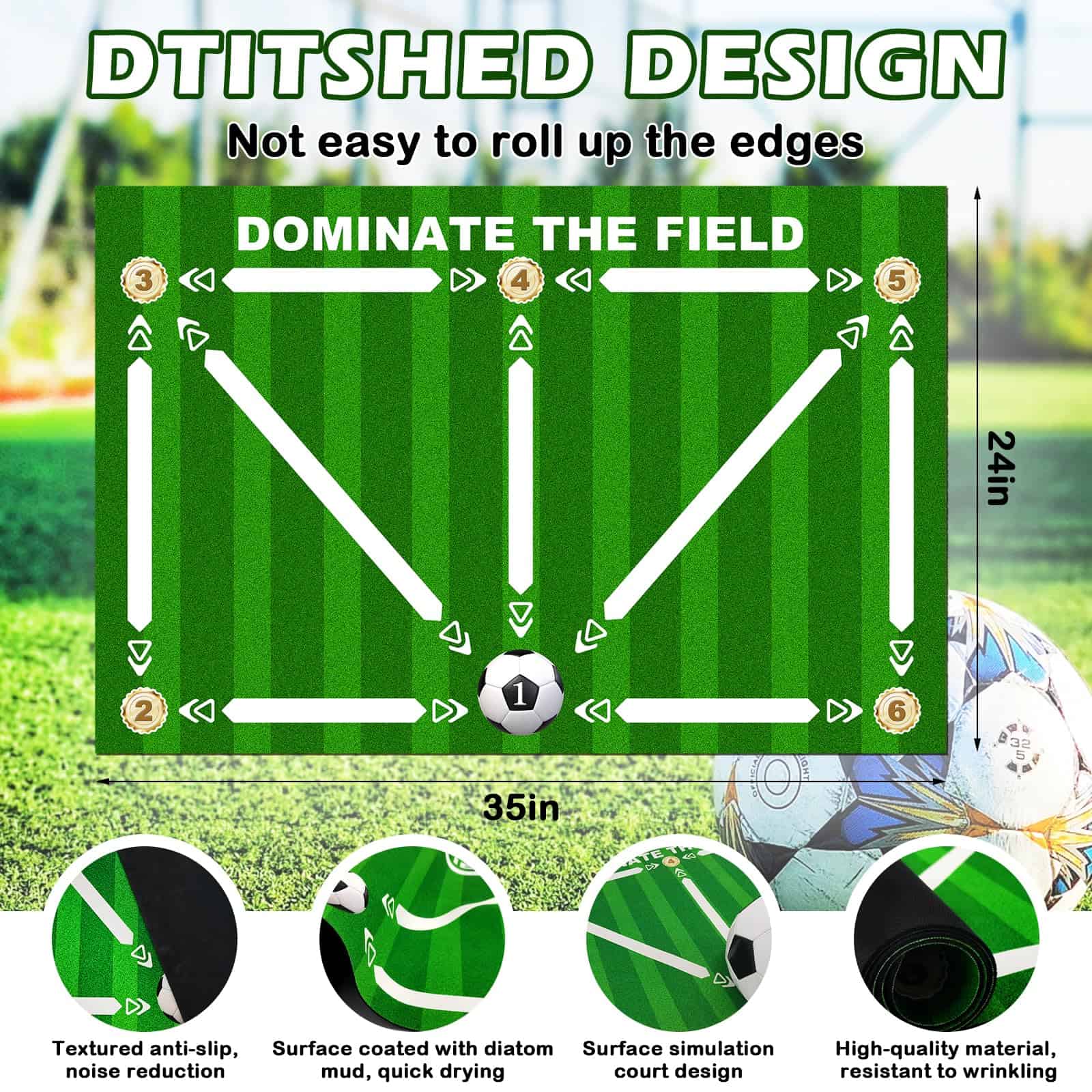 1. ¡Asistente de Entrenamiento de Fútbol Perfecto: Mejora tus habilidades de fútbol con el Tapete de Entrenamiento de Fútbol! Diseñado para mejorar el control del balón, la agilidad y el trabajo de pies, este tapete de 35″x24″ cuenta con marcas claras para ejercicios precisos. Ideal para el entrenamiento con tapete de fútbol y equipo de entrenamiento de fútbol.