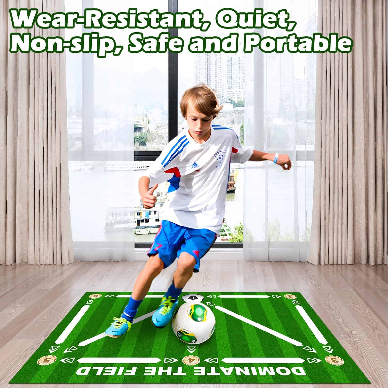 3. Diseño Duradero y Antideslizante: Fabricado con materiales de alta calidad, este tapete de fútbol es resistente al desgaste y fácil de limpiar. La base de goma antideslizante garantiza estabilidad y entrenamiento silencioso, lo que lo hace ideal para uso en interiores y exteriores.