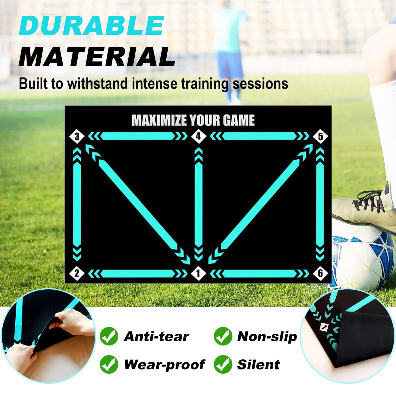 4. DURABILIDAD: Nuestro tapete de entrenamiento de fútbol Doskona está hecho de tierra de diatomeas, con una resistencia al desgaste excelente y fácil limpieza. La base de goma no solo asegura antideslizamiento, sino que también lo mantiene silencioso durante el entrenamiento sin molestar a los demás. Este diseño hace que el equipo de entrenamiento de fútbol sea adecuado tanto para uso individual como en equipo, brindándote compañía duradera y confiable.