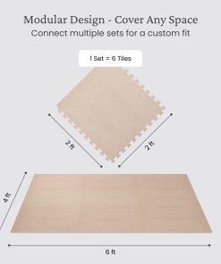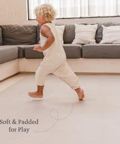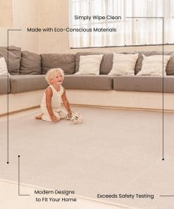 Con medidas personalizables, el paquete estándar incluye 6 módulos de 4 x 6 pies que puedes combinar para crear tu área de juego ideal. Su diseño con estilo se asemeja a una alfombra, complementando diversos estilos de diseño interior en espacios como salas de juegos, guarderías, salas familiares y salas de estar.