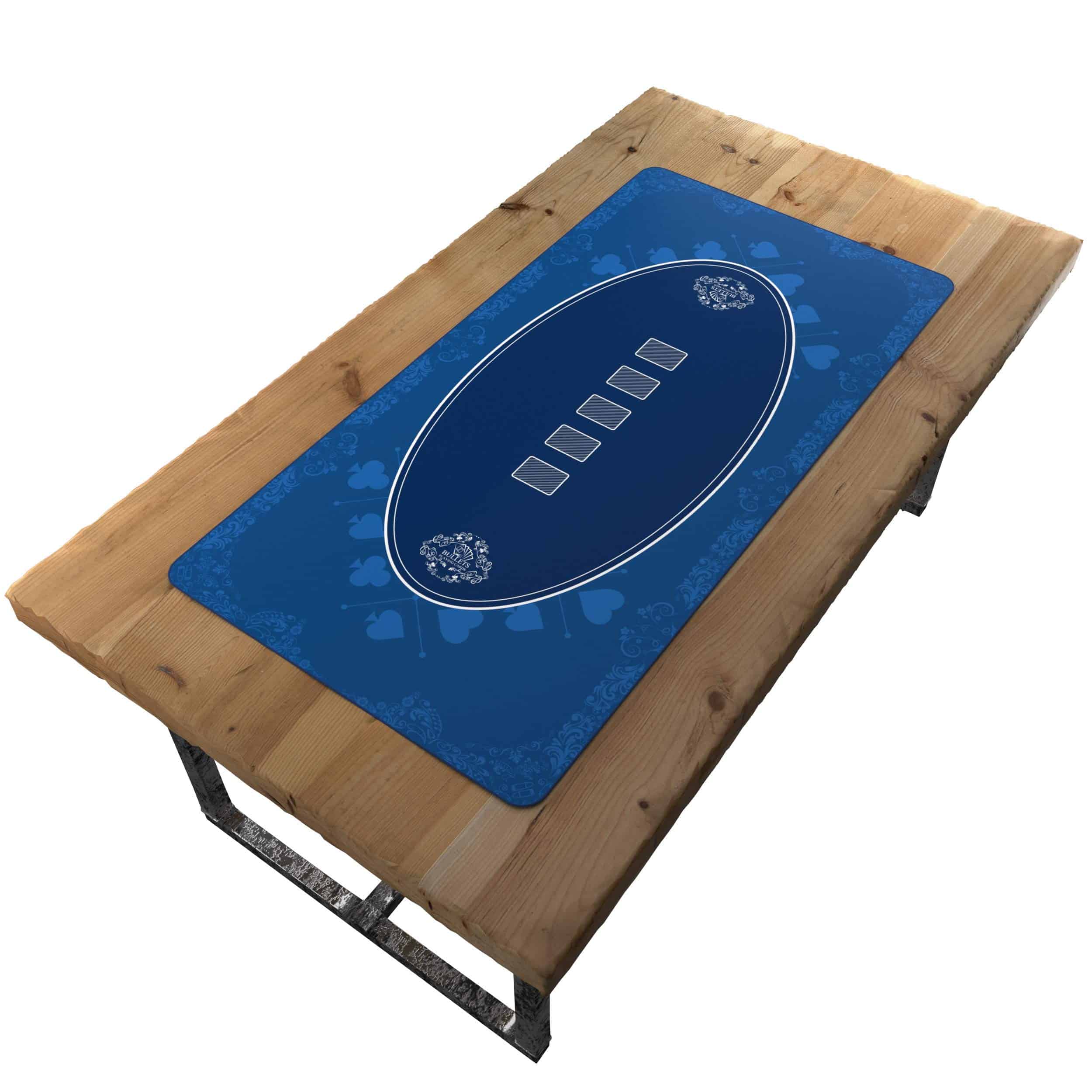 Perfecto para el poker Texas Holdem, los tapetes de poker Bullets han sido especialmente desarrollados para el poker Texas Holdem. Los cinco espacios en el medio del tapete están diseñados para adaptarse a las cartas de poker. La impresión por sublimación asegura que las cartas se deslicen suavemente sobre el tapete de mesa. Este diseño clásico proporciona un área para las fichas del jugador, así como un área para las cartas comunitarias y las apuestas. Este diseño clásico está basado en mesas de poker de casinos internacionales. Los tapetes de poker de Bullets Playing Cards están disponibles en verde, negro, azul y rojo. ¡Jugar al poker nunca ha sido tan bueno! Extremadamente robusto y duradero Los inconvenientes de los tapetes de fieltro convencionales son bien conocidos: el material se vuelve peludo y arruga, y el tapete se desliza fácilmente sobre la mesa, impidiendo que tengas una experiencia de juego real. Con los tapetes de poker de Bullets, esto ya no es un problema, gracias a su superficie libre de pelusa y a su propio peso, que hace que se coloquen completamente planos sobre la mesa una vez desplegados. La parte inferior de goma evita el deslizamiento. Los tops de mesa de Bullets también se caracterizan por ser extremadamente resistentes. El material es resistente al agua y el tapete se puede enrollar fácilmente y guardar. ¡Tapetes de poker de Bullets – esa sensación de casino en tu mesa!