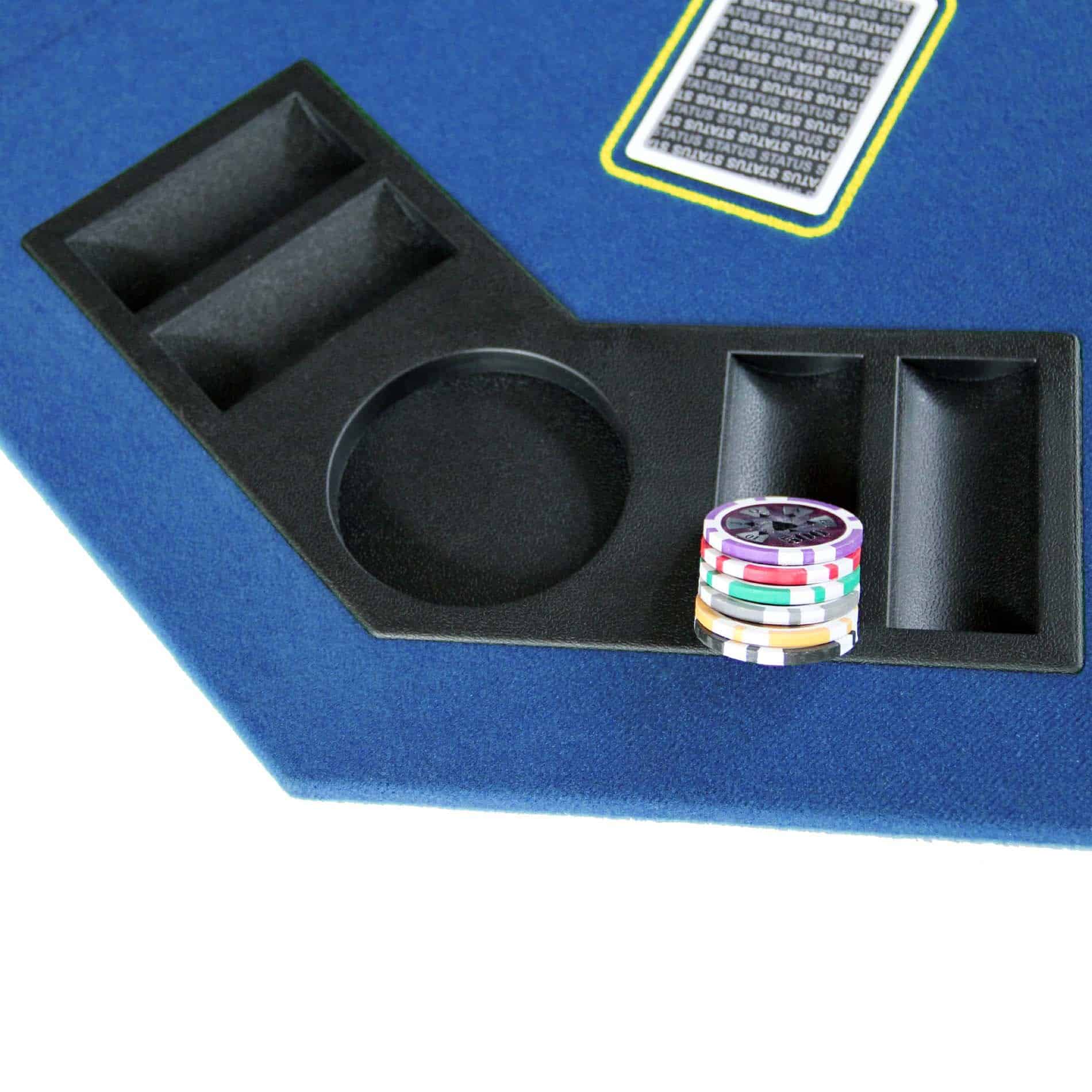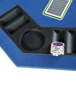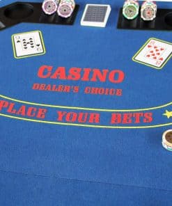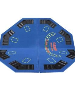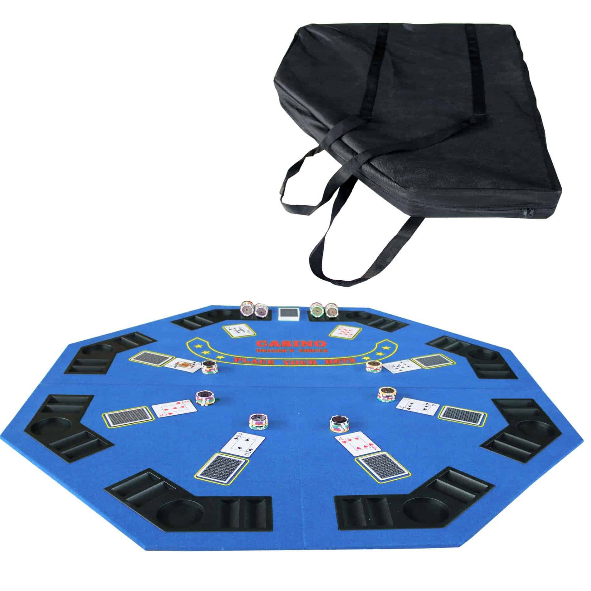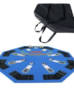 Tapete de Juego de Casino Plegable Octagonal de 48 pulgadas con Superficie de Fieltro Suave Azul. Incorpora Portavasos y Soportes para Fichas para hasta 8 Jugadores. Conveniente de Transportar y Fácil de Almacenar gracias a su Diseño Plegable, Incluye un Estuche Negro con Cremallera de Vinilo. Ideal para Noches Familiares, Fiestas y Reuniones. ¡Comparte la diversión con tus familiares y amigos! No dudes en comprar uno. Dimensiones de la Mesa: 48 x 48 pulgadas. Peso: 16 lb. Dimensiones del Paquete: 25.3 x 24 x 3 pulgadas. Color: Azul (Otros Colores Disponibles: Verde y Negro).