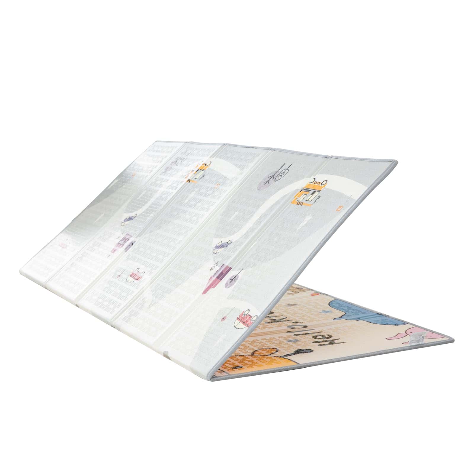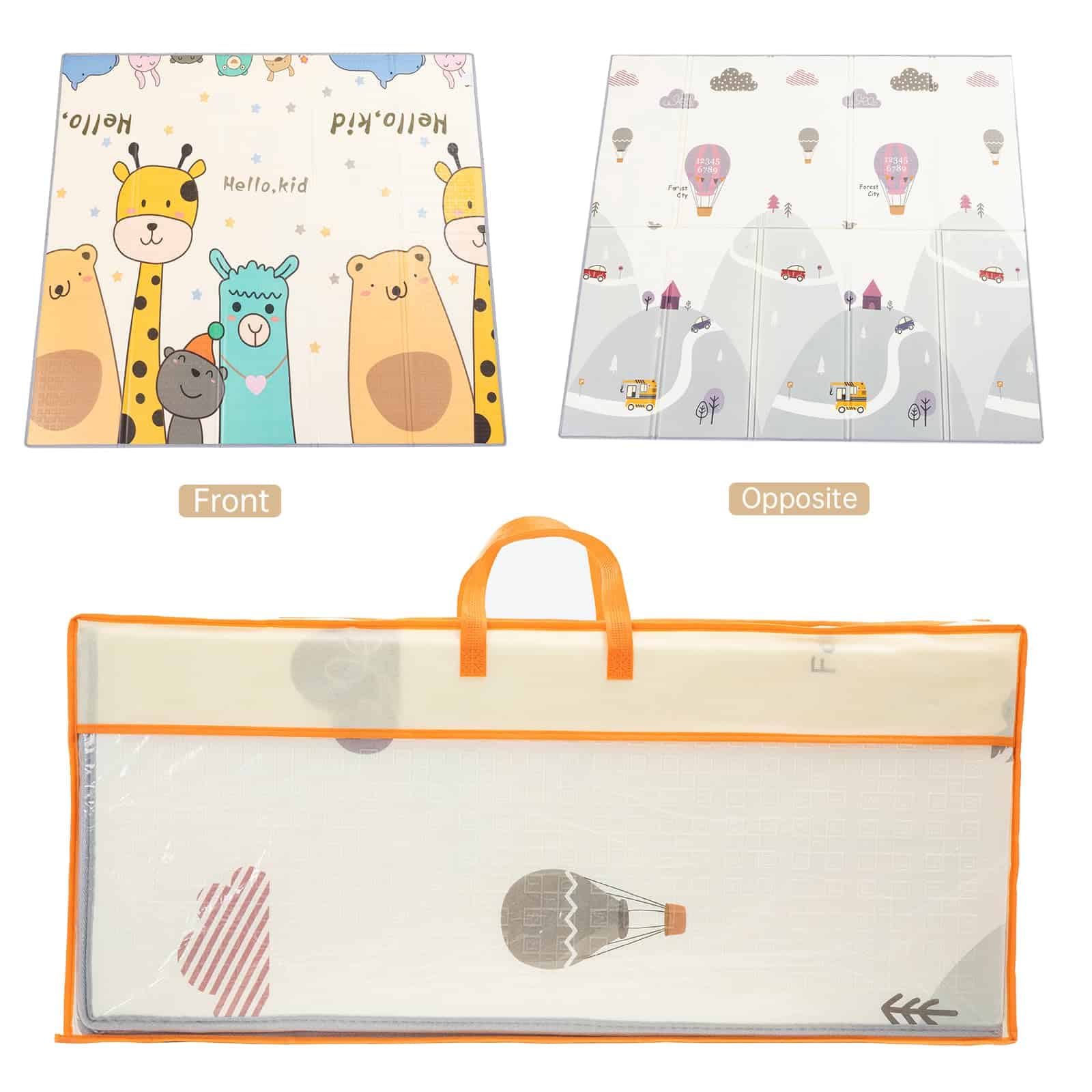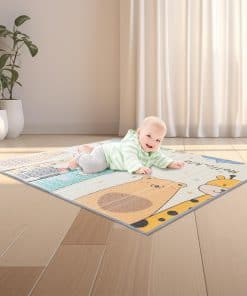 4. Diseño de Doble Cara: Tapete reversible con patrones contrastantes en cada lado – uno con lindos personajes animales y el otro representando una escena urbana caprichosa.