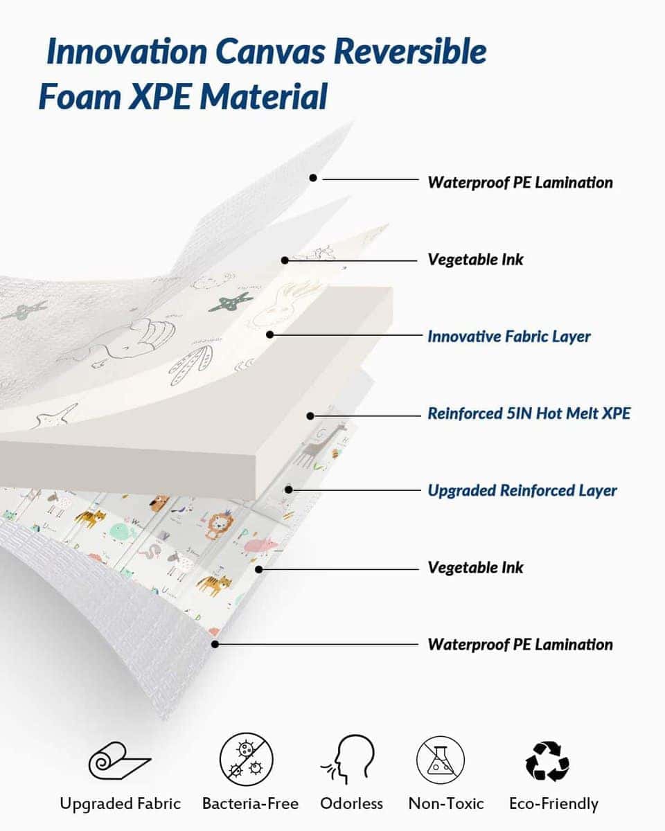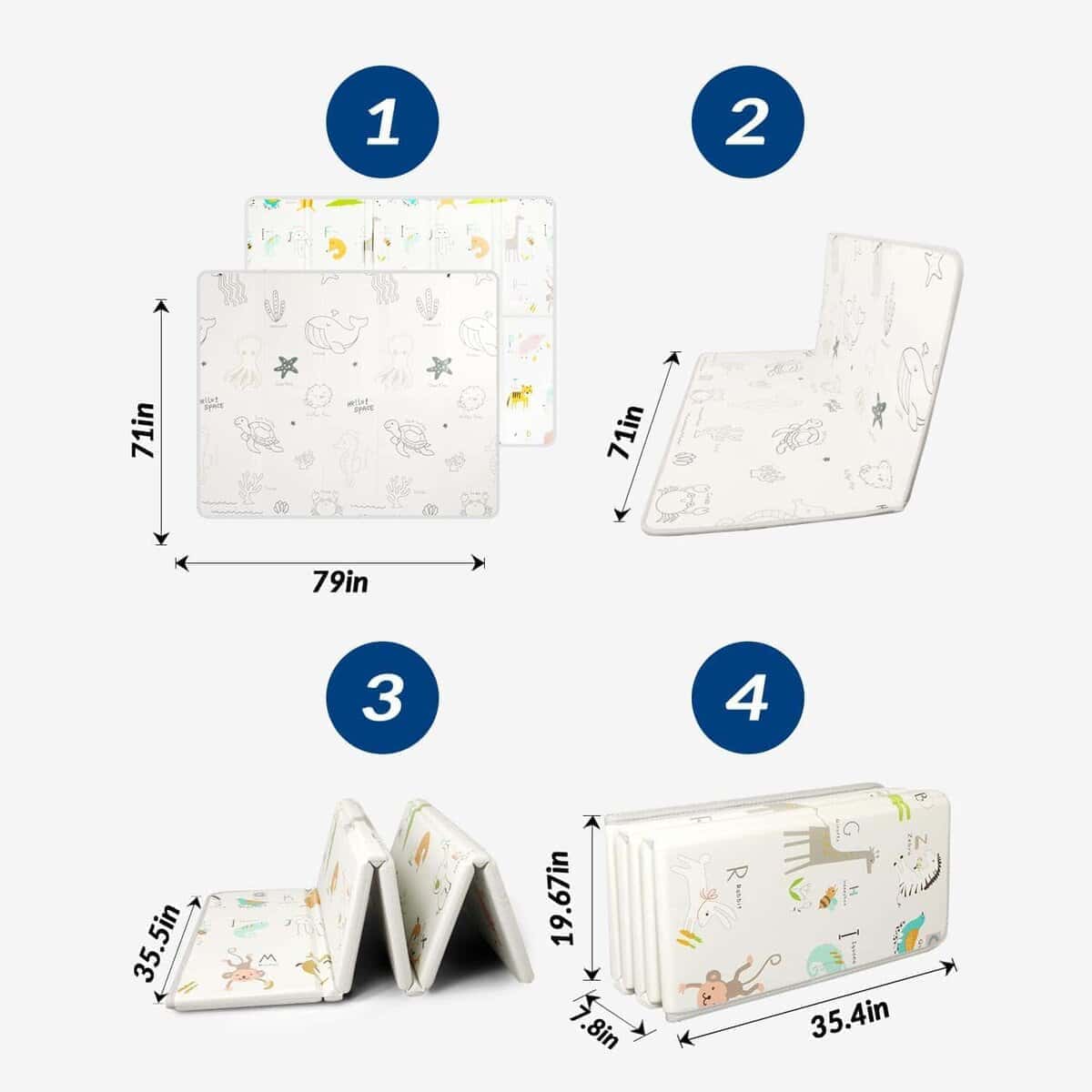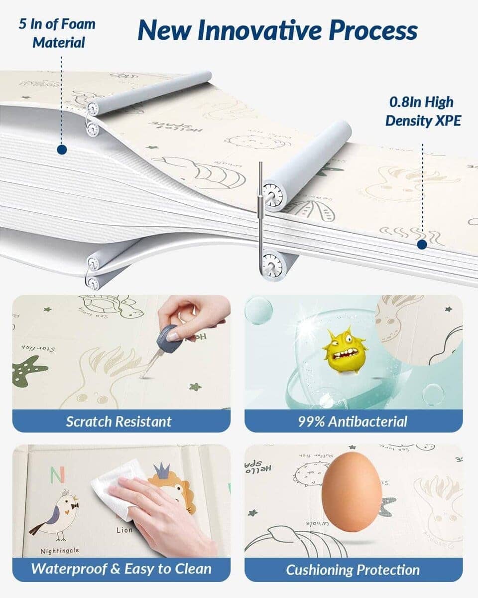 1. Detalles de Tamaño y Protección – Este tapete de juego para bebé mide aproximadamente 79 pulgadas de largo y 71 pulgadas de ancho, el tapete de gateo extra grande también proporciona un amplio espacio para los padres, permitiendo que los padres y los bebés pasen felizmente tiempo de unión juntos. Su espesor de 0.8 pulgadas proporciona un excelente amortiguamiento para proteger al bebé de suelos duros, la textura antideslizante garantiza la seguridad del bebé al aprender a caminar. 2. Impermeable y Fácil de Limpiar – La superficie del tapete de espuma de juego es 100% resistente al agua, protege el color del patrón para que no se despegue. La superficie lisa es fácil de limpiar; solo pasando un paño húmedo se elimina la suciedad, manteniendo un área de juego higiénica para su pequeño. 3. Material de Alta Calidad – Hecho de material de espuma XPE segura, el espesor adicional ofrece un amortiguamiento excepcional y absorción de impactos para garantizar la seguridad del bebé durante el tiempo de juego, lo que lo hace ideal para gatear, rodar y jugar. 4. Plegable y Portátil – La conveniencia se une a la practicidad con nuestro diseño plegable. El tapete puede plegarse fácilmente, lo que lo hace compacto para almacenar. Su portabilidad se ve mejorada por la bolsa de almacenamiento incluida, lo que permite un transporte y almacenamiento sin esfuerzo. Ya sea para citas de juego, siestas o salidas familiares, este grueso tapete de juego para bebé es el compañero perfecto. 5. El Mejor Regalo – El grueso tapete de juego para bebé es el regalo perfecto para su bebé en cumpleaños, Navidad y Año Nuevo. Nuestra tienda tiene servicio las 24 horas, cuando reciba el producto, si tiene algún problema, puede contactarnos directamente, le daremos una solución lo más pronto posible. 6. Tapete de Juego Acolchado de 0.8 Pulgadas de Espesor para Bebé – Este tapete de juego impermeable está hecho de una almohadilla de espuma de 5 pulgadas comprimida, por lo que el grosor de 0.8 pulgadas es suficiente para amortiguar cuando el niño se cae, sin tener que poner una manta debajo.