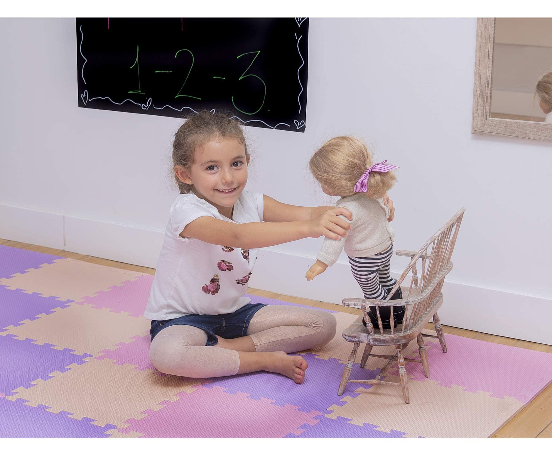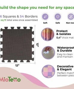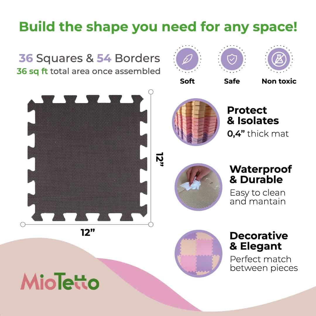 Para nosotros, no hay nada más importante que saber que tu hijo es feliz, seguro y sonriente. Utilizando nuevas técnicas de fabricación y materiales certificados, hemos diseñado un accesorio práctico que permite a tus hijos jugar libremente sin que tengas que preocuparte por golpes, caídas, arañazos, polvo o desechos: ¡el increíble tapete de juego de espuma de rompecabezas! Es súper fácil de armar y puedes personalizar el tamaño, la forma y los colores para obtener más versatilidad y estilo. ¿Por qué este producto es para ti? El tapete de juego de rompecabezas premium para niños de MioTetto no puede faltar en la guardería o sala de juegos de tu niño. Es suave, duradero y colorido, por lo que tus hijos querrán pasar mucho tiempo jugando, leyendo y aprendiendo. Las piezas del rompecabezas están hechas de espuma EVA que es súper cómoda y suave pero también confiable y resistente. Nuestras piezas de tapete vienen en tonos pasteles chic de colores perfectamente combinados que puedes mezclar y combinar para un efecto elegante. Algunas de las características increíbles de este producto: – Tapete de juego cómodo y suave para bebés y niños pequeños – Fácil de armar – El conjunto incluye bordes adicionales – Tonos elegantes – Hecho de espuma EVA de alta densidad – Grosor: 0.4 pulgadas – Tamaño de baldosa: 12 x 12 pulgadas – No contiene BPA, plomo ni ftalatos – Crea un ambiente seguro y suave para los niños – Fácil de limpiar; Material impermeable – Superficie antideslizante. La colección de MioTetto incluye dos opciones: conjunto de 16 piezas con 32 bordes (16 pies cuadrados) y conjunto de 36 piezas con 72 bordes (36 pies cuadrados). ¡Crea un ambiente cómodo para tu pequeño ángel con el tapete de juego de rompecabezas de MioTetto!